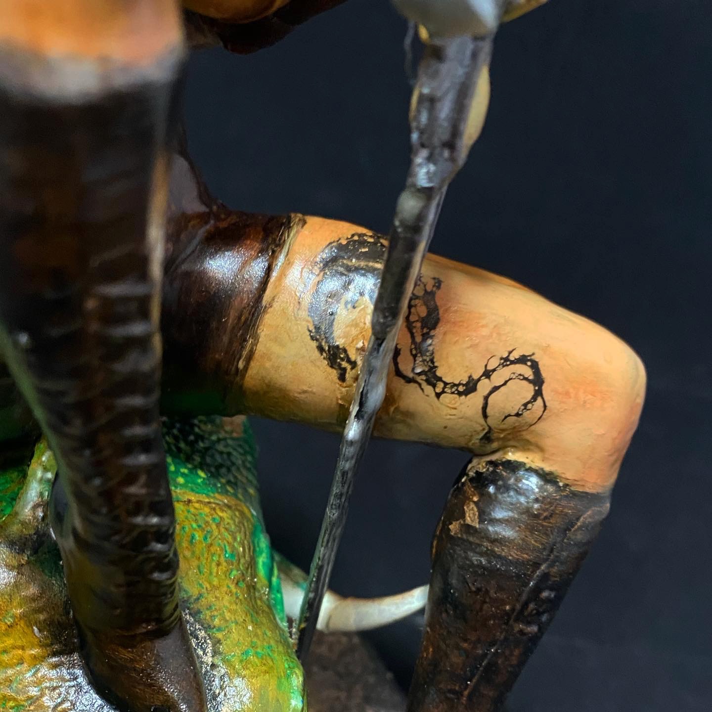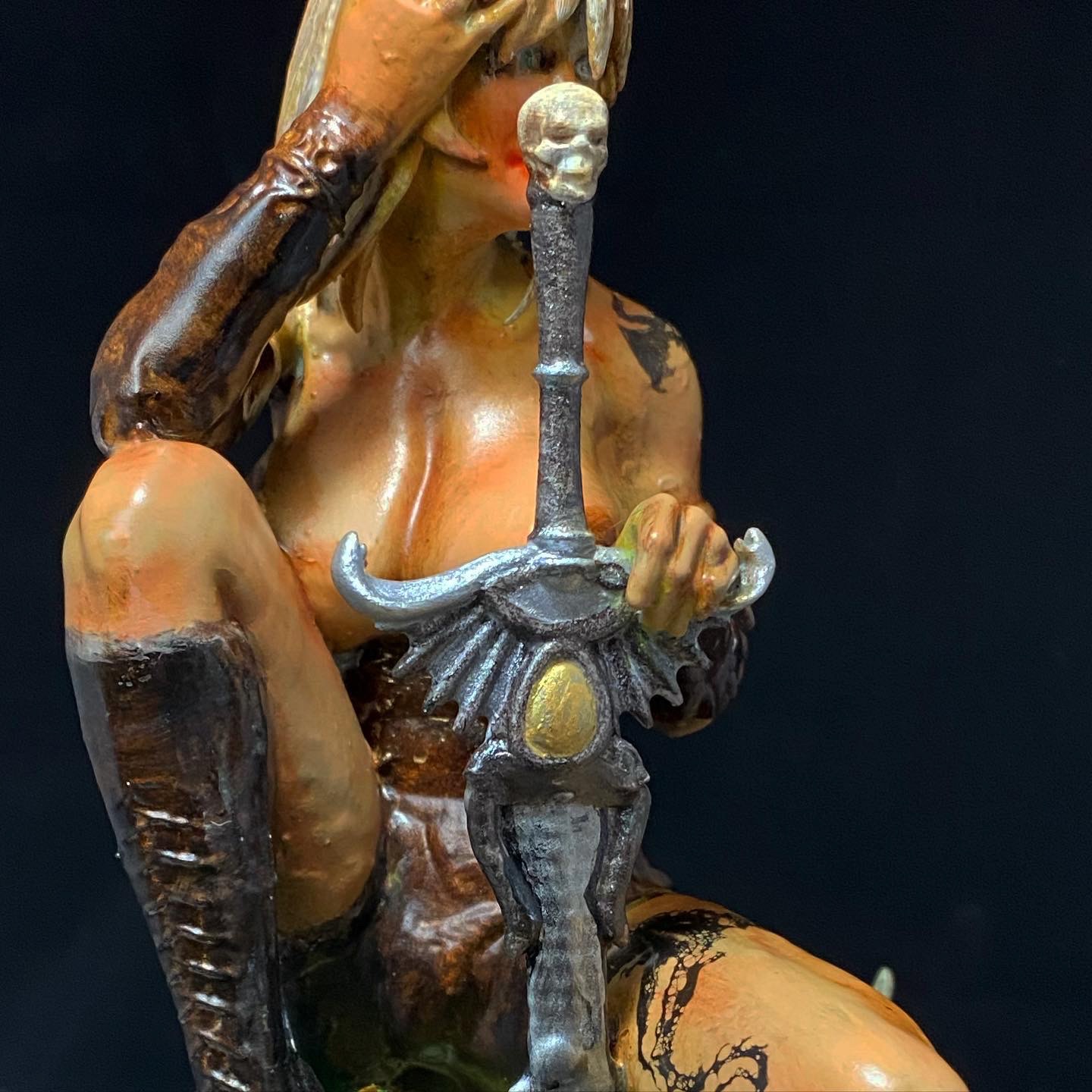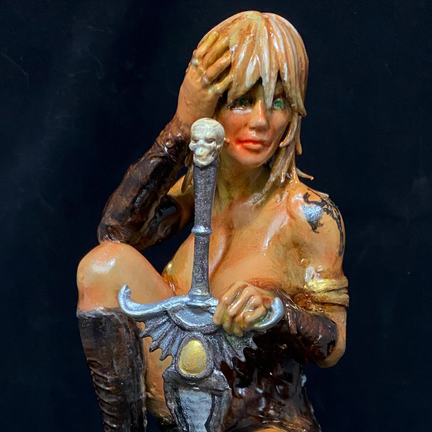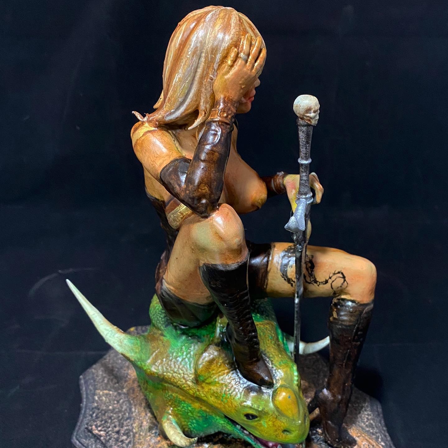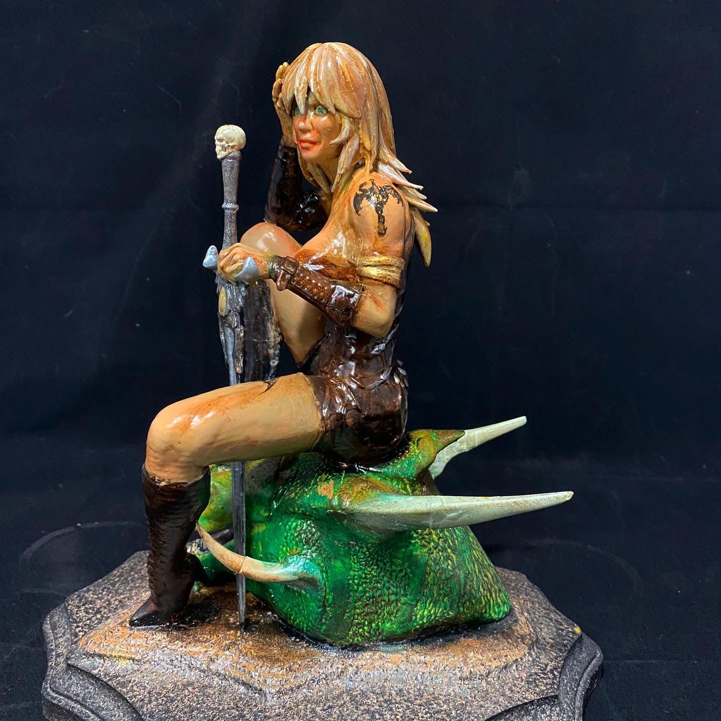 This is a sculpt from my friend Walades, of a female dragon hunter, sitting atop her latest prize. This was one of my earliest pieces where I added water-slide decals to adorn her with tribal tattoos.