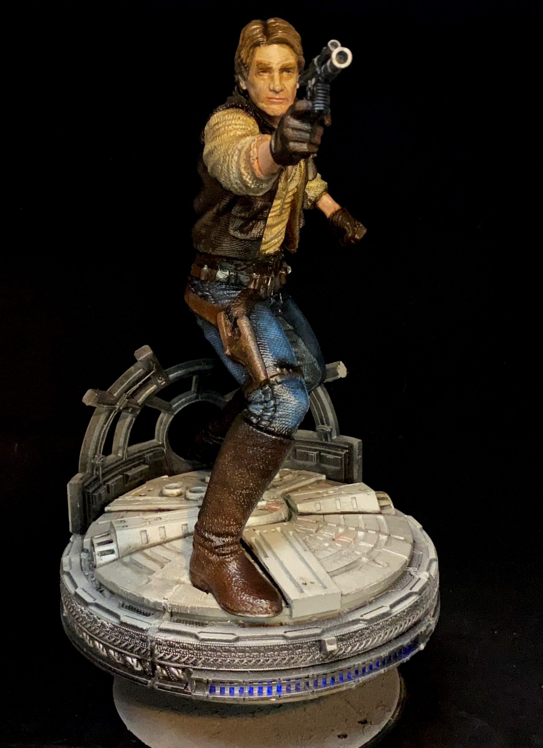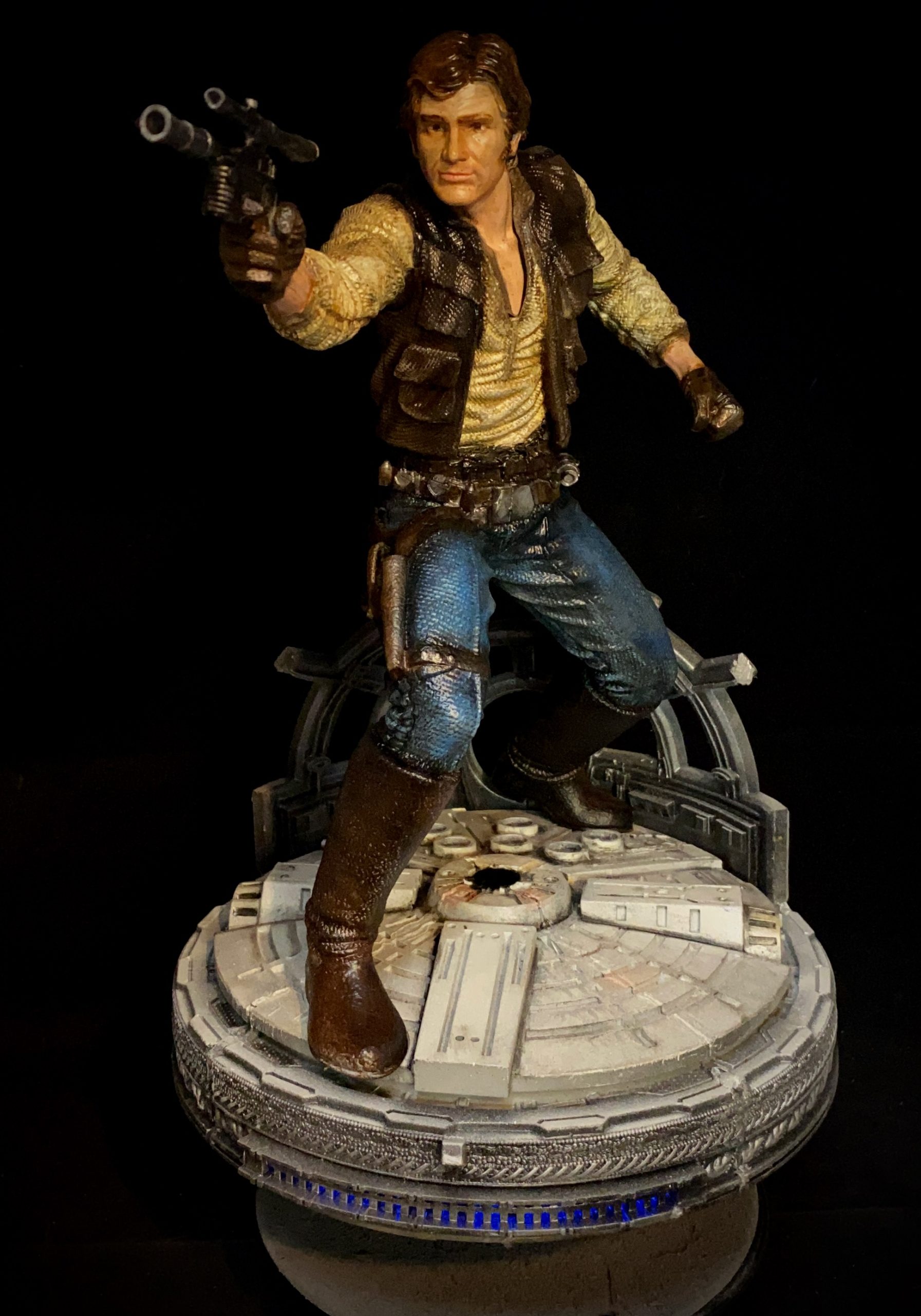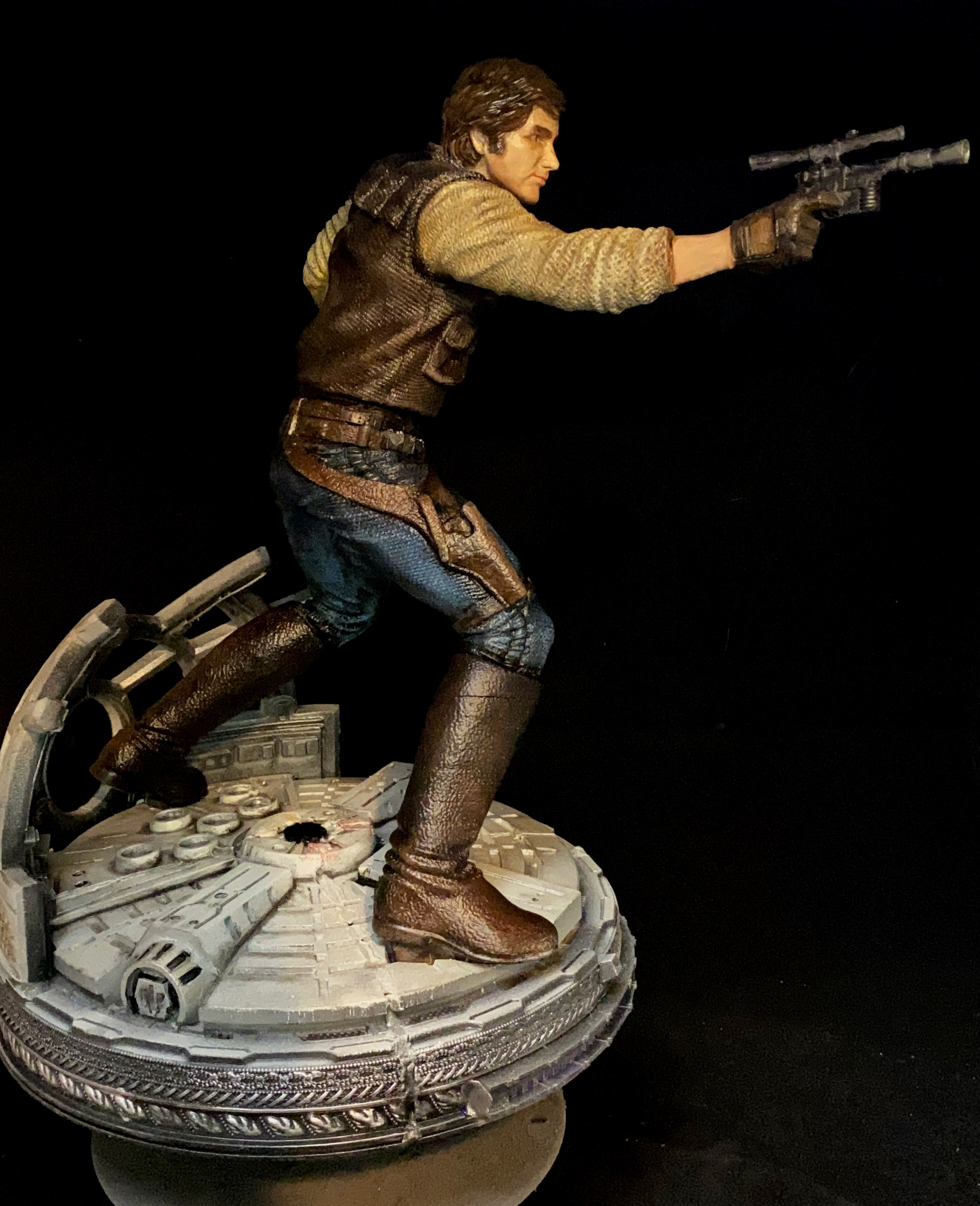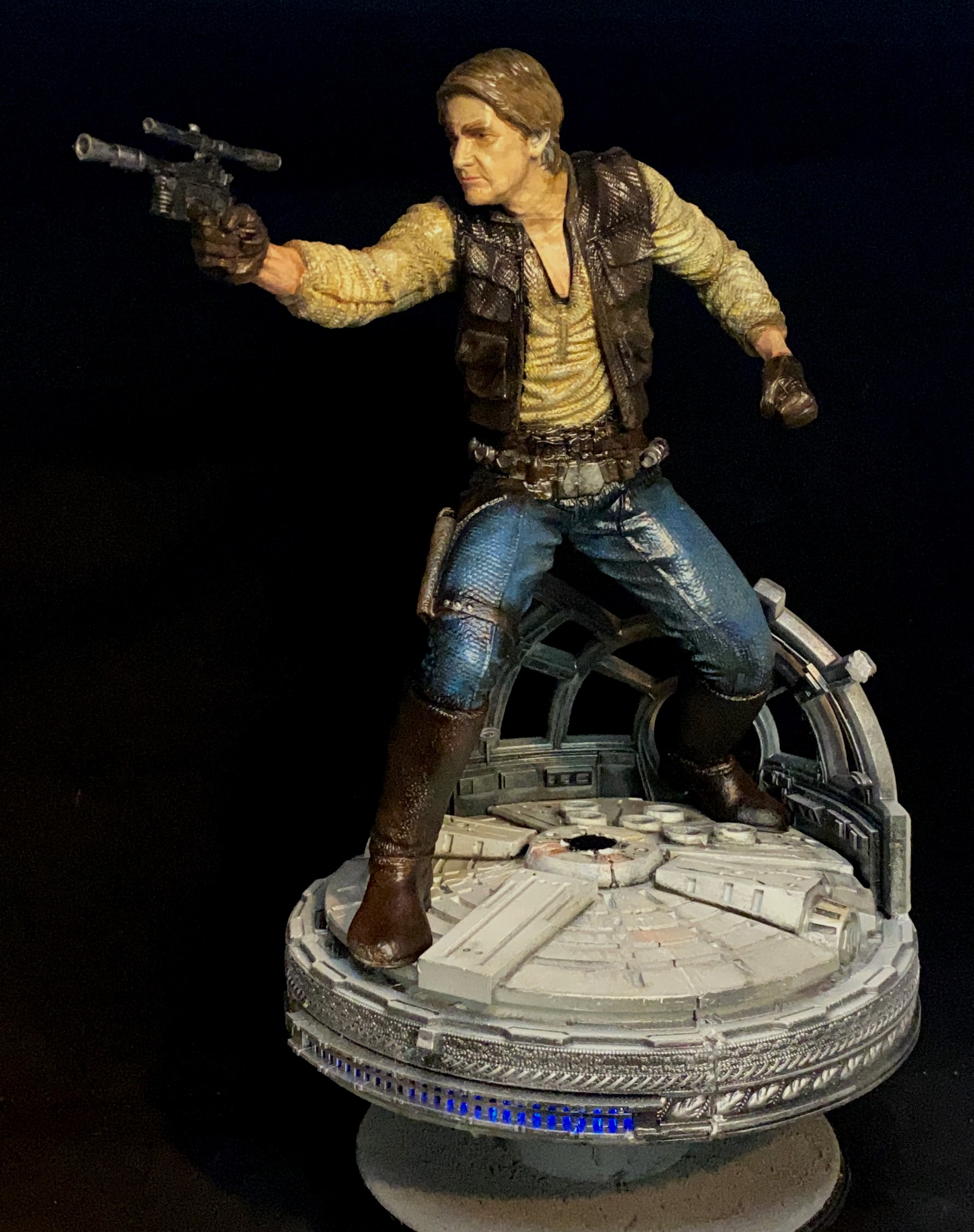 This piece is from the Star Wars arm of the Wicked design team. It features swappable heads (young and old Han), as well as an LED lit base.