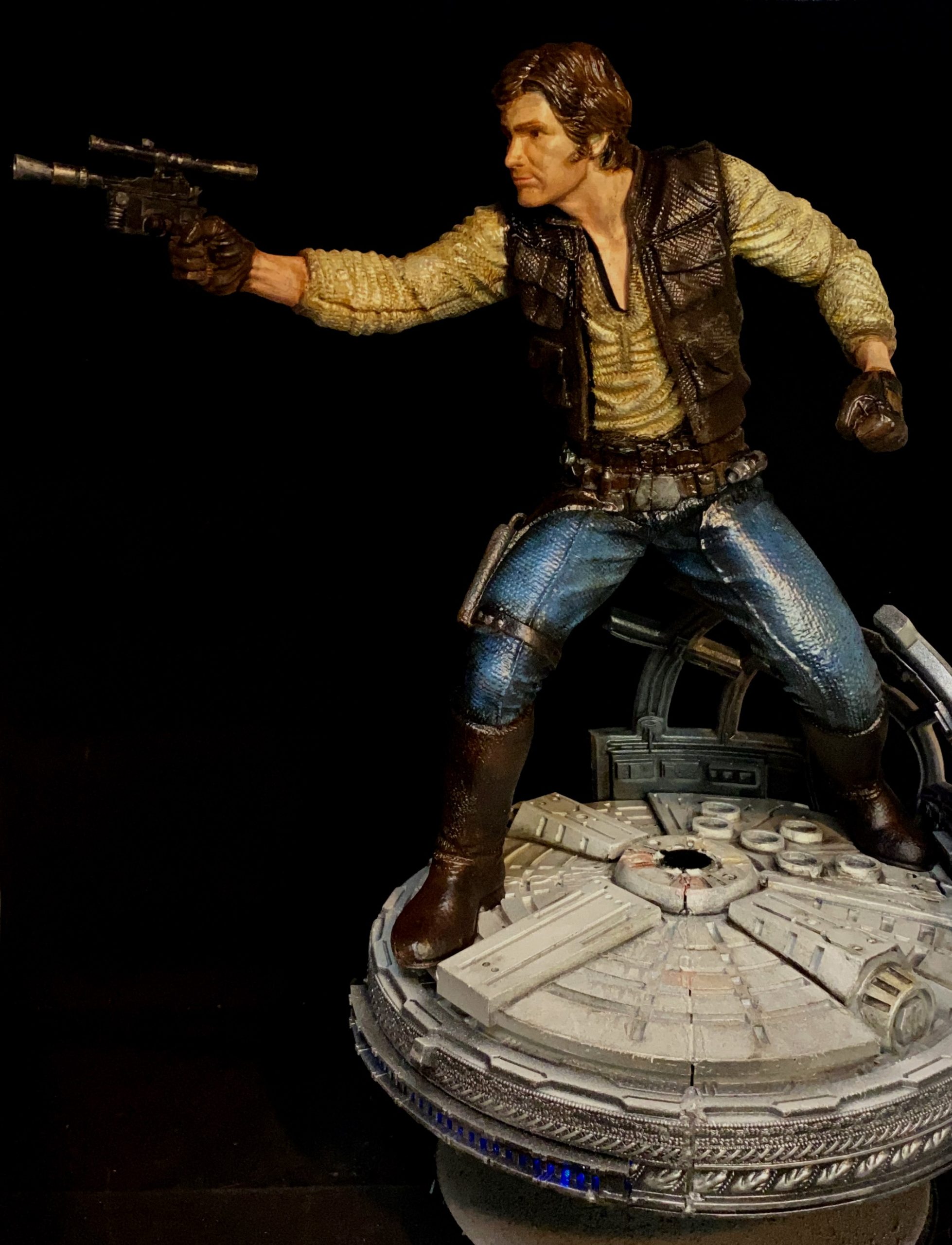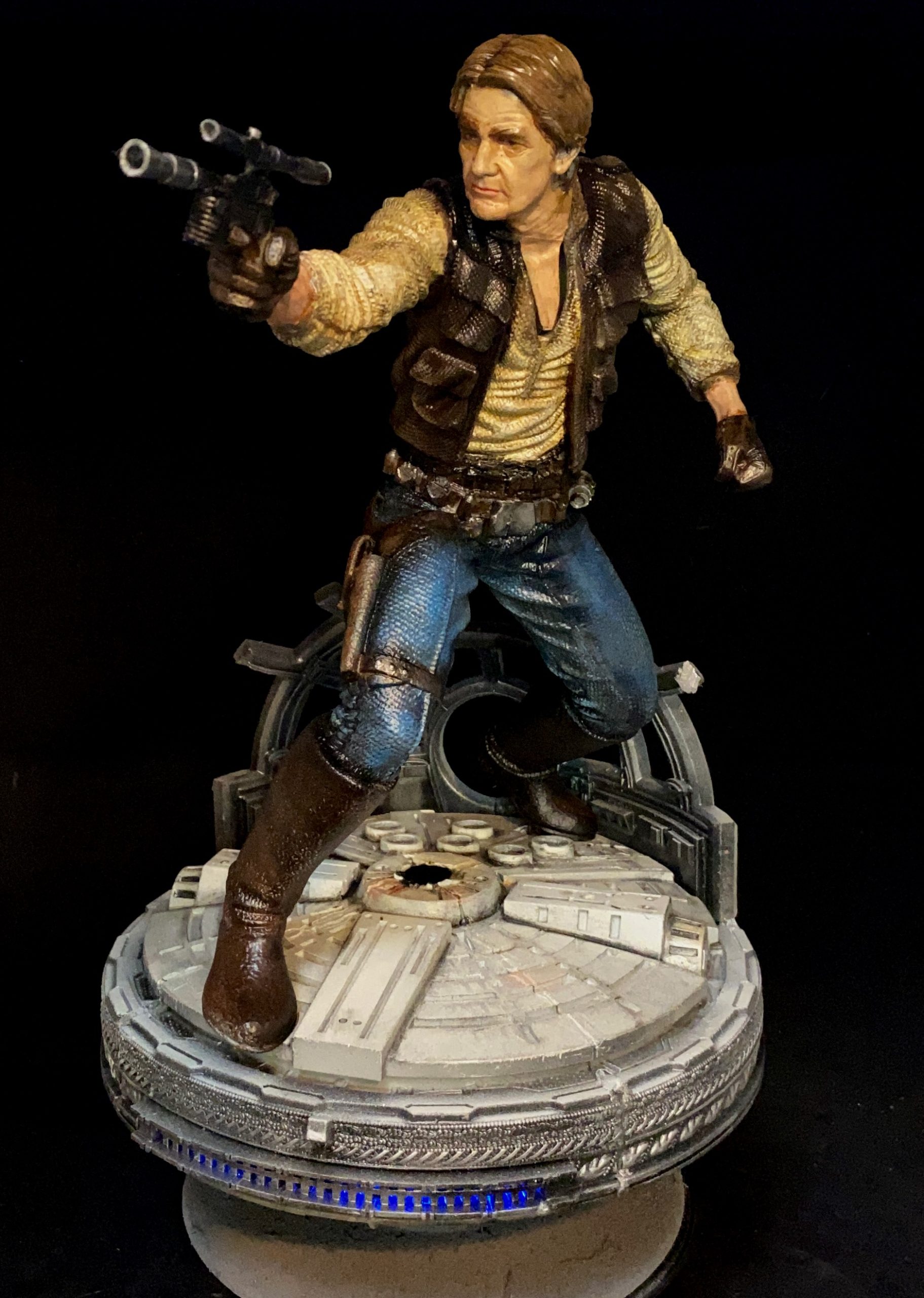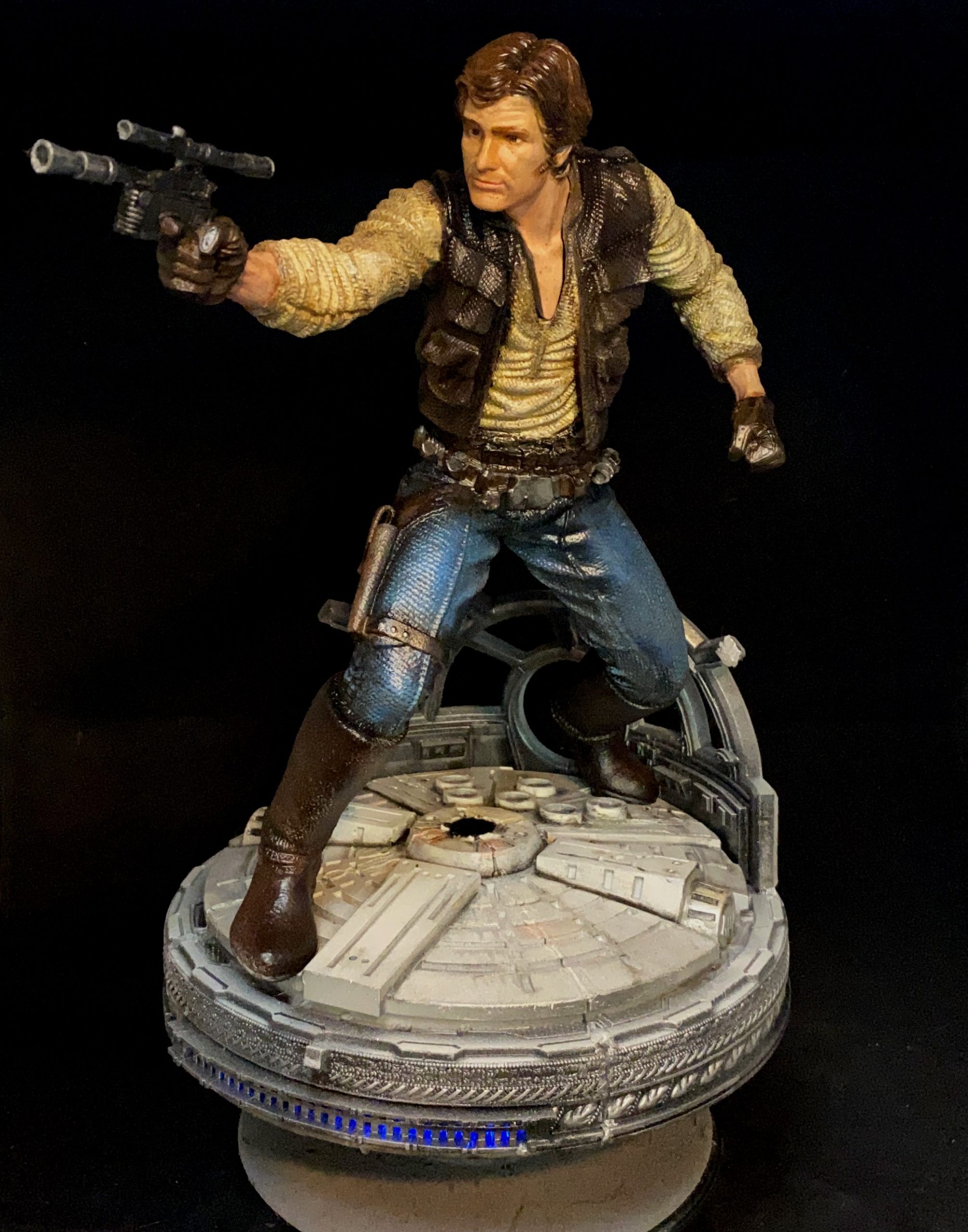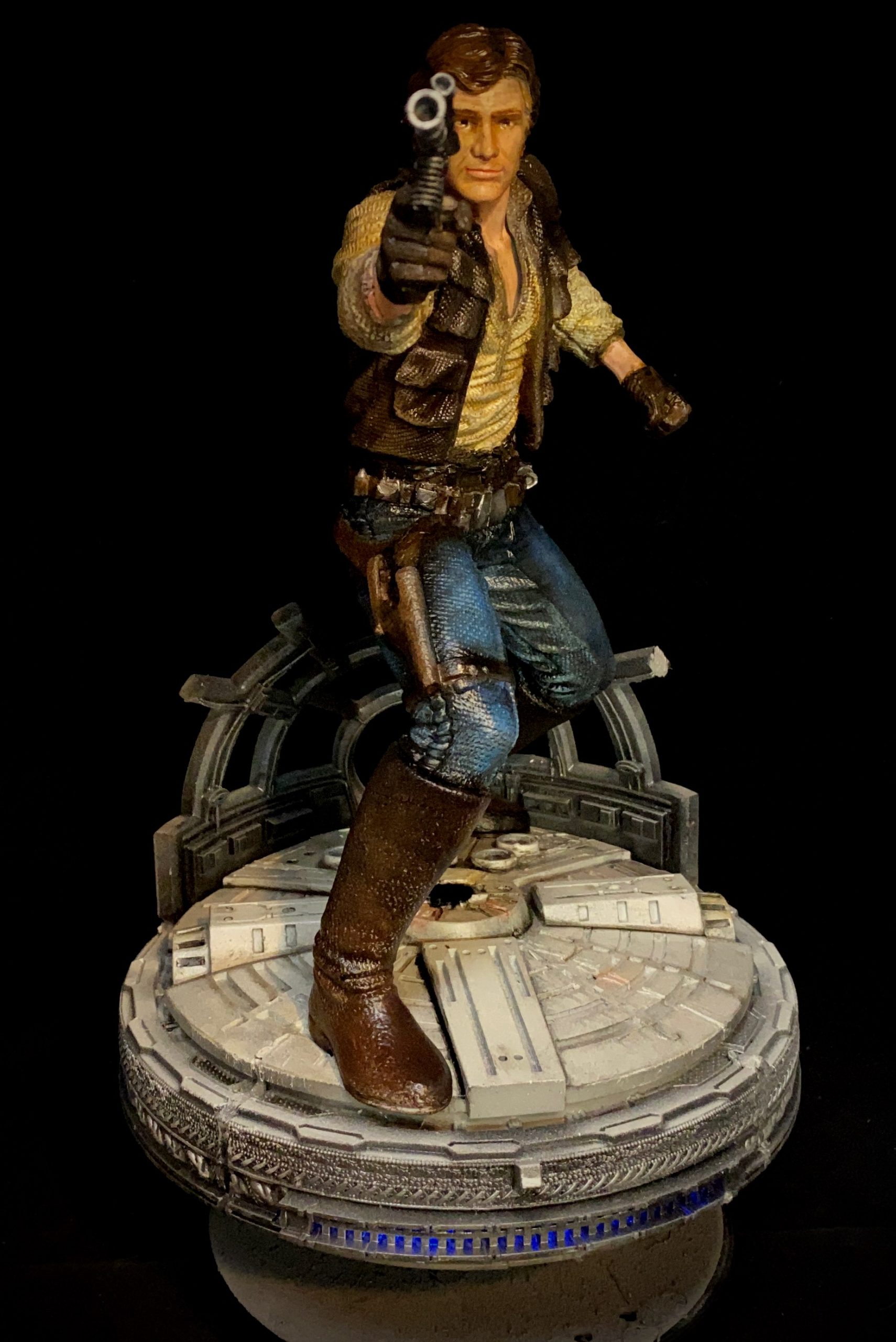 This piece is from the Star Wars arm of the Wicked design team. It features swappable heads (young and old Han), as well as an LED lit base.