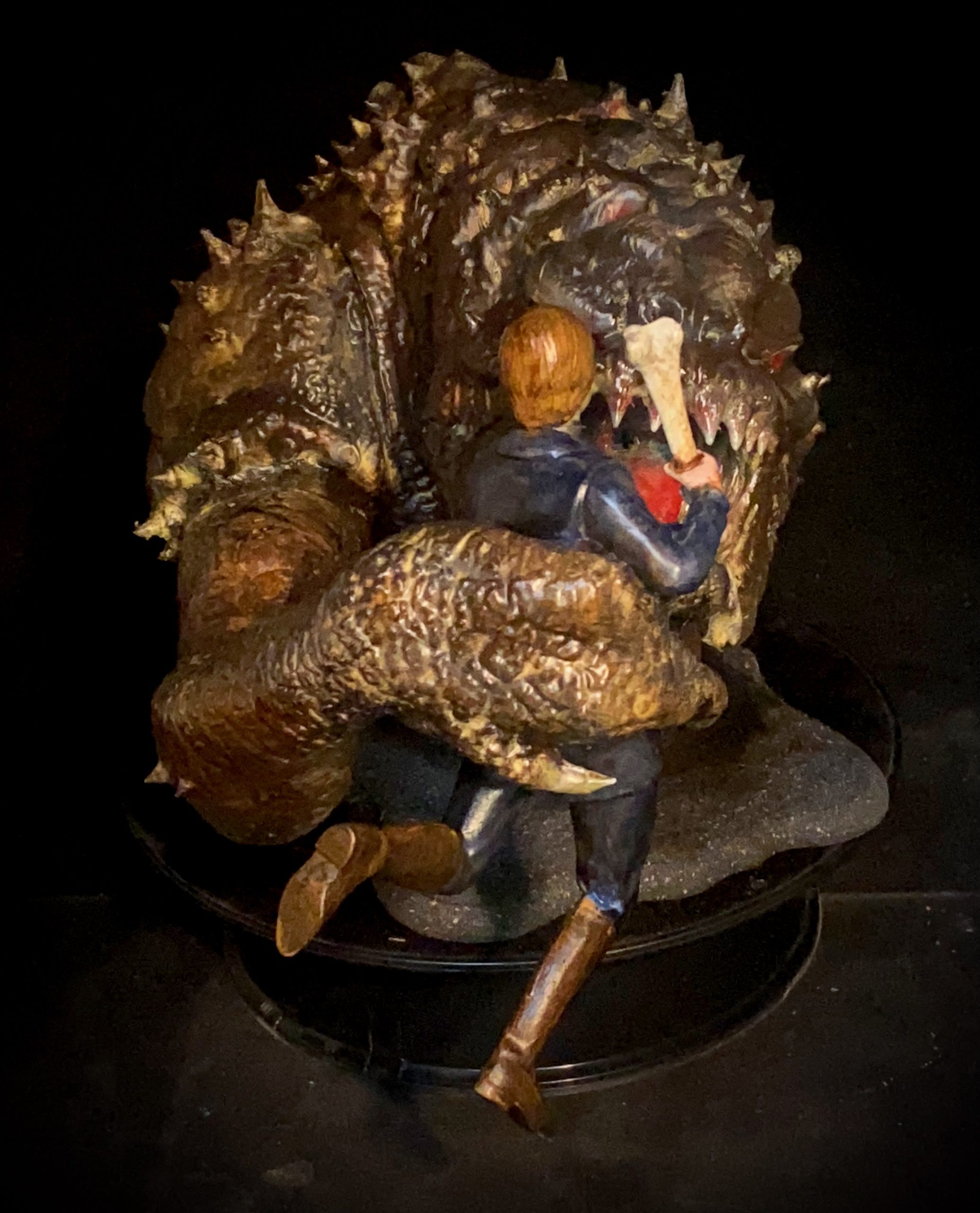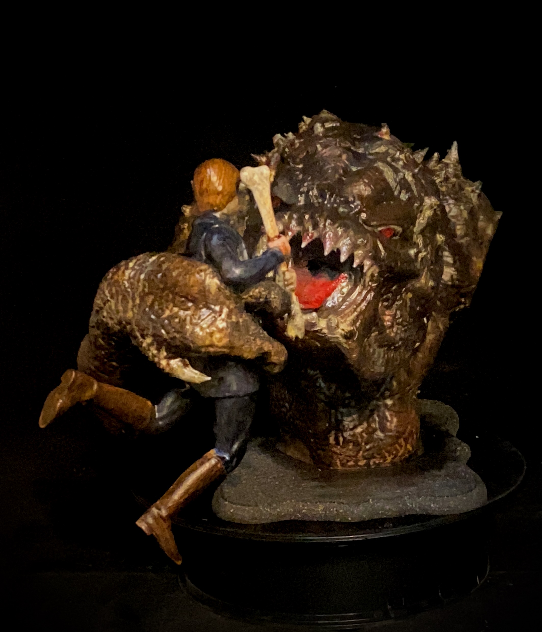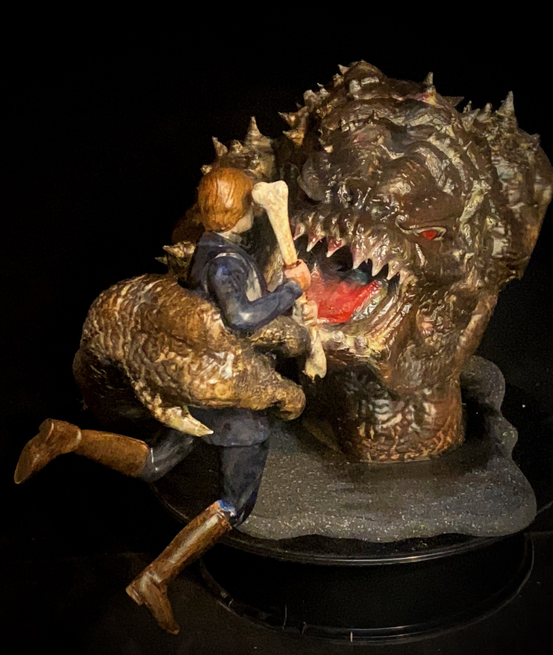 This is a reproduction of the iconic scene from the original Star Wars trilogy, where Luke is facing the beast and readying his only weapon… a bone.