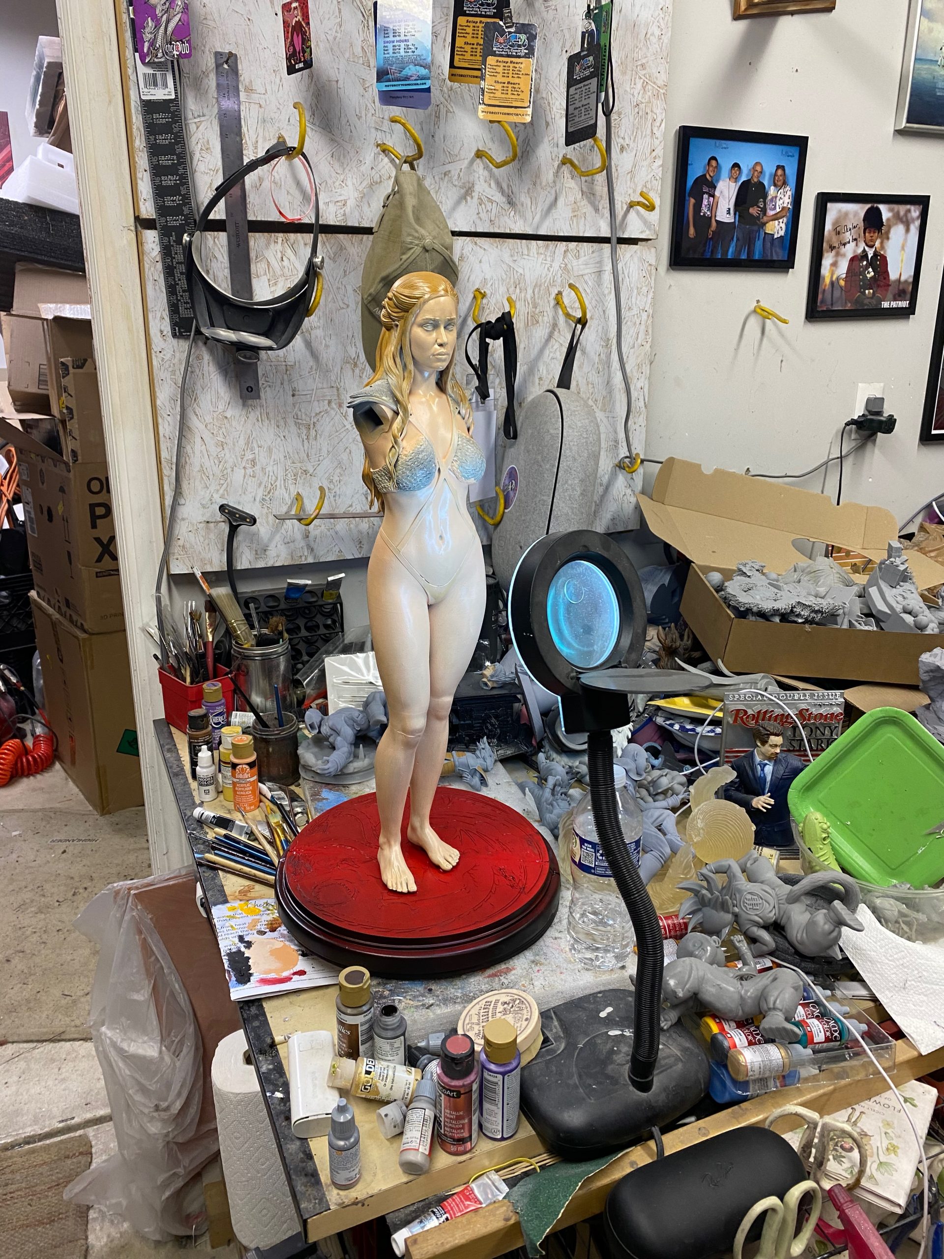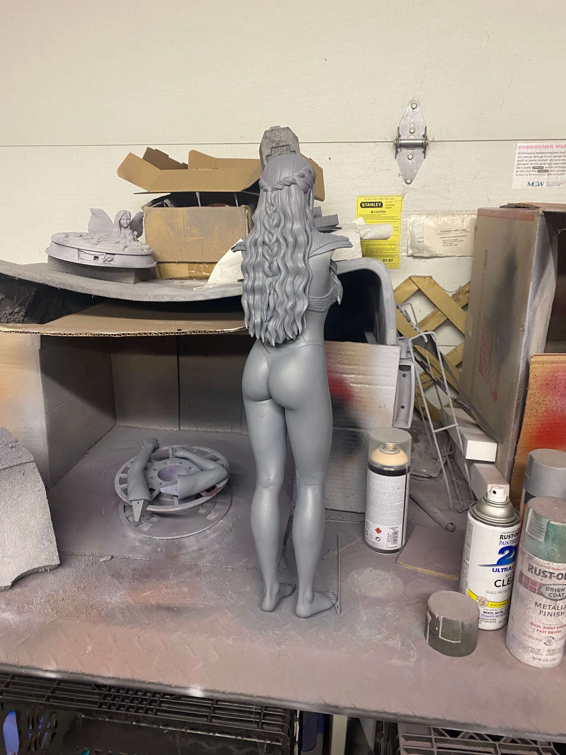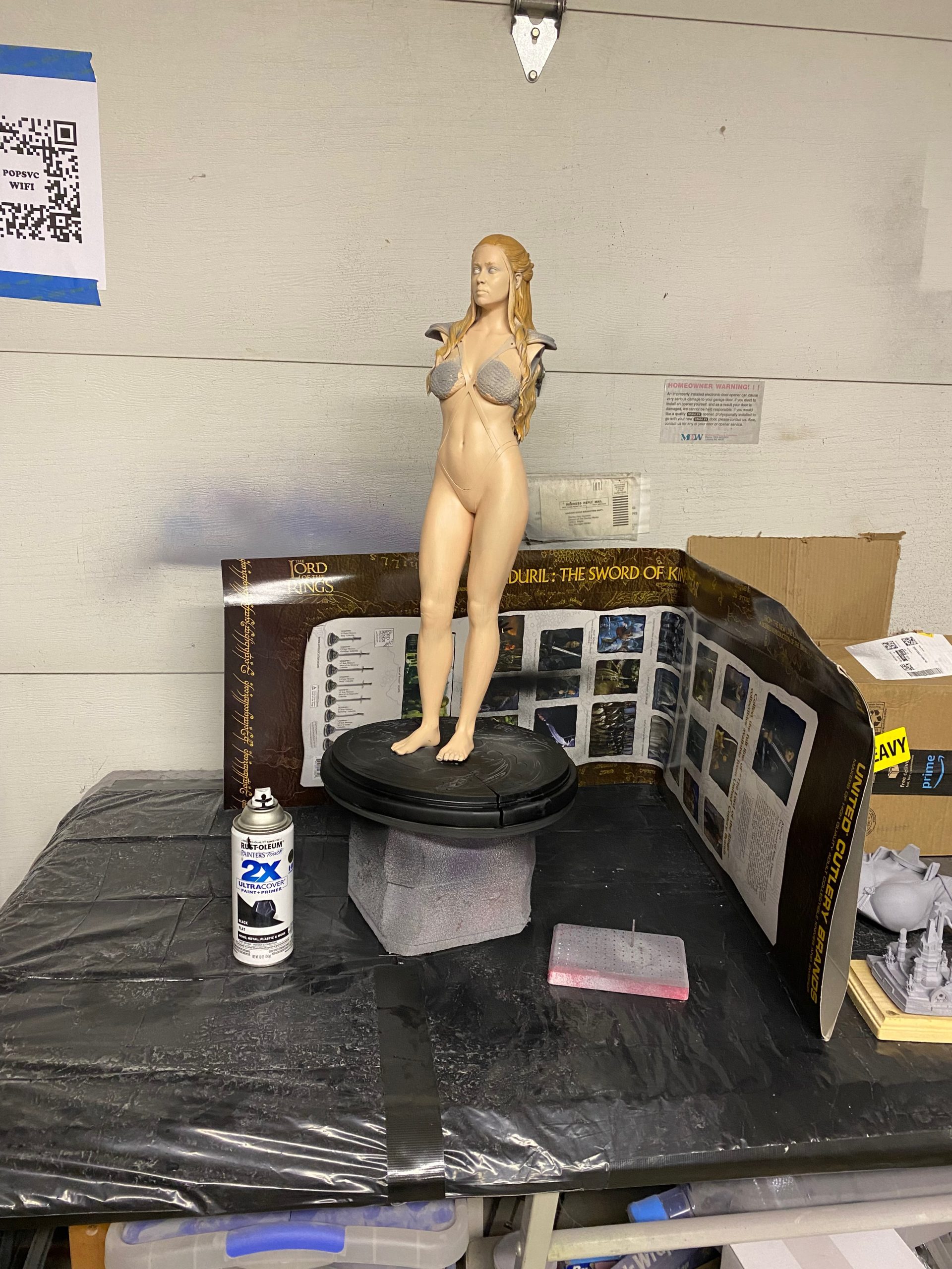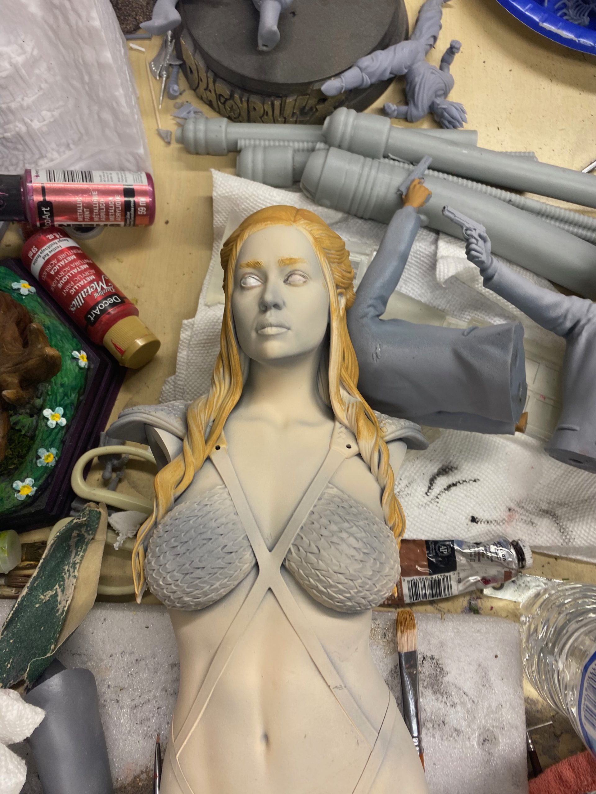 This is a beautiful sculpt of Daenerys with baby Drogon on her shoulder while standing on the Targaryen sigil. It was digitally sculpted by Stepanov and is one of his best. This is one of those long term projects that literally sat on my workbench at the stage of Photo #3 for over a year. I finally got the base and then the dragon printed and went to finishing it immediately. For those curious on painting hair, the secret is layers upon layers. I lost count, but I think that there were at least 8 layers, 9 if you include the primer grey.