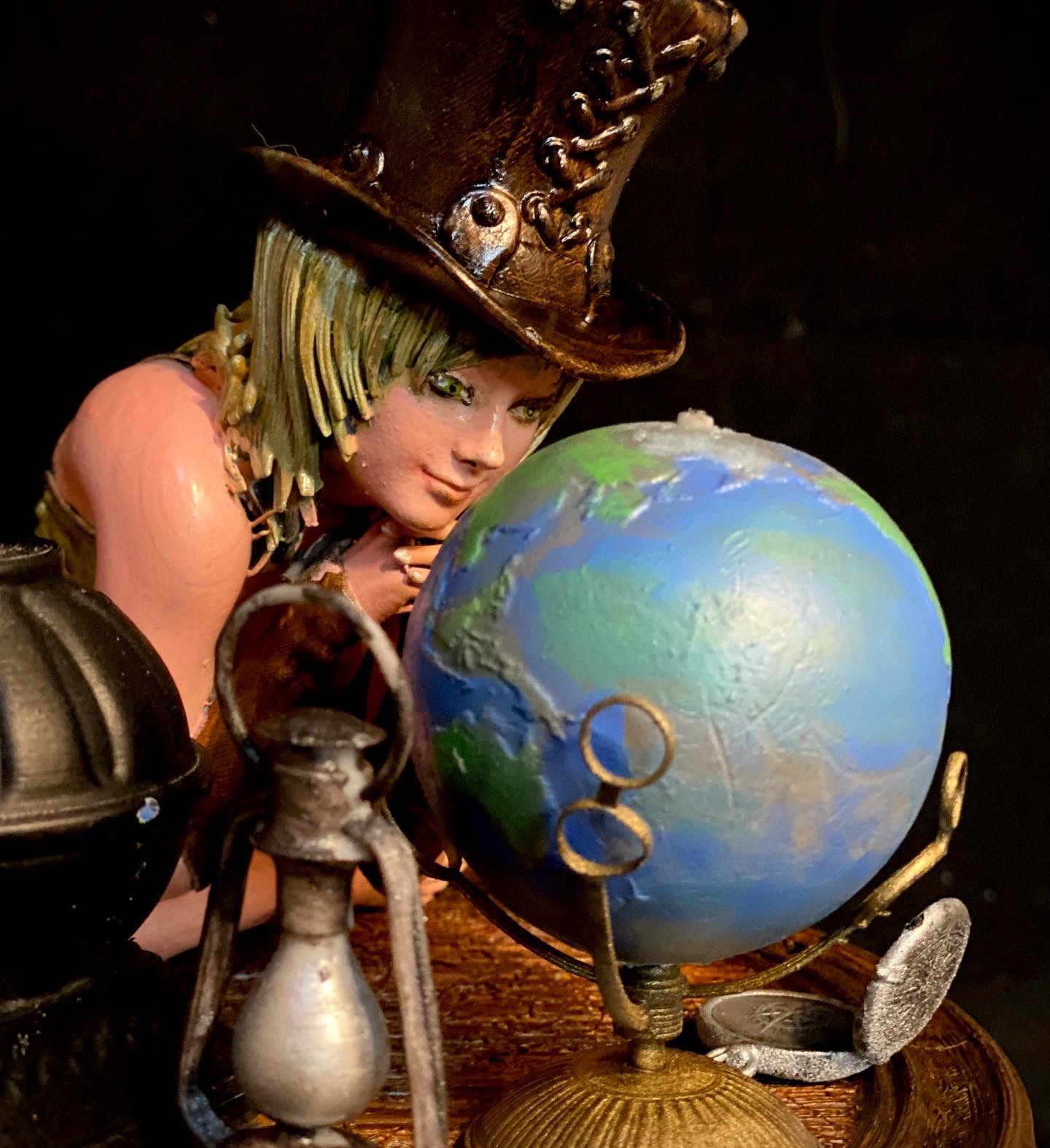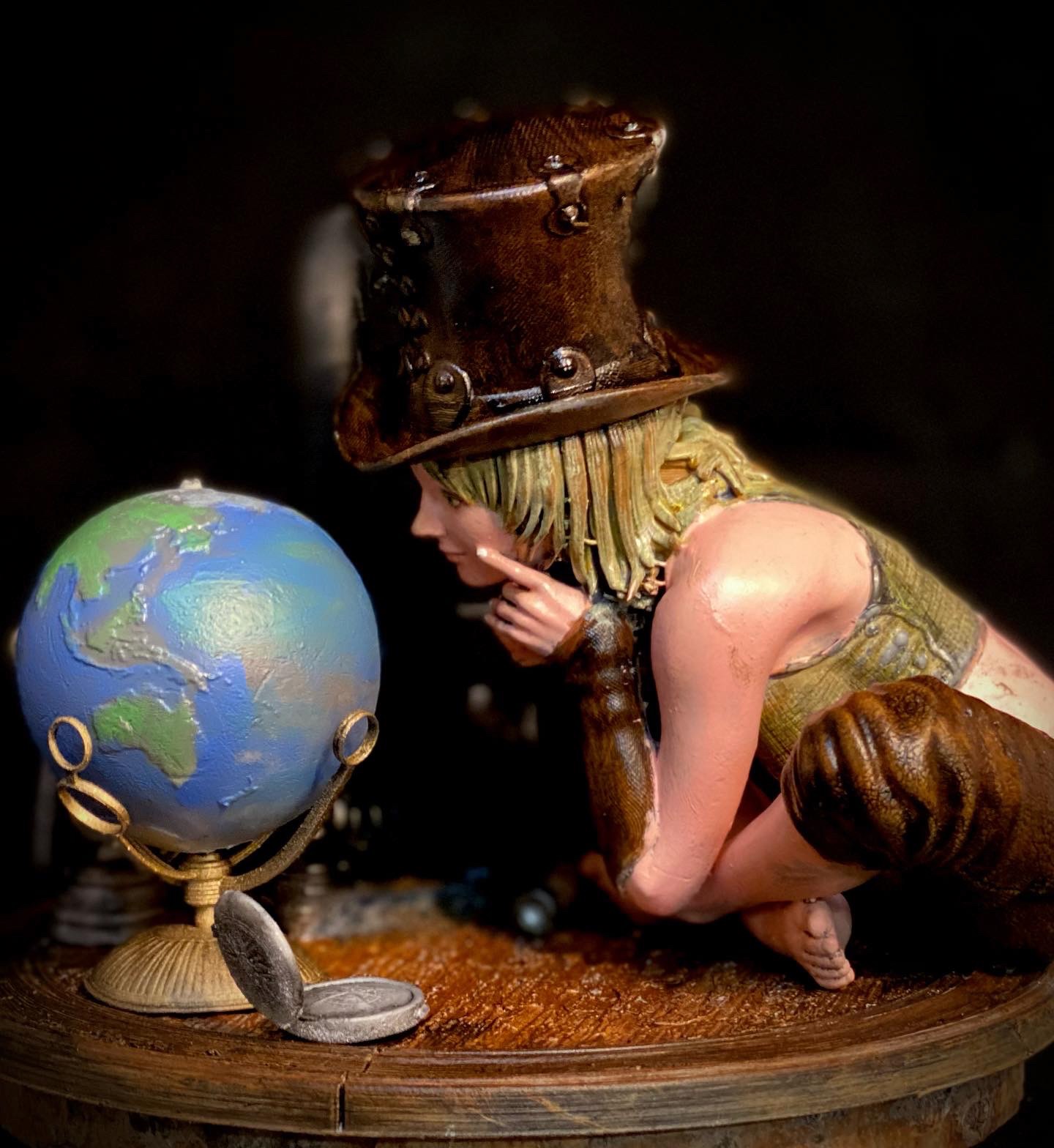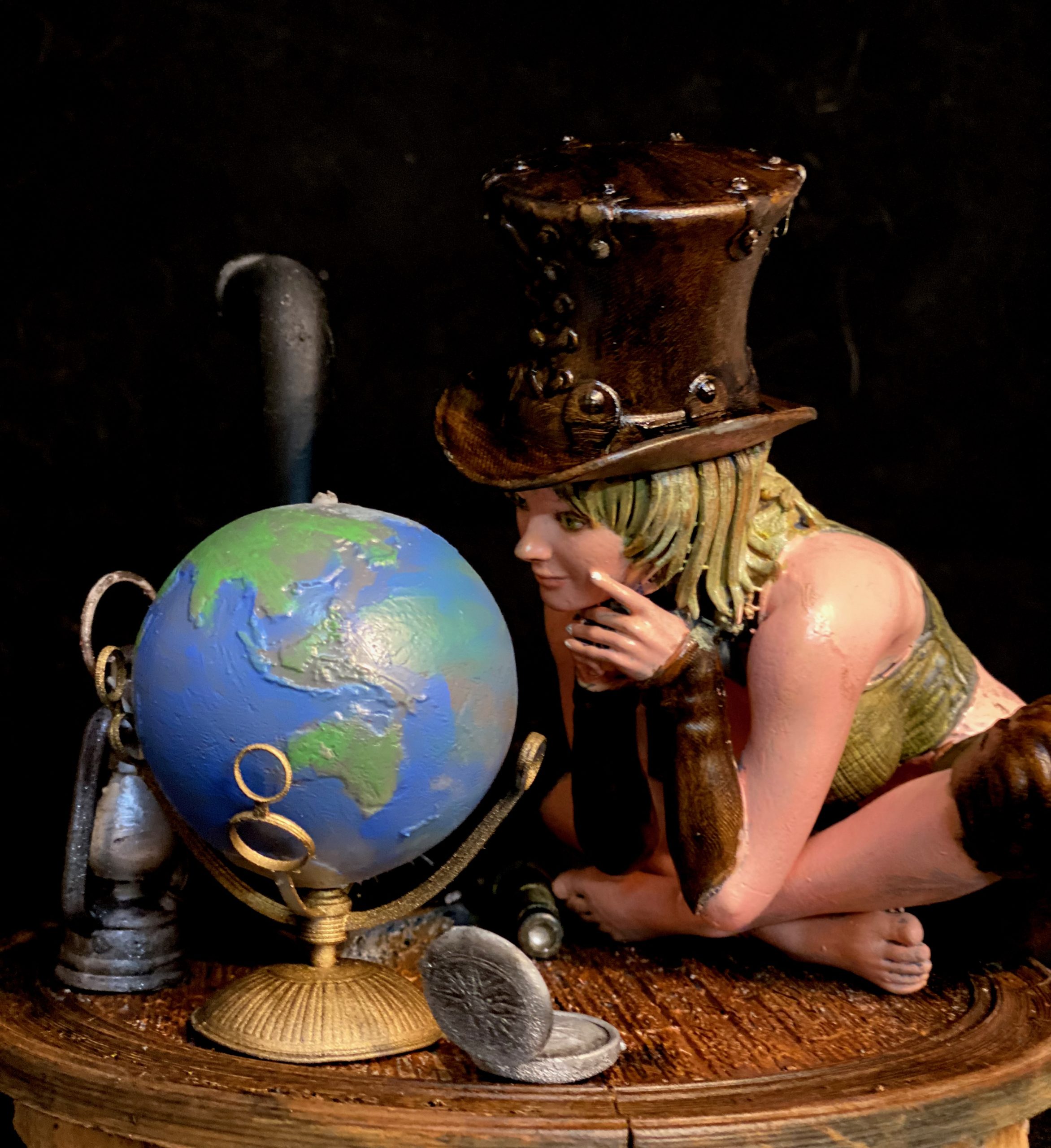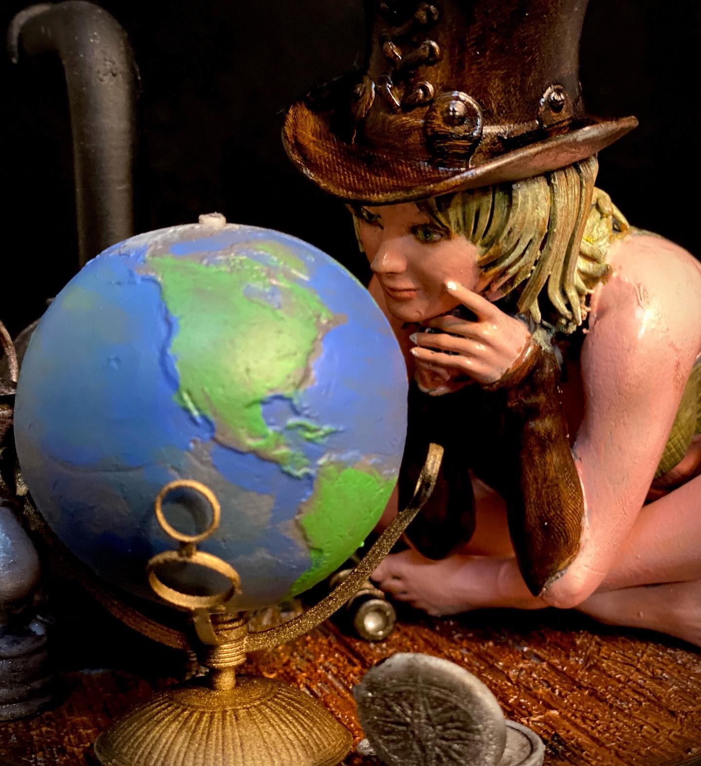 This is a great digital sculpt by Walades, showing a young explorer, looking over a globe and planning her next discovery. I loved this piece and created some merch from it.