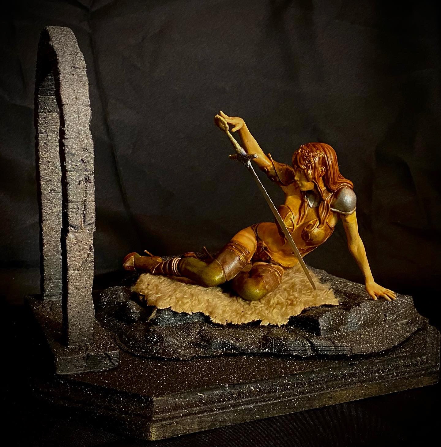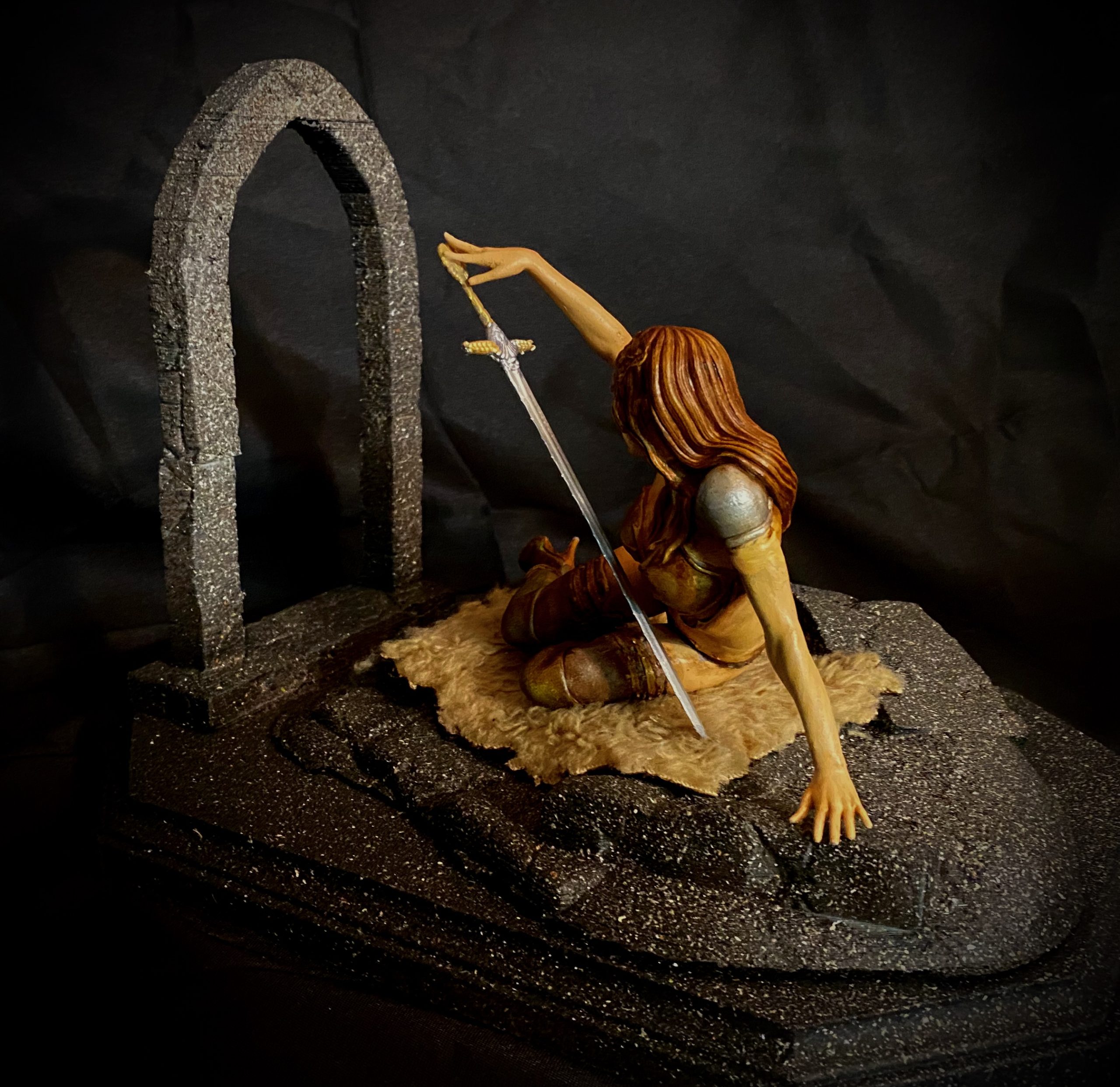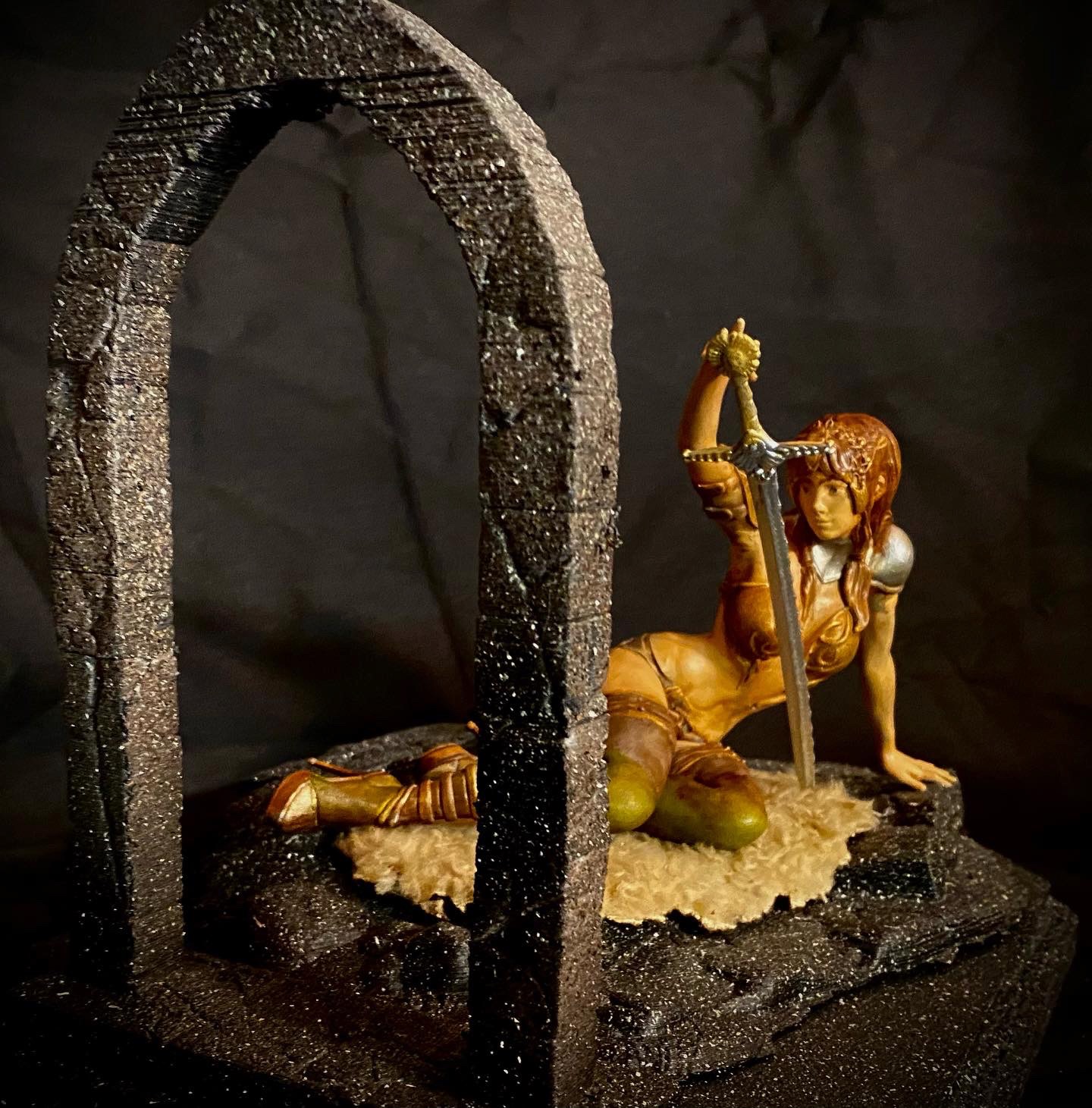 This diorama shows a lady with her “lover”, which in this case is her longsword. She gazes at its beauty, in love with the power it gives her. This was digitally sculpted by Walades.