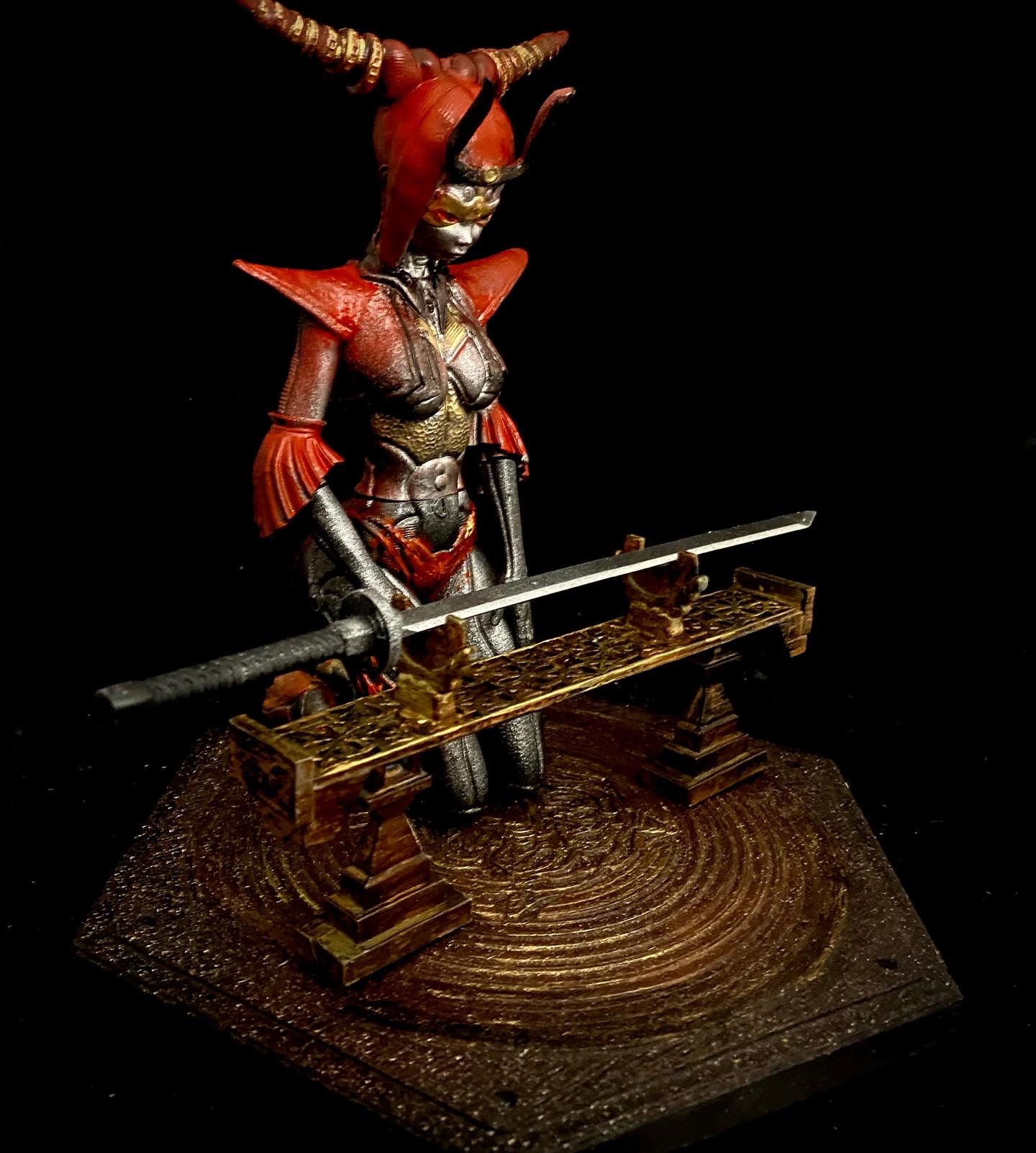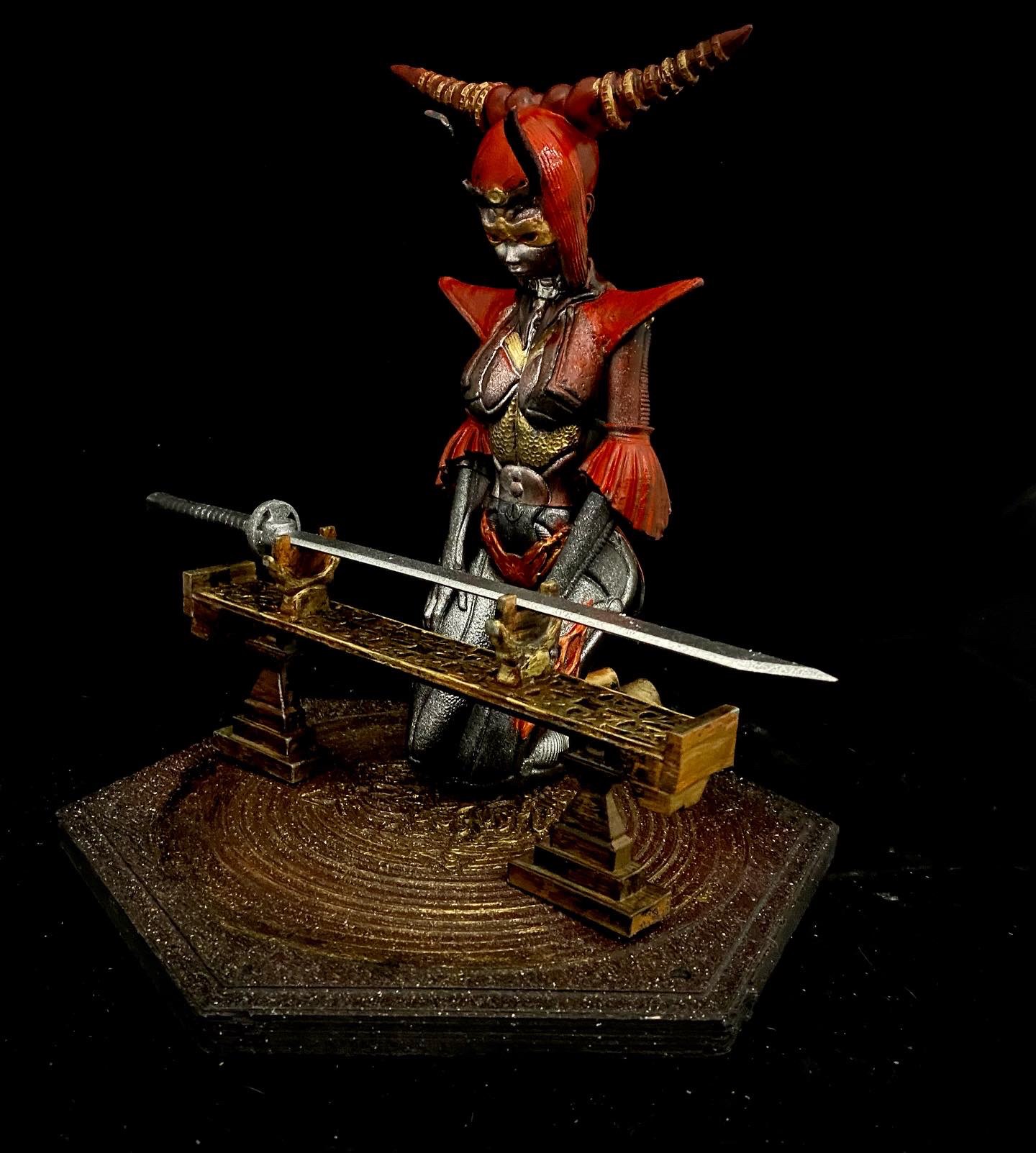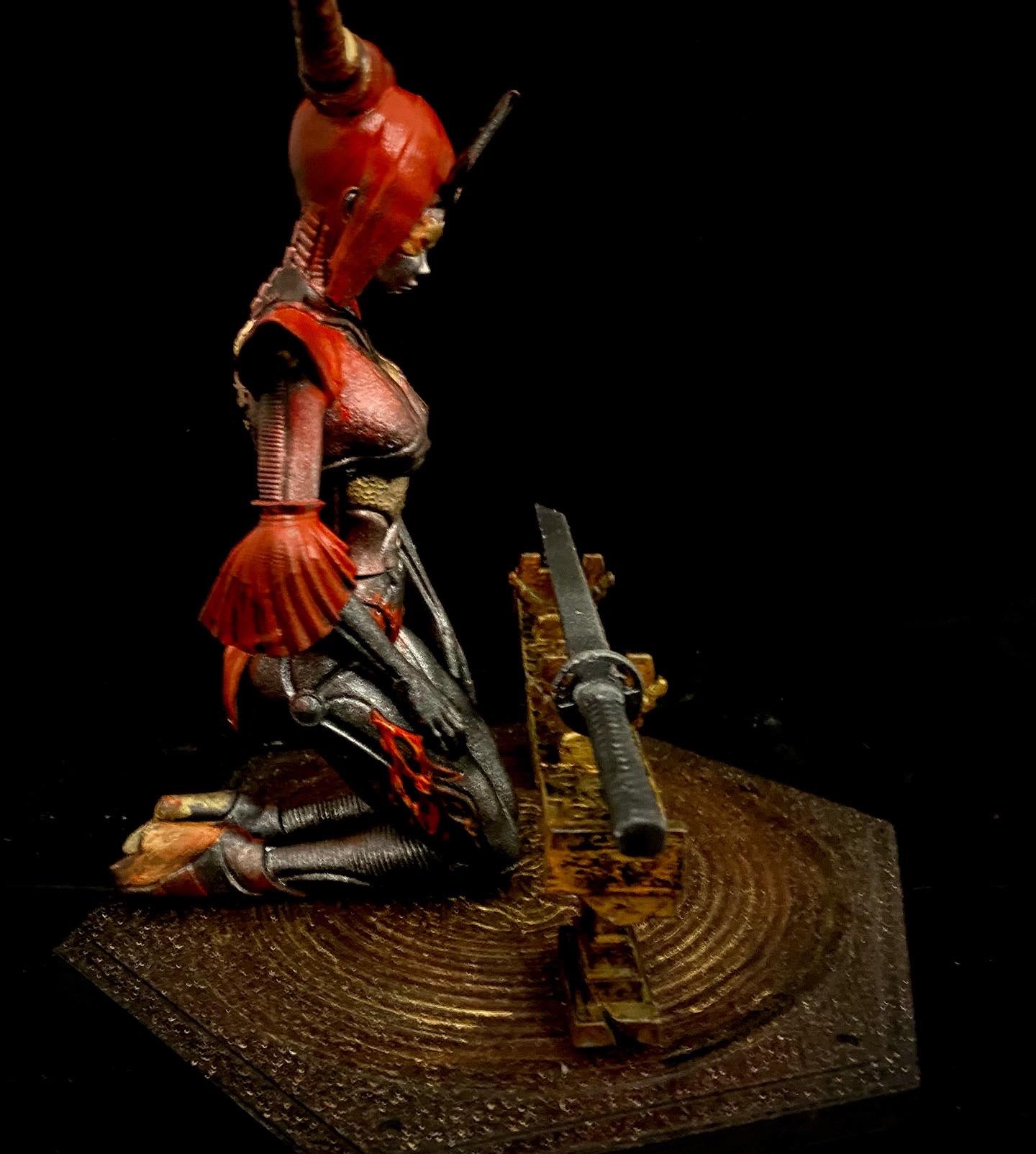 This is another beautiful piece by Walades, in which a samurai cyborg studies her blade. This is one that I turned into an NFT, back when that was a thing, by superimposing her into a background that seemed fitting.