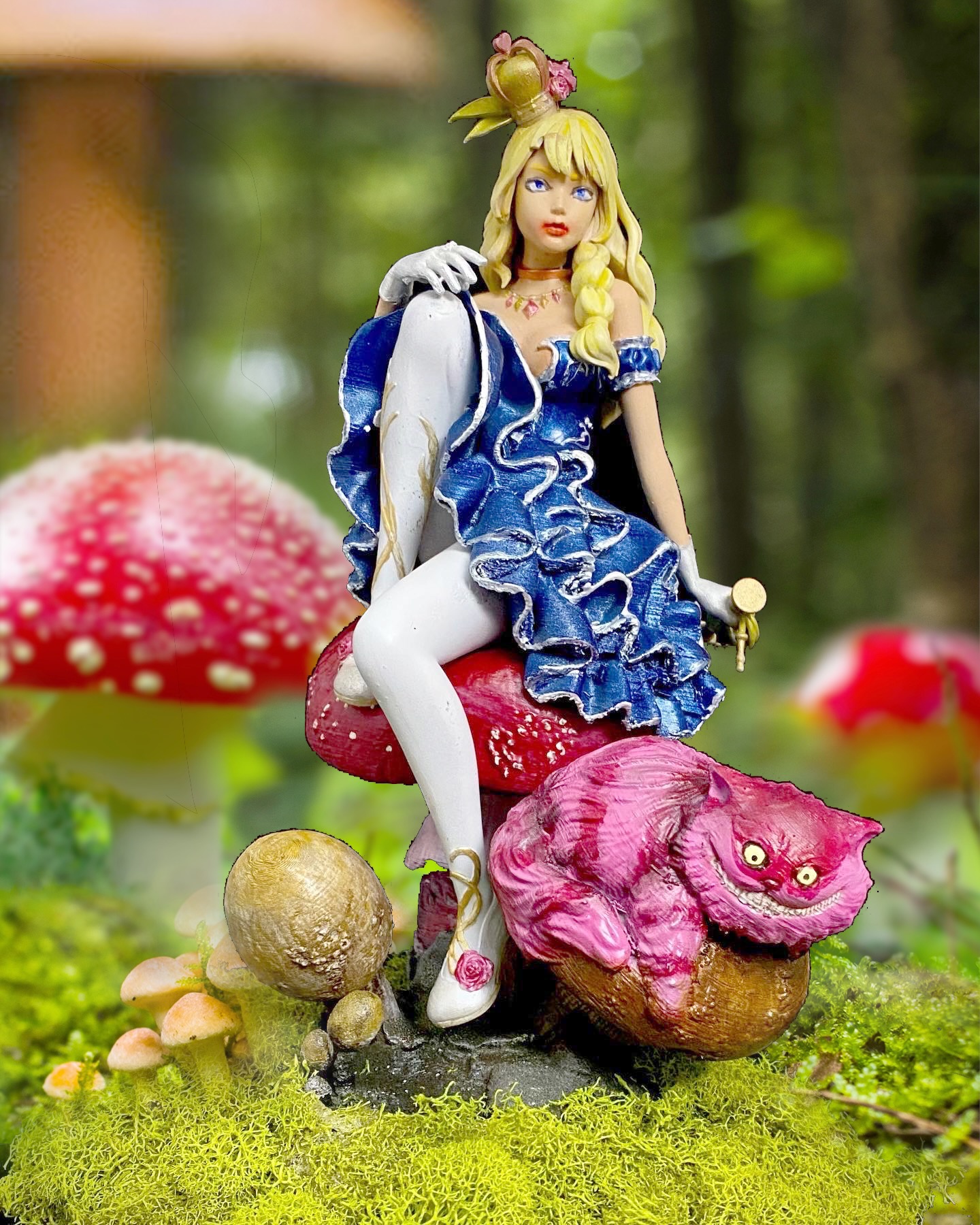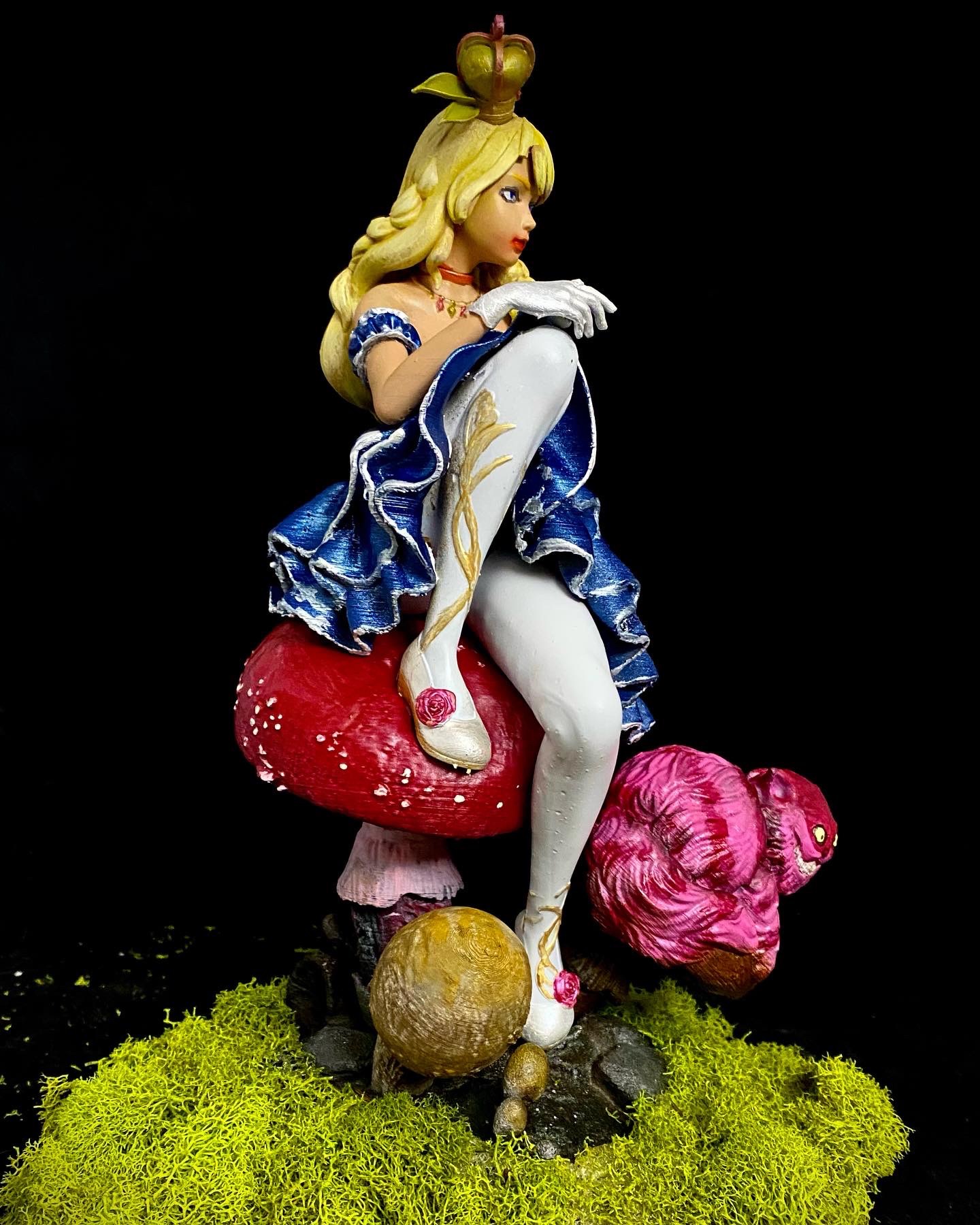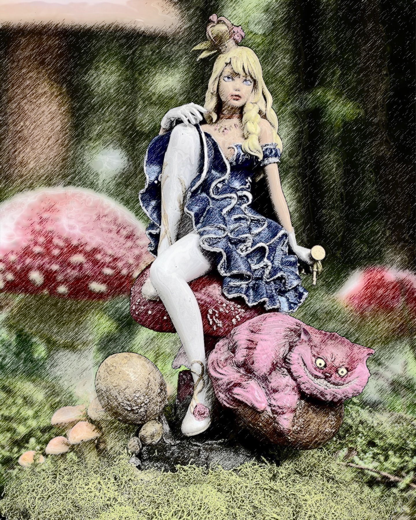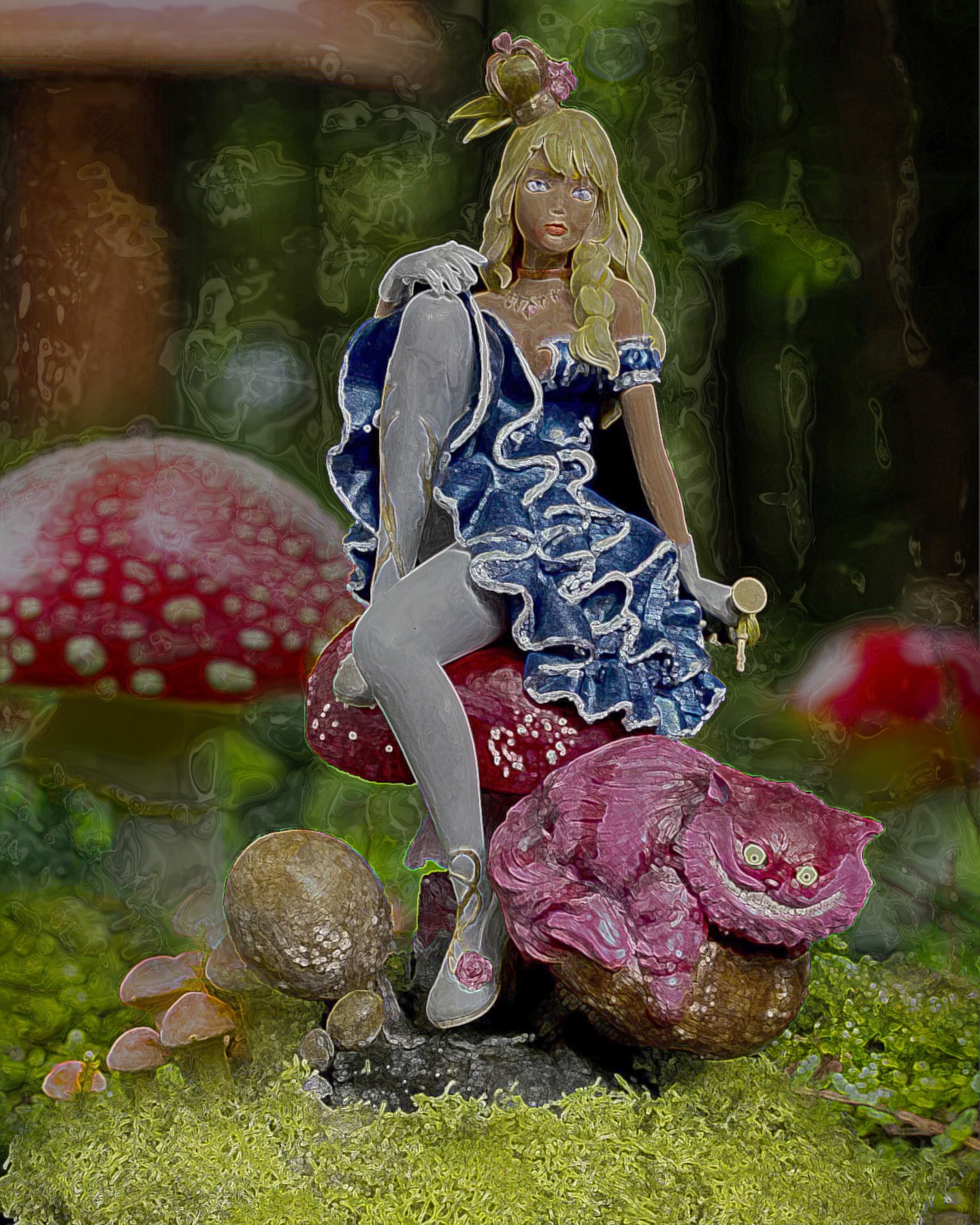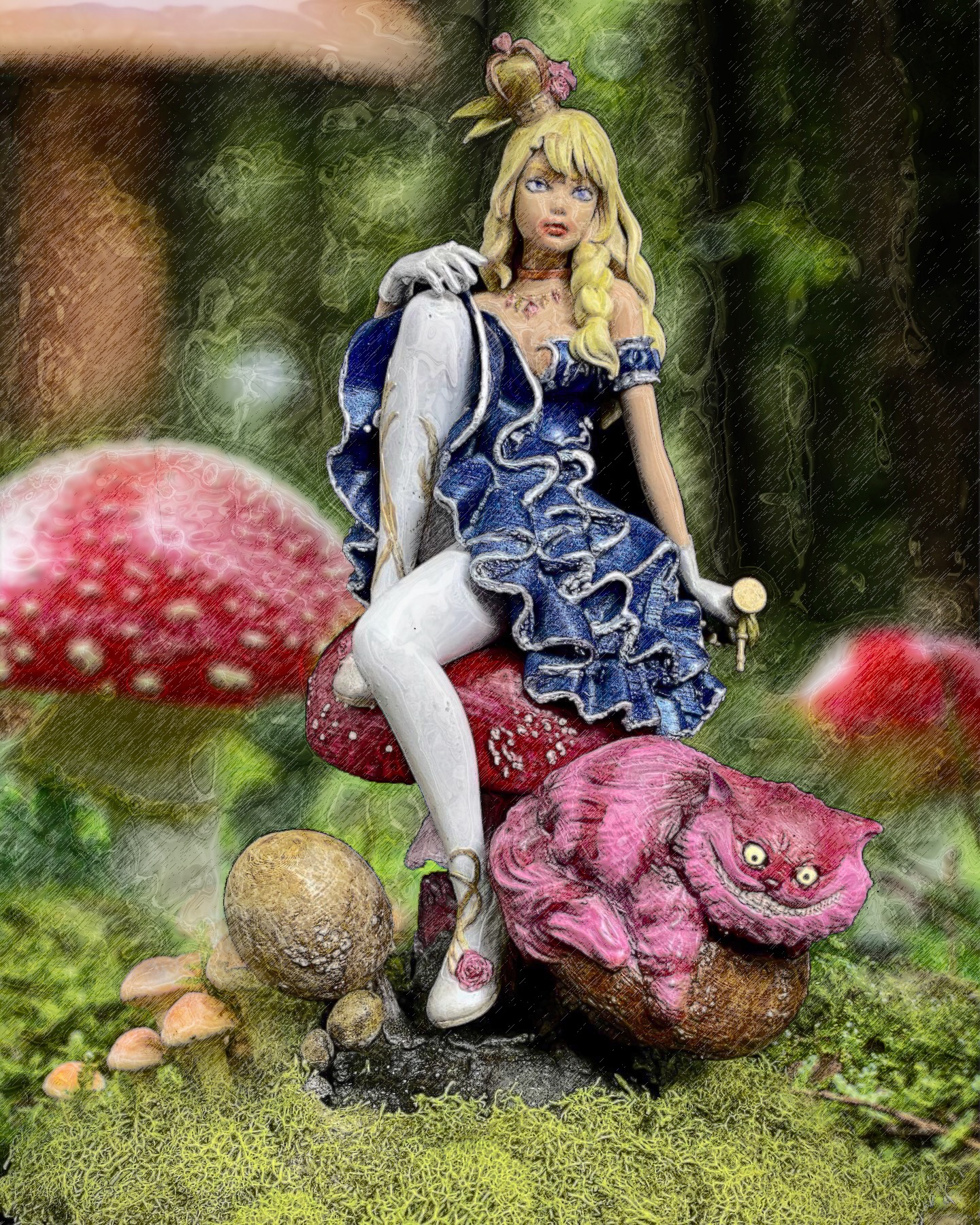 I absolutely love this sculpt, depicting Alice and Cheshire Cat sitting on a muchroom. Like a few of a my favorite pieces, I superimposed this one into a fitting scene, using photoshop filters and effects to make it seem completely integrated, and then made them into NFTs, when that was a thing. This is such a favorite, it has also made it to my merch.