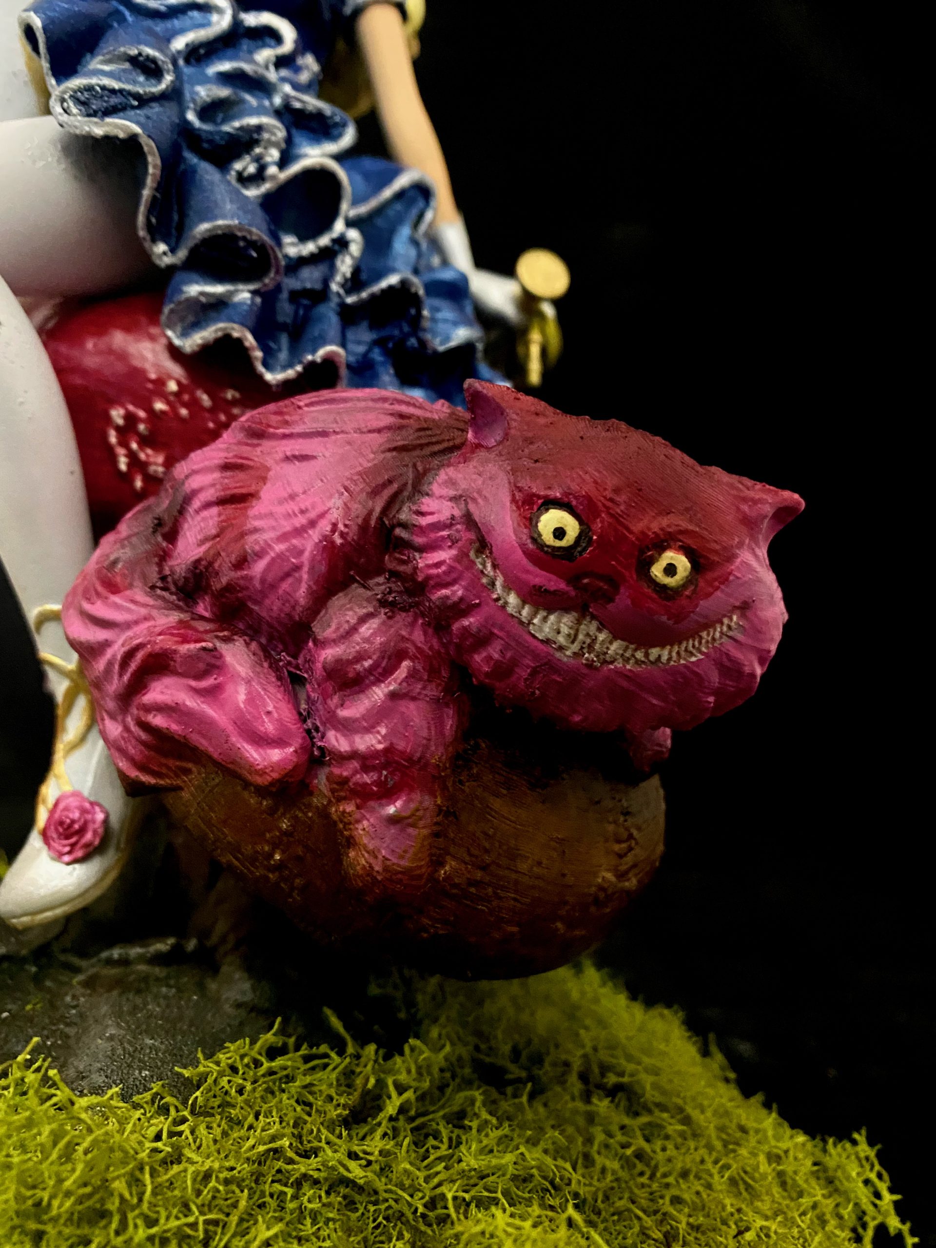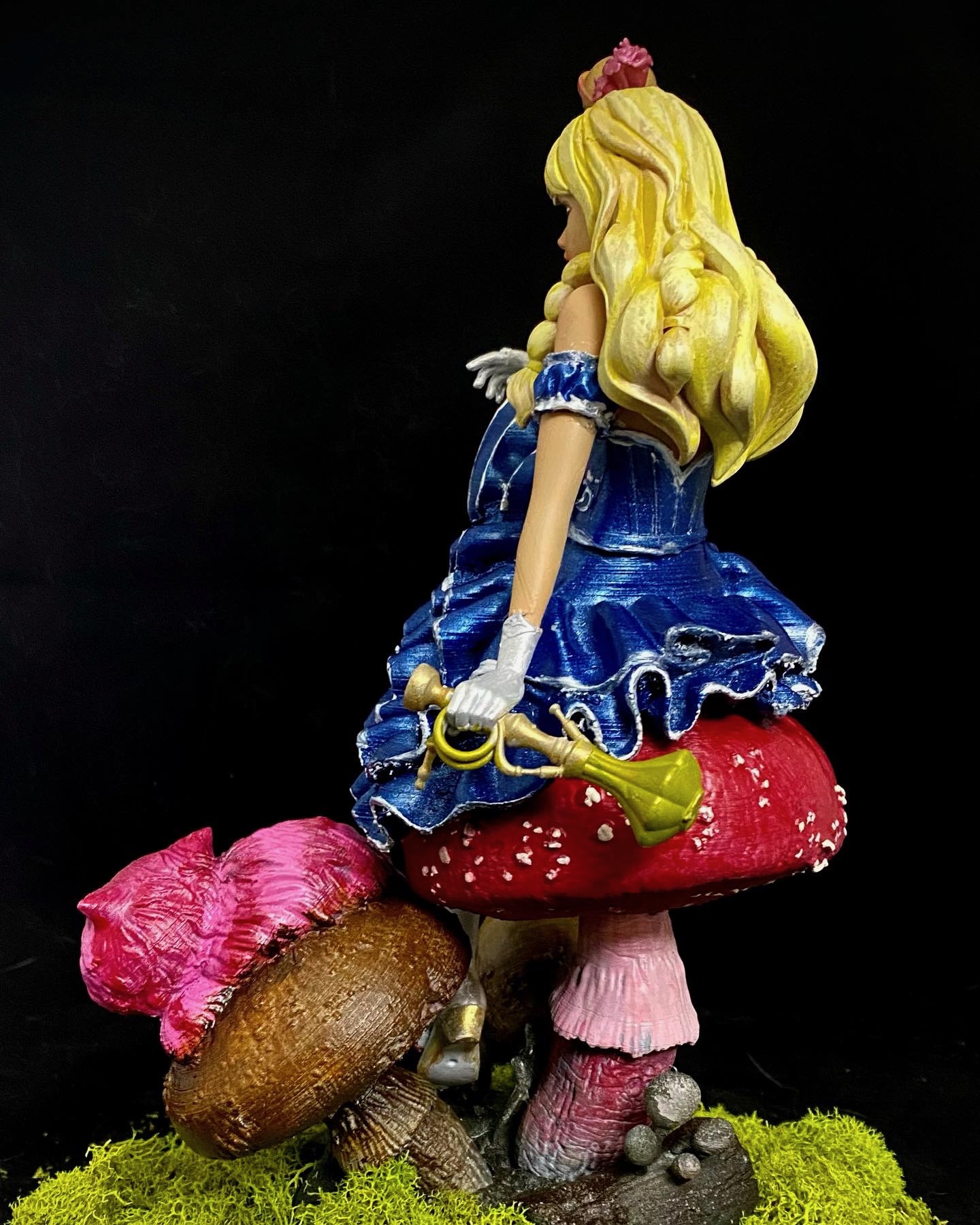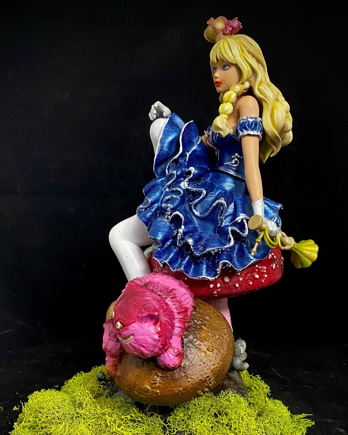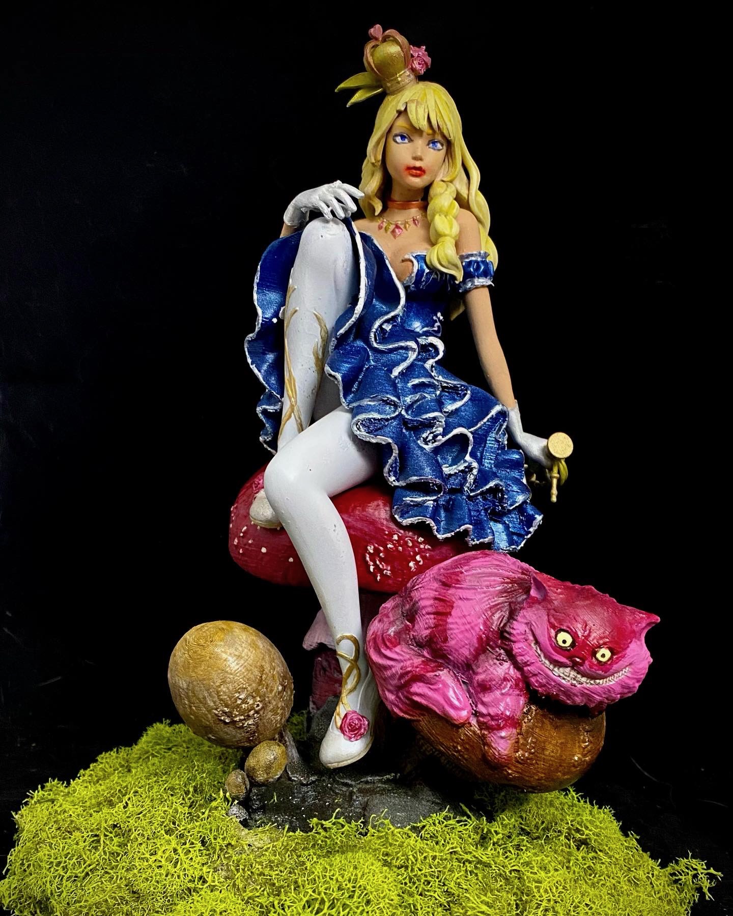 I absolutely love this sculpt, depicting Alice and Cheshire Cat sitting on a muchroom. Like a few of a my favorite pieces, I superimposed this one into a fitting scene, using photoshop filters and effects to make it seem completely integrated, and then made them into NFTs, when that was a thing. This is such a favorite, it has also made it to my merch.