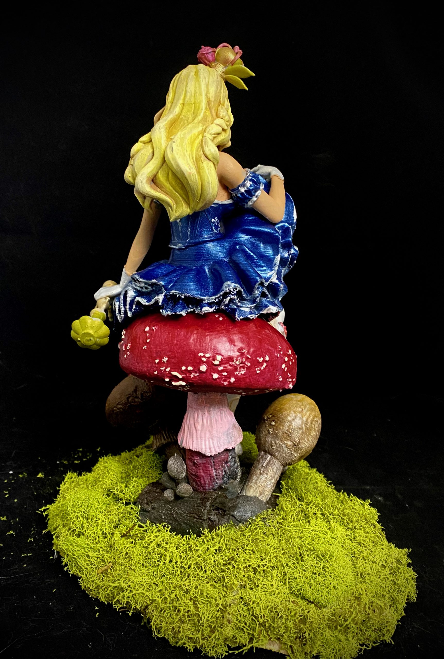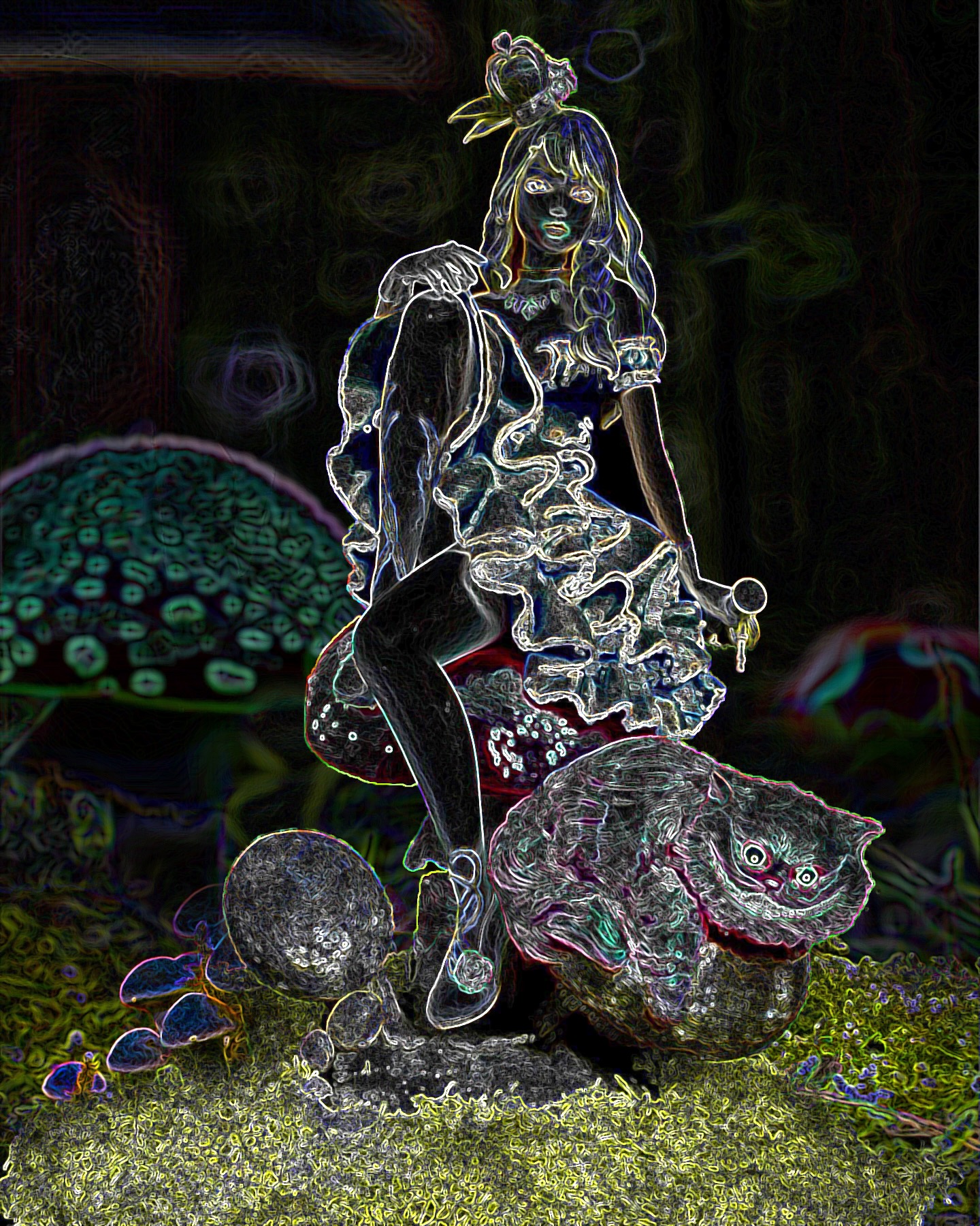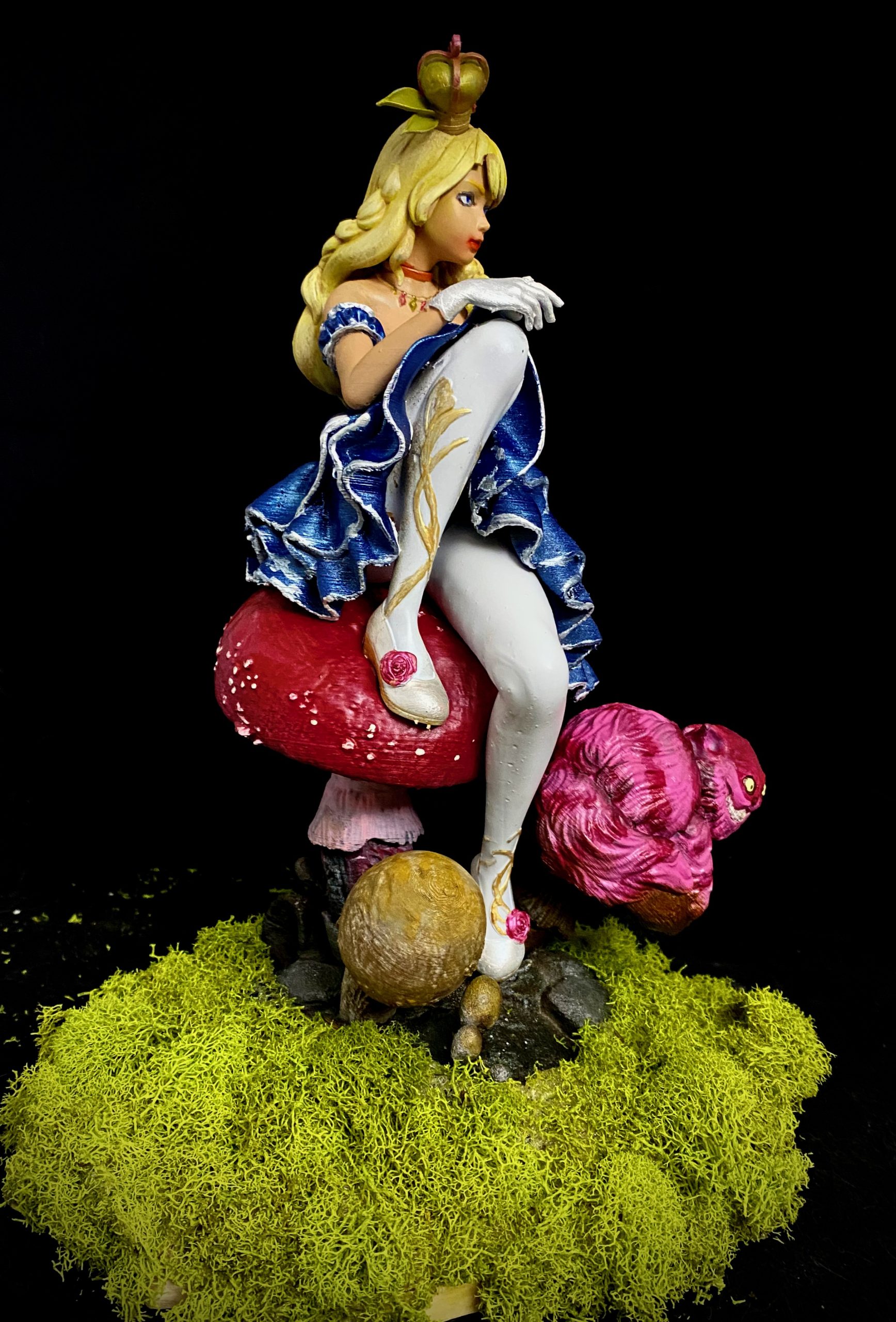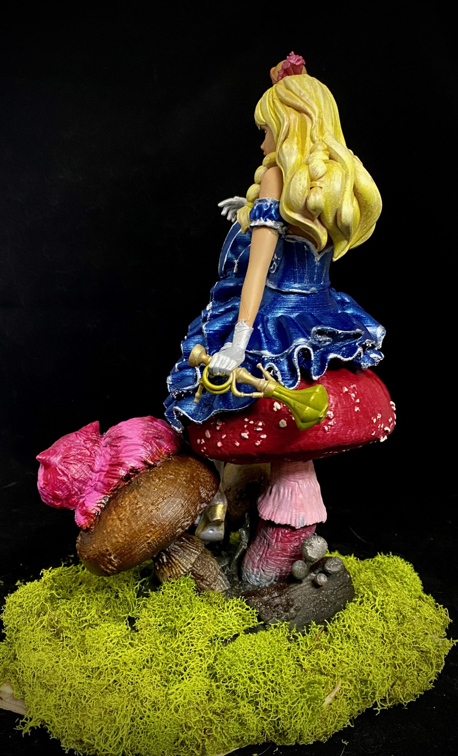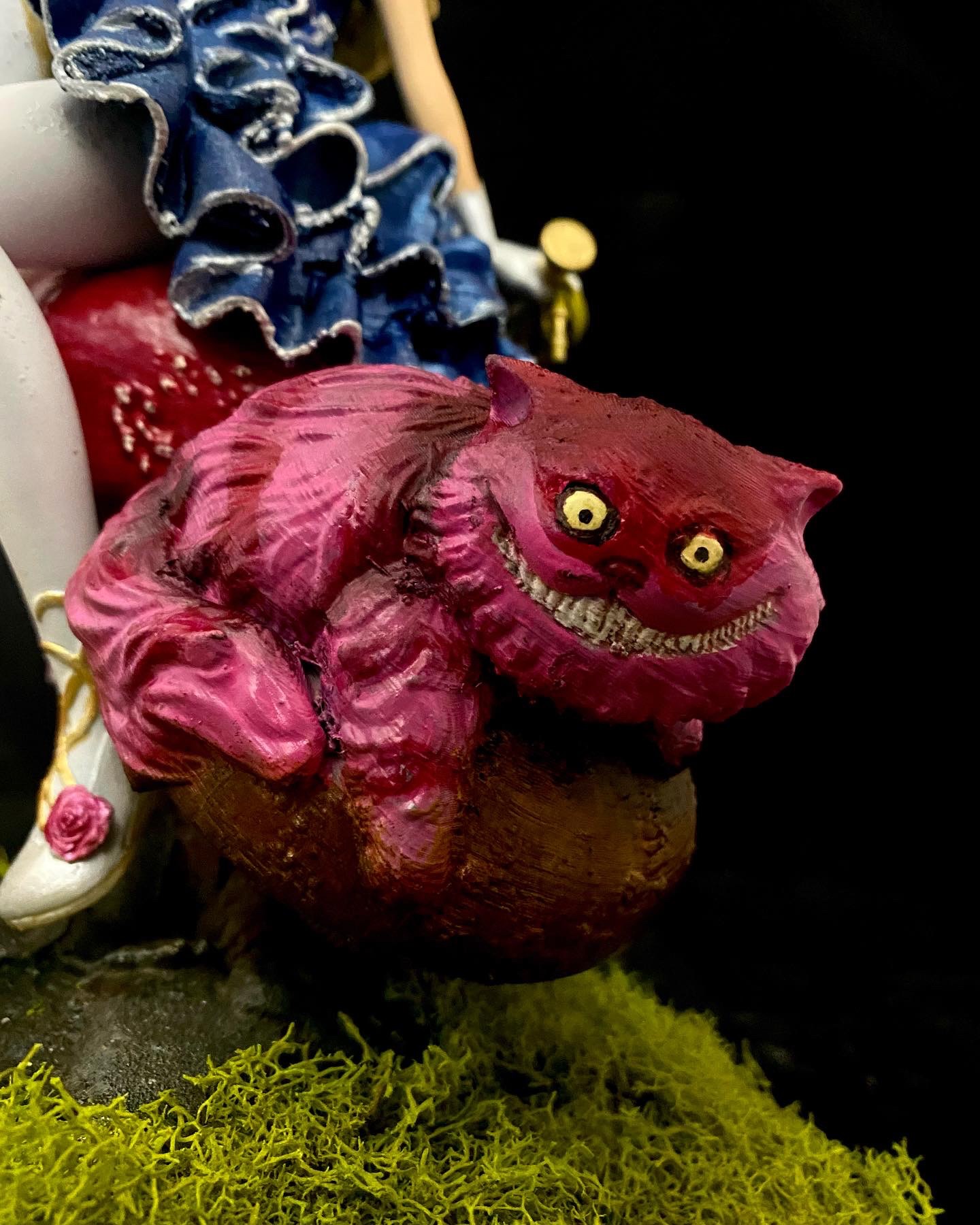 I absolutely love this sculpt, depicting Alice and Cheshire Cat sitting on a muchroom. Like a few of a my favorite pieces, I superimposed this one into a fitting scene, using photoshop filters and effects to make it seem completely integrated, and then made them into NFTs, when that was a thing. This is such a favorite, it has also made it to my merch.