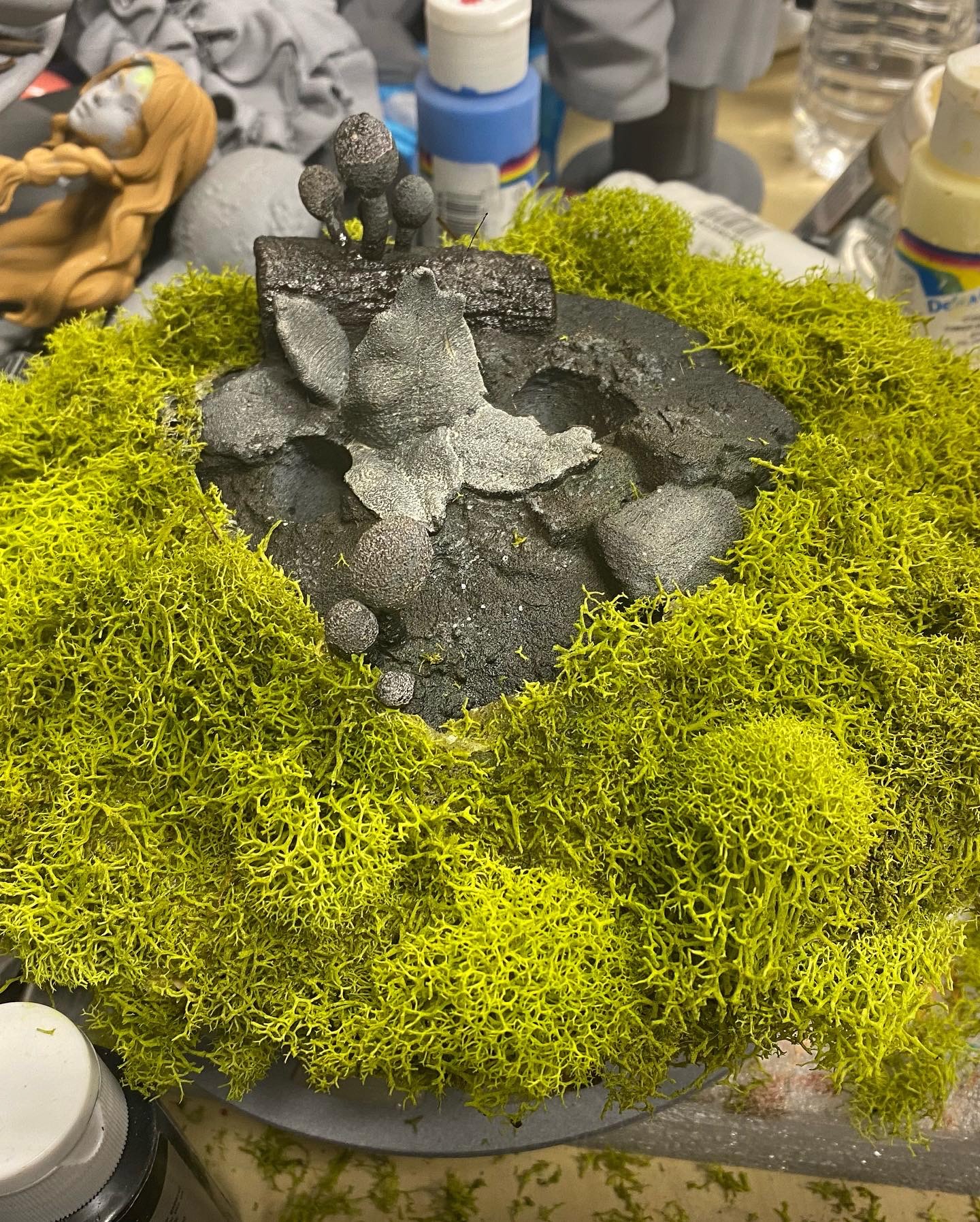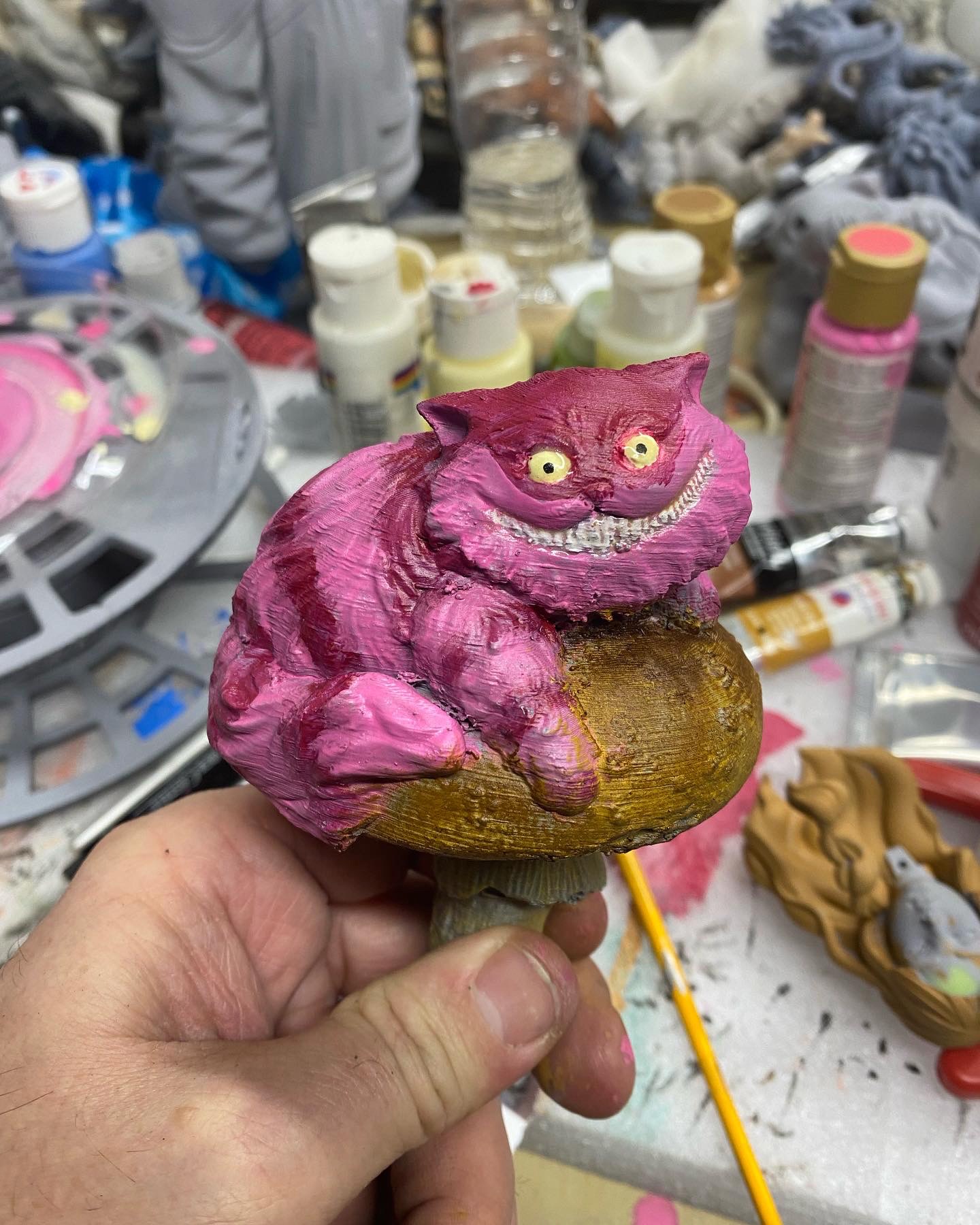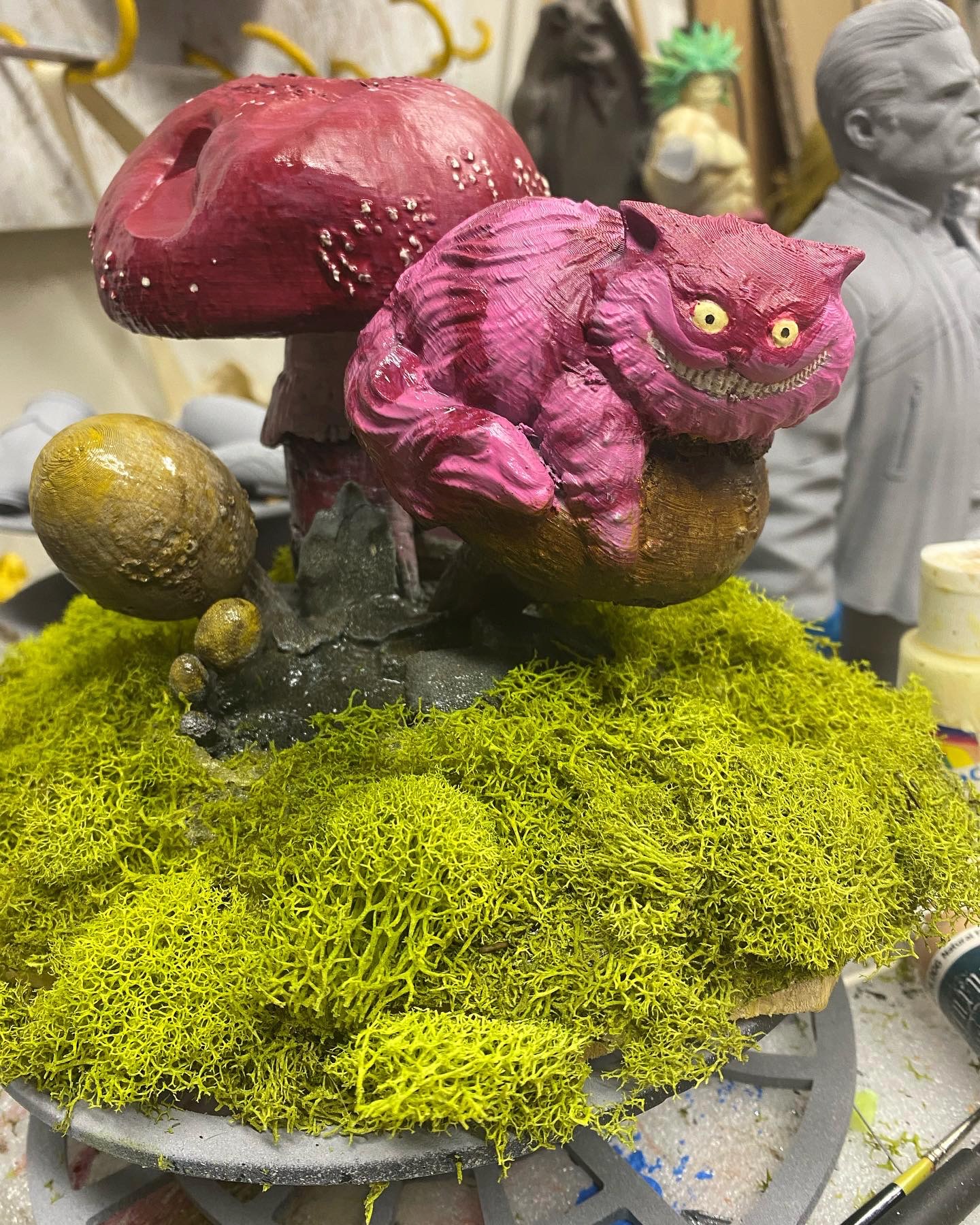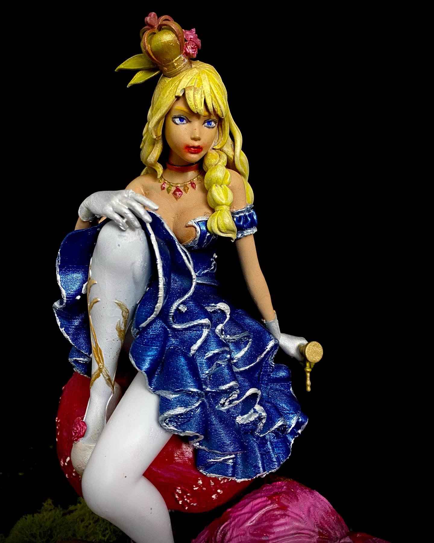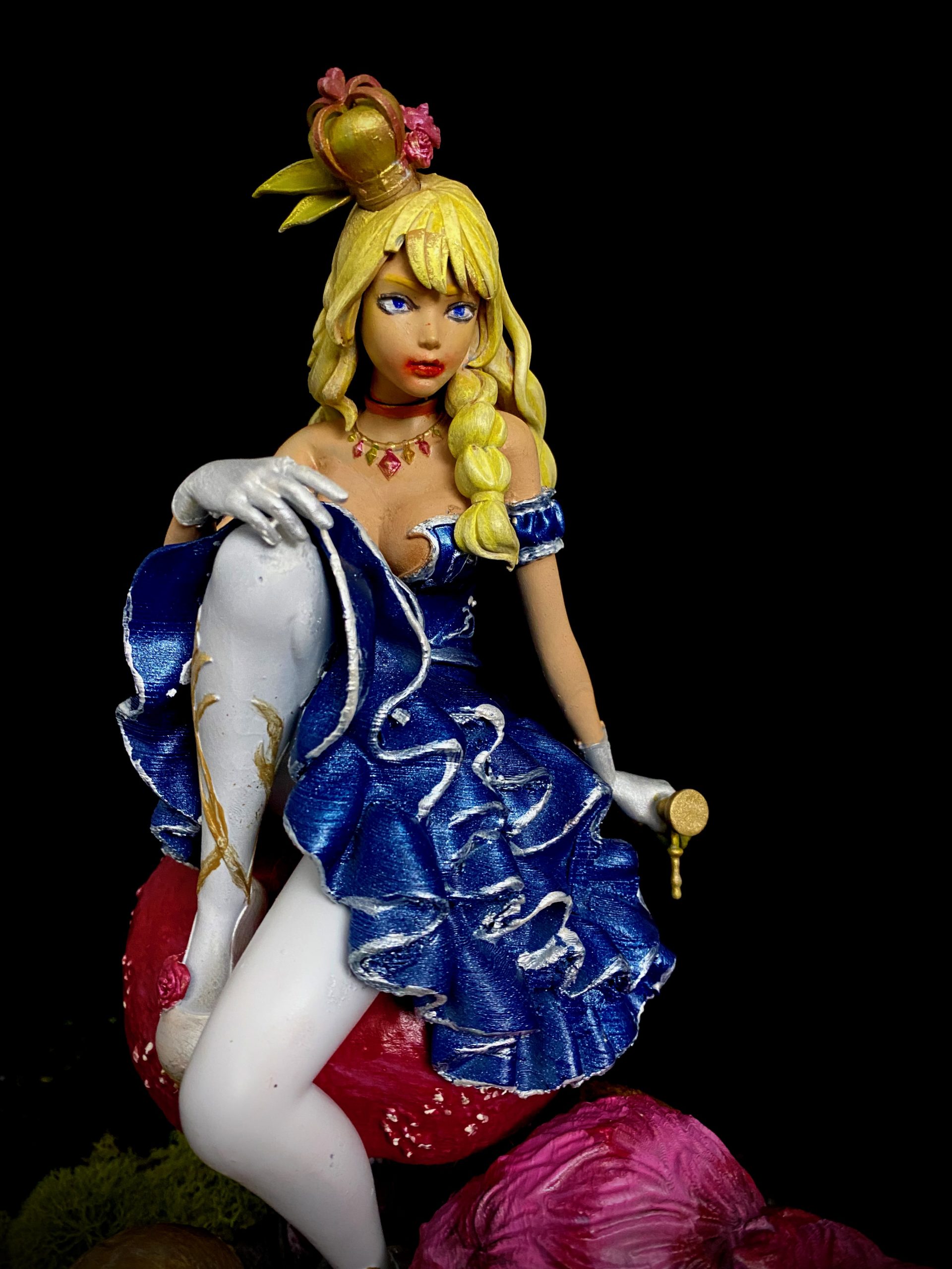 I absolutely love this sculpt, depicting Alice and Cheshire Cat sitting on a muchroom. Like a few of a my favorite pieces, I superimposed this one into a fitting scene, using photoshop filters and effects to make it seem completely integrated, and then made them into NFTs, when that was a thing. This is such a favorite, it has also made it to my merch.