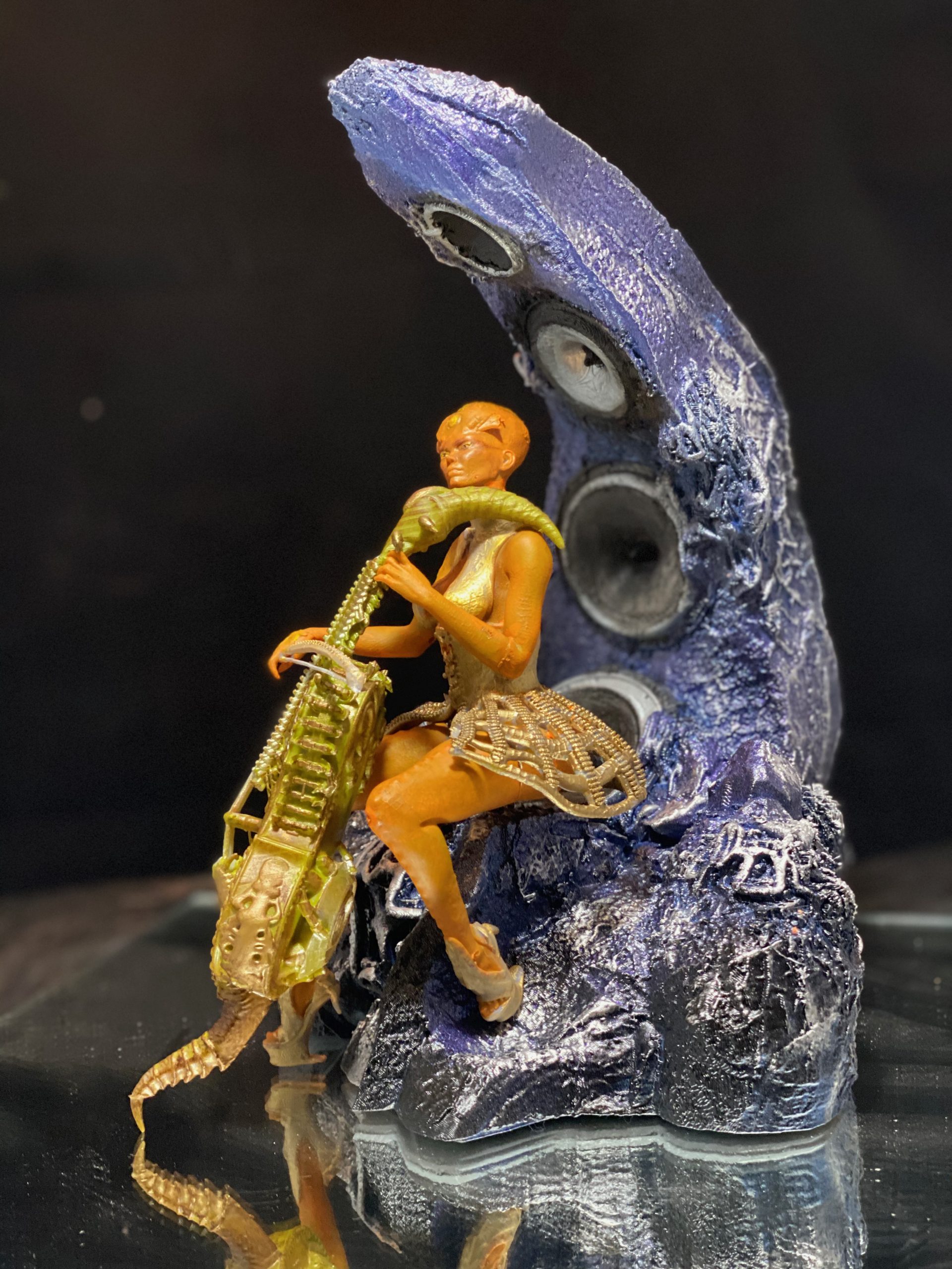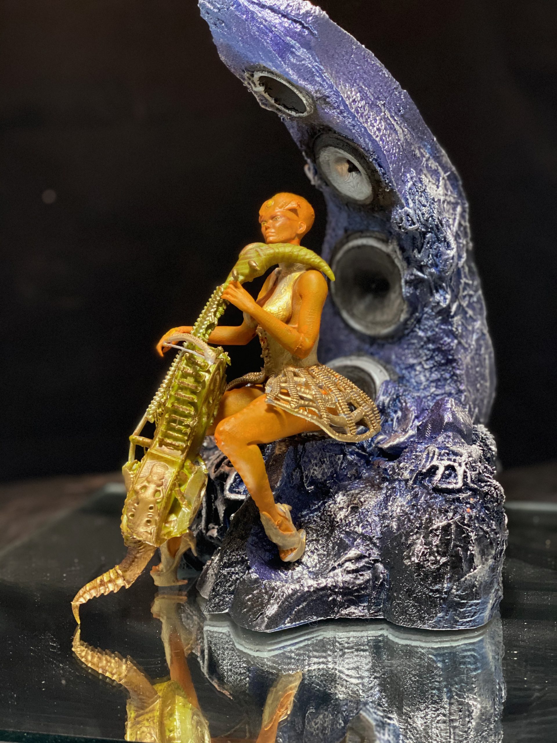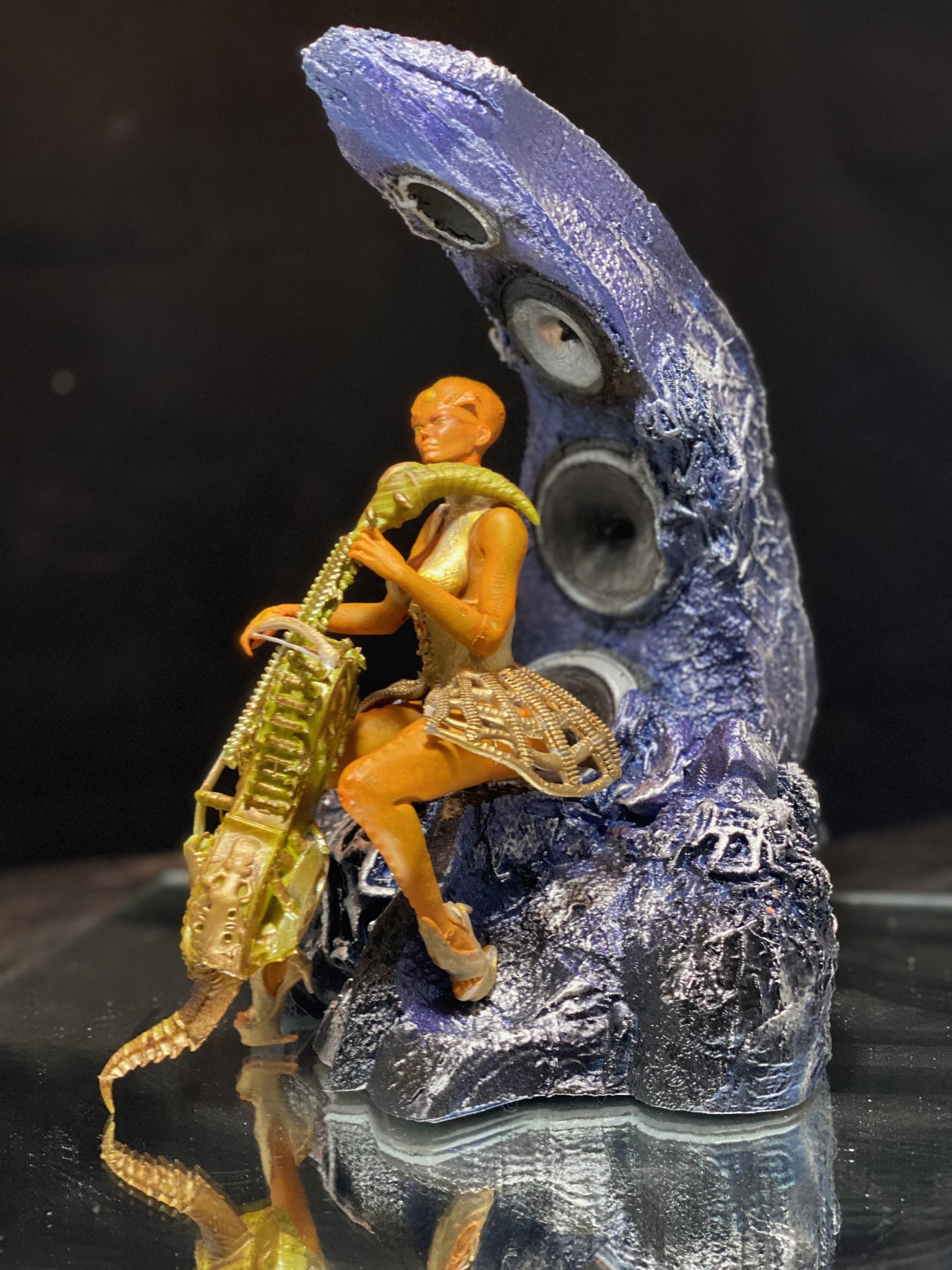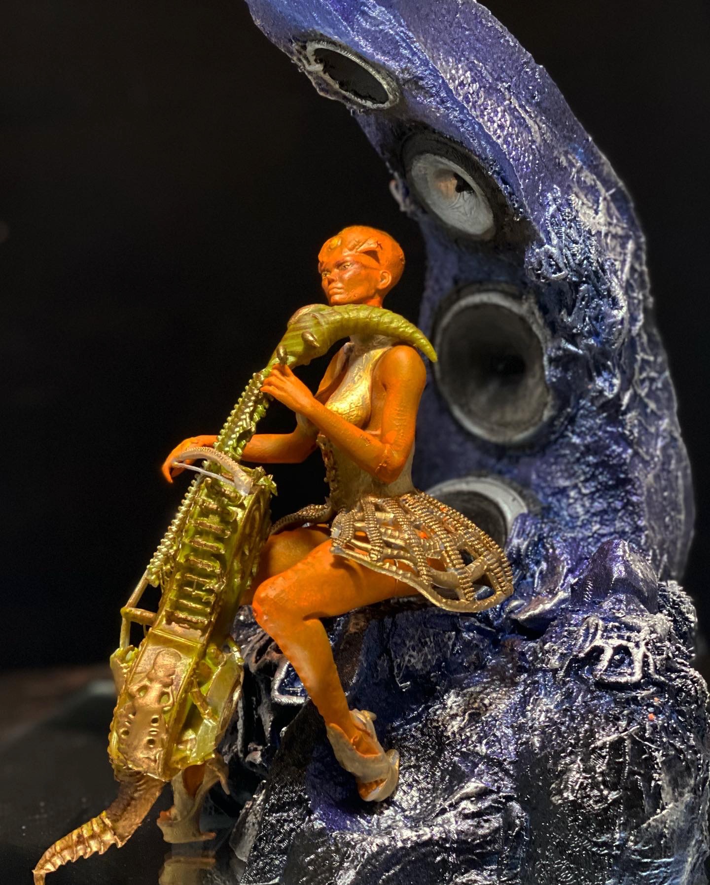 This is another sculpt by my friend Walades, where an alien plays a stringed instrument, while sitting among stereophonic rocks. What can I say? The man has an imagination. Like others, I took the final image and superimposed it into an appropriate landscape.