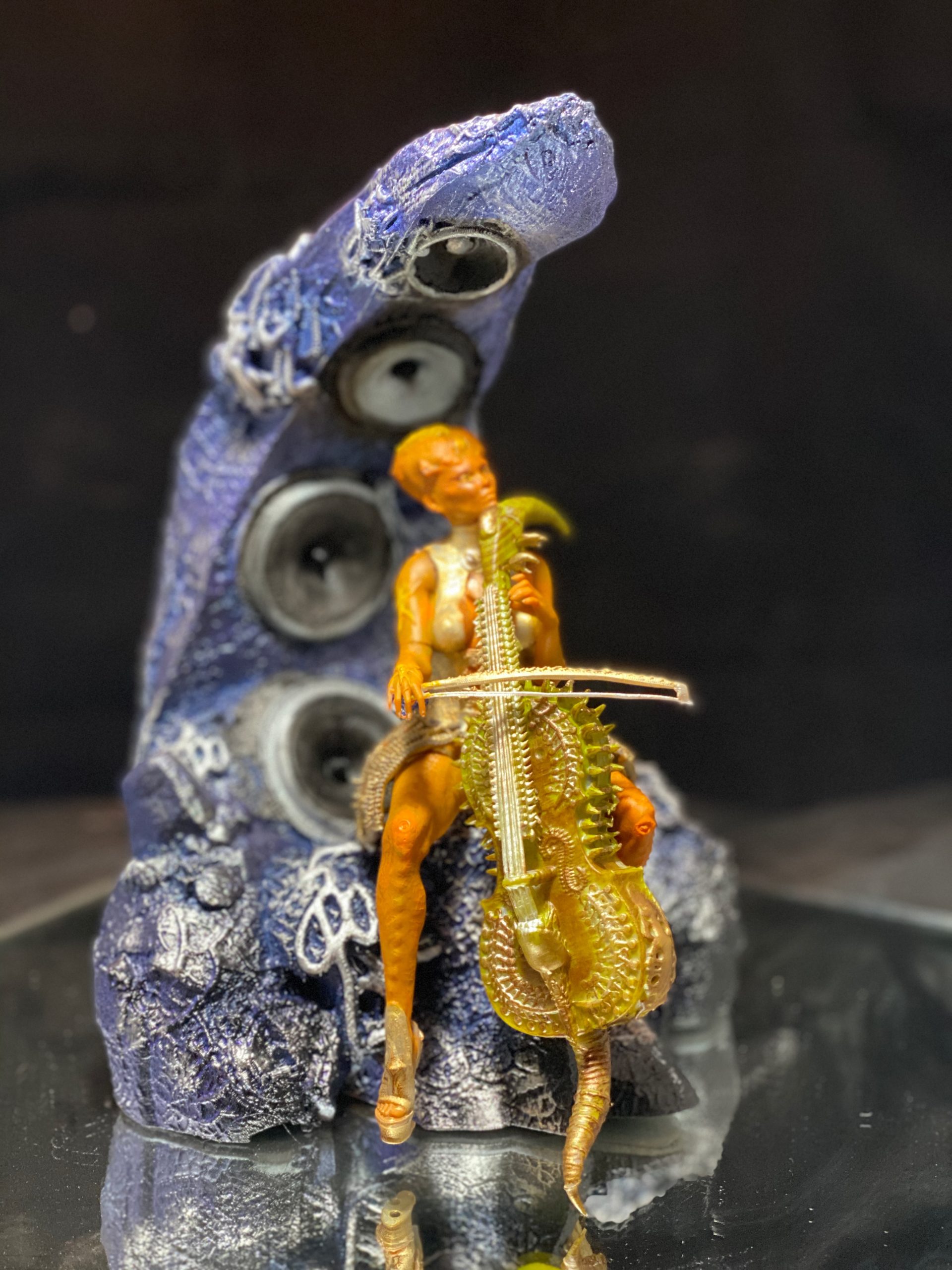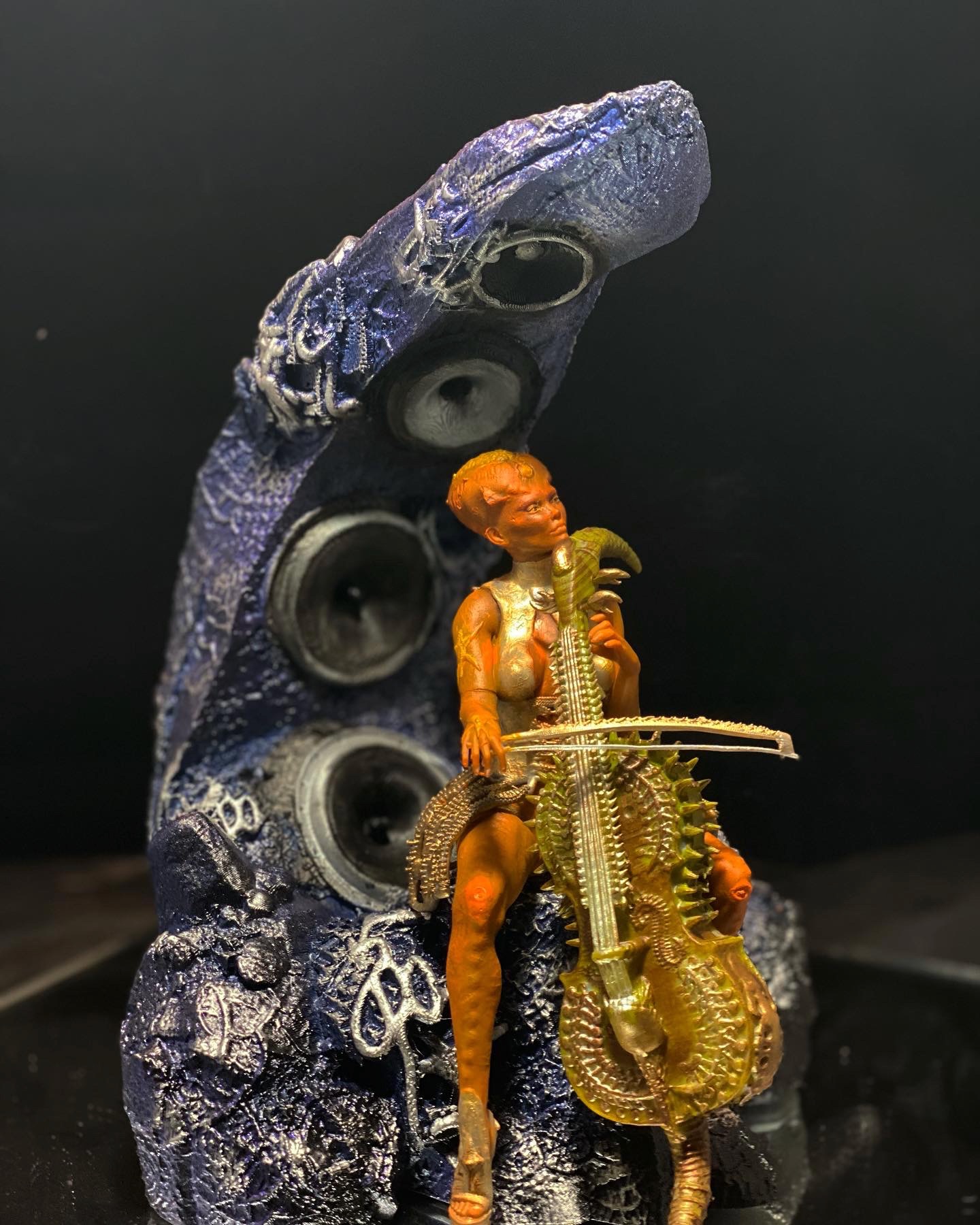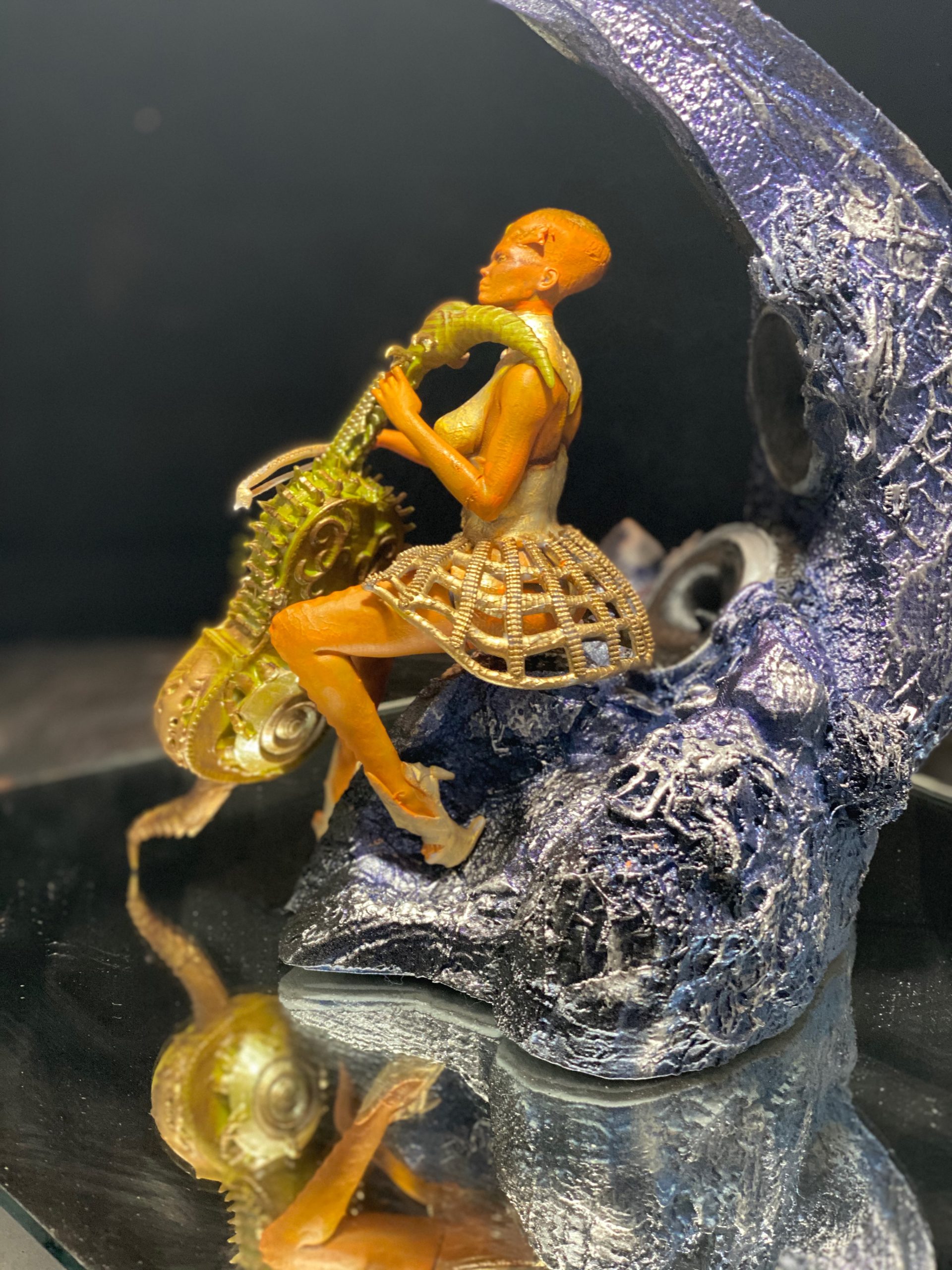This is another sculpt by my friend Walades, where an alien plays a stringed instrument, while sitting among stereophonic rocks. What can I say? The man has an imagination. Like others, I took the final image and superimposed it into an appropriate landscape.