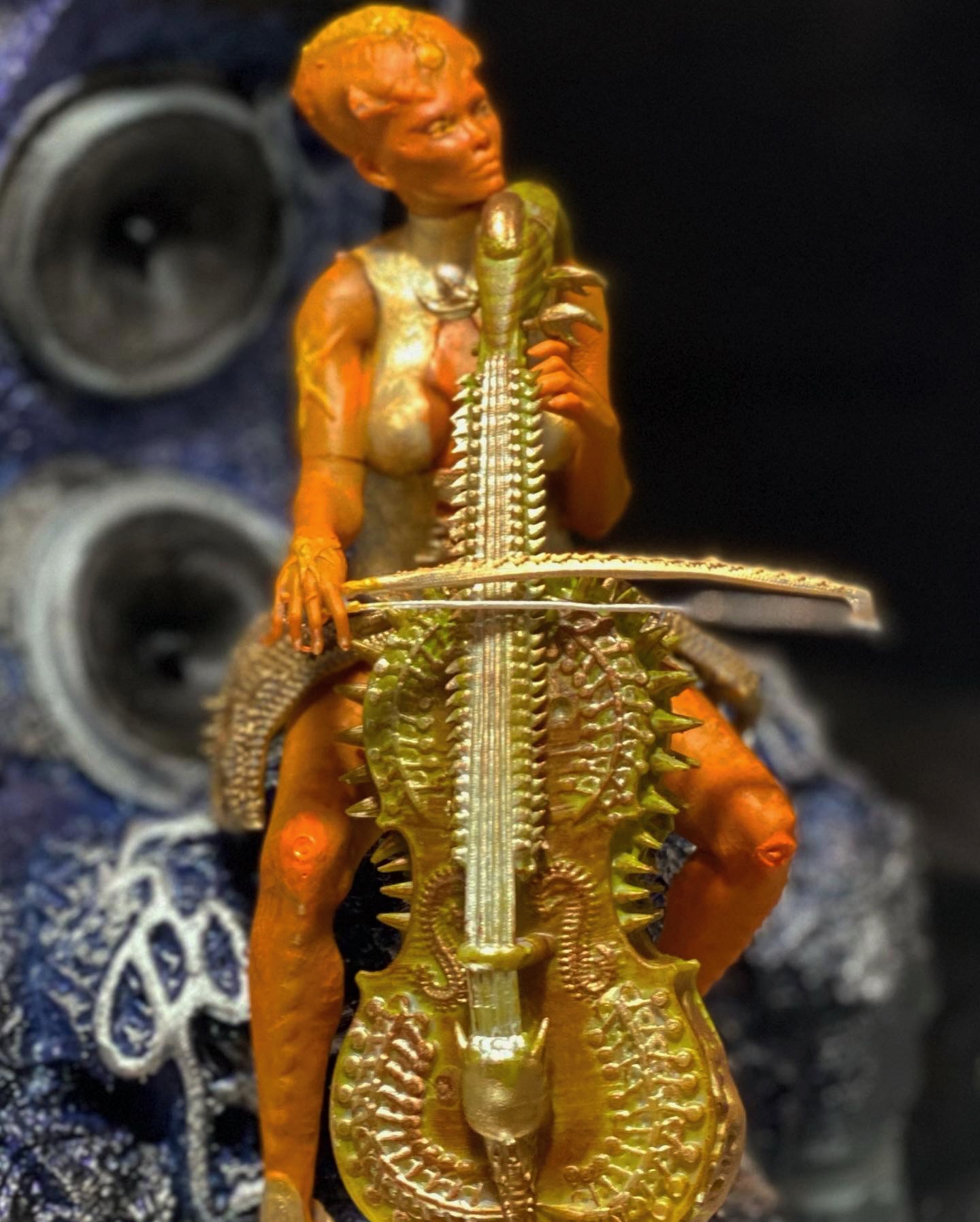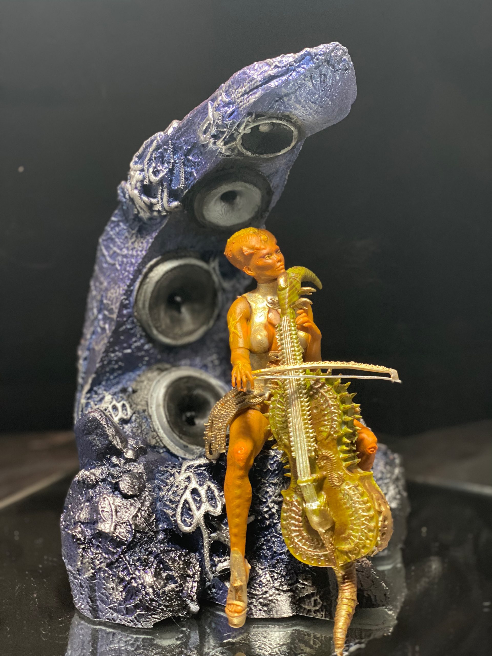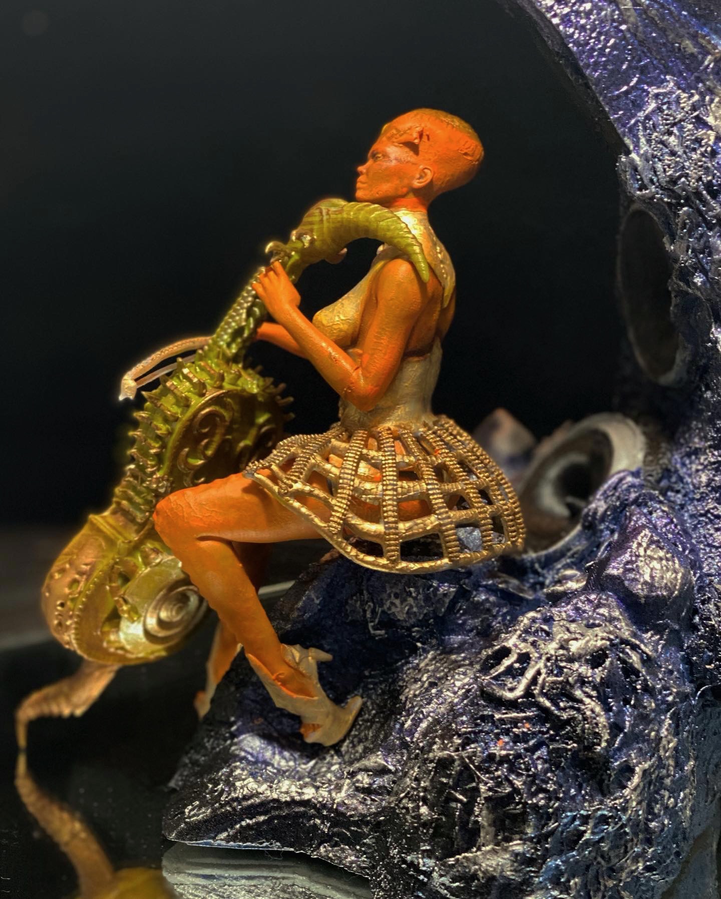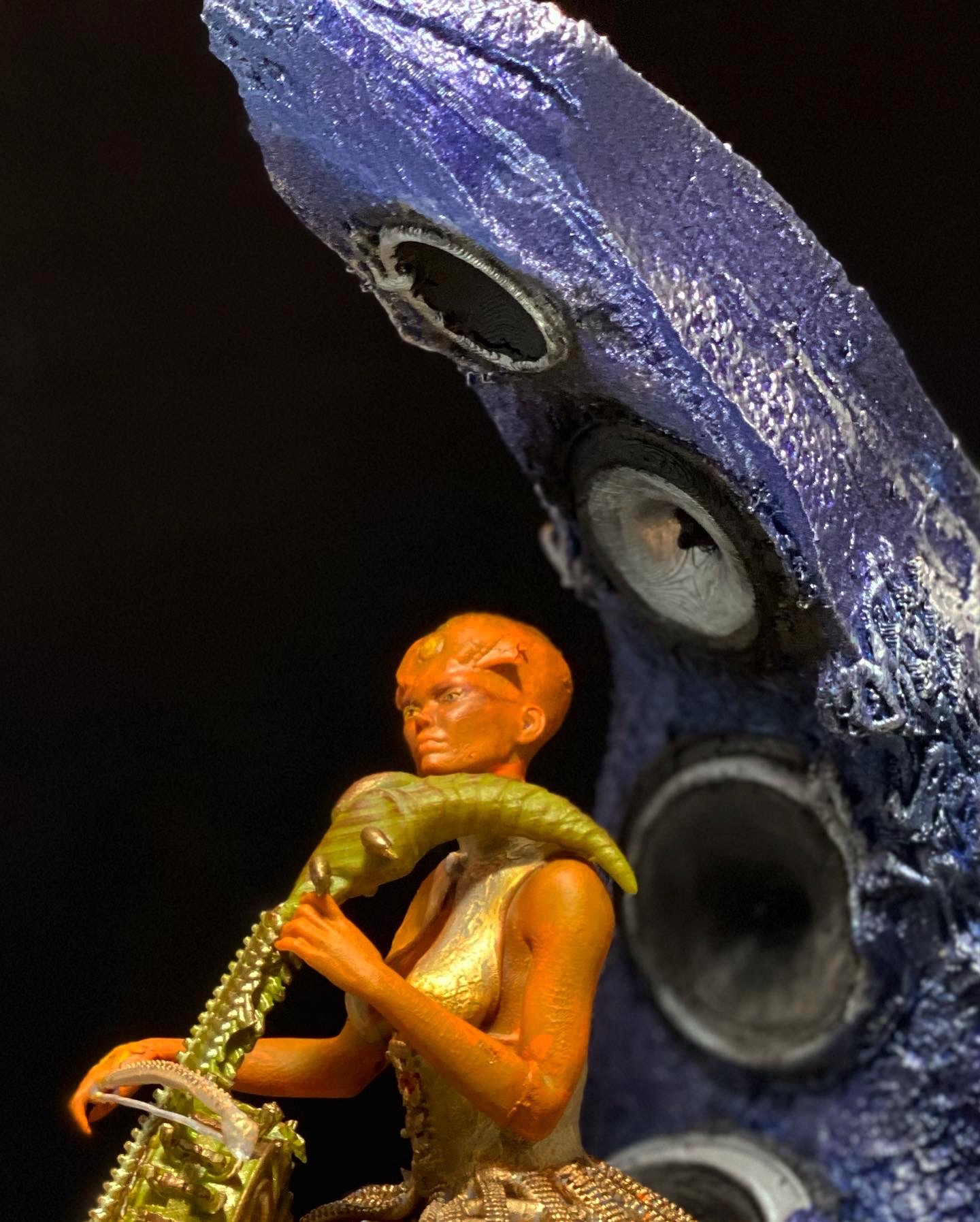 This is another sculpt by my friend Walades, where an alien plays a stringed instrument, while sitting among stereophonic rocks. What can I say? The man has an imagination. Like others, I took the final image and superimposed it into an appropriate landscape.