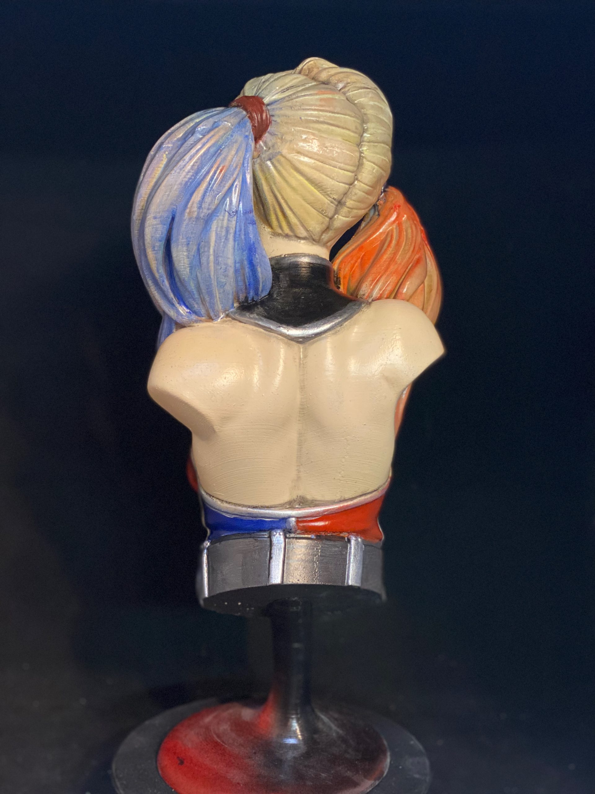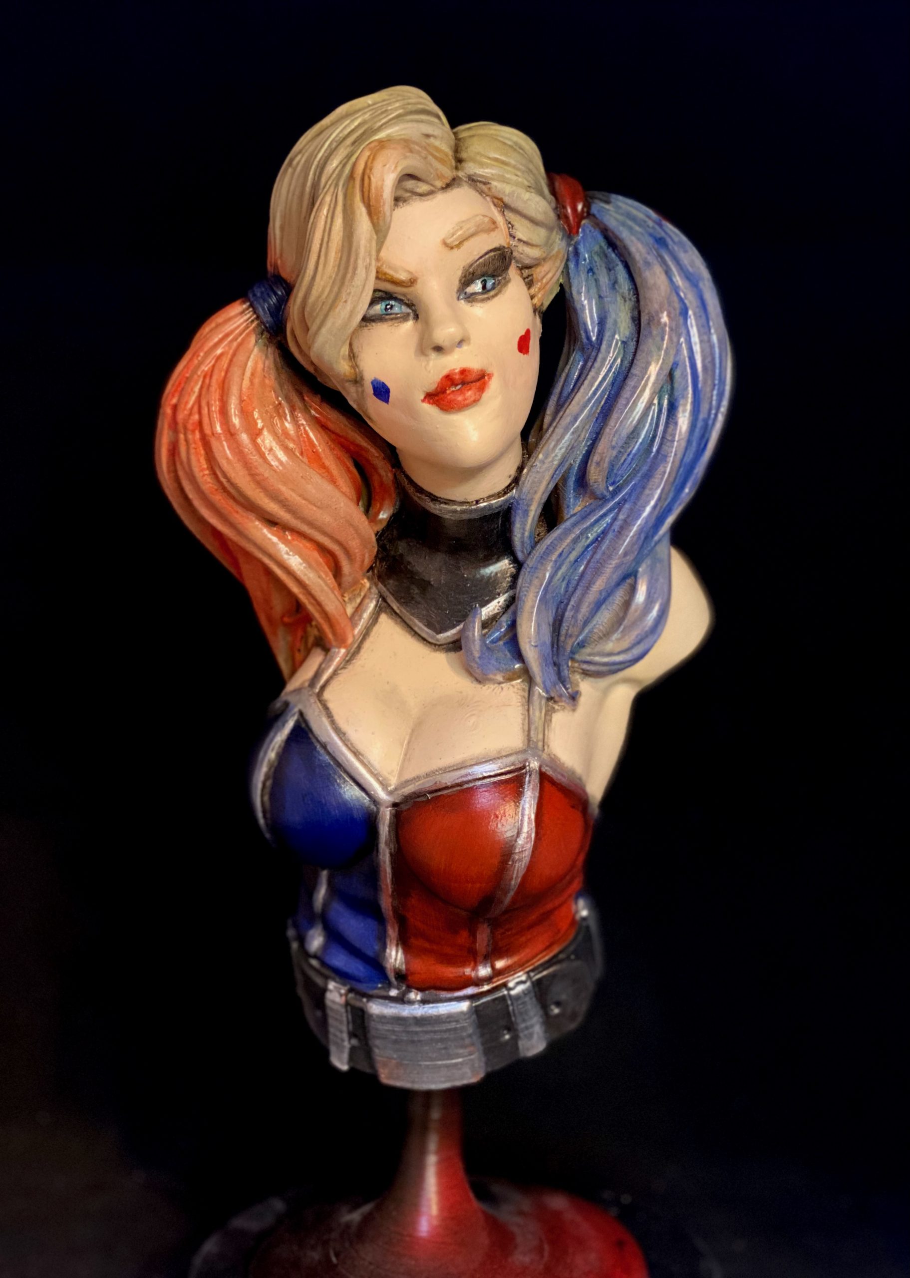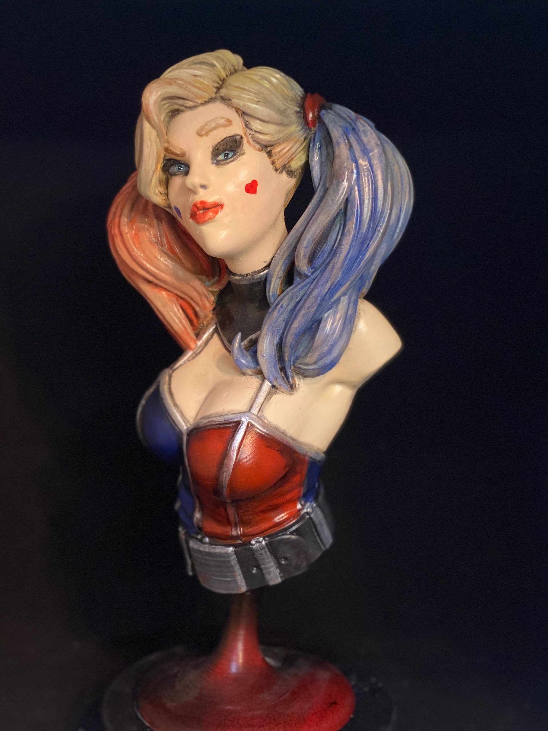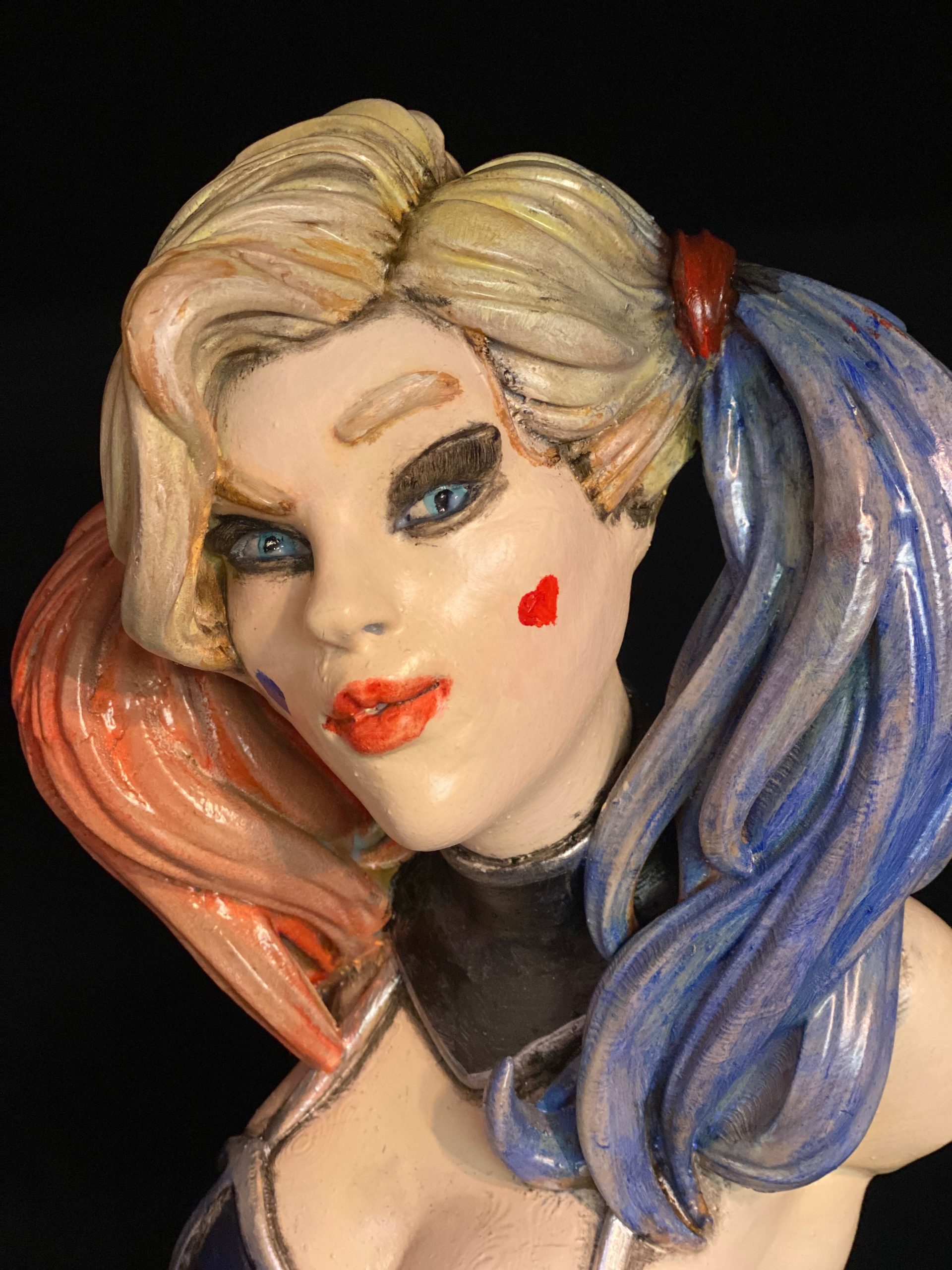 This is a beautiful digital sculpt by Eastman3d of one of our favorite villains, Harley Quinn. This bust stands over 14 inches tall. One of my favorite parts of painting Harley, is her hair. It is a constant reminder that the more layers of color you can add, the more realistic it becomes.