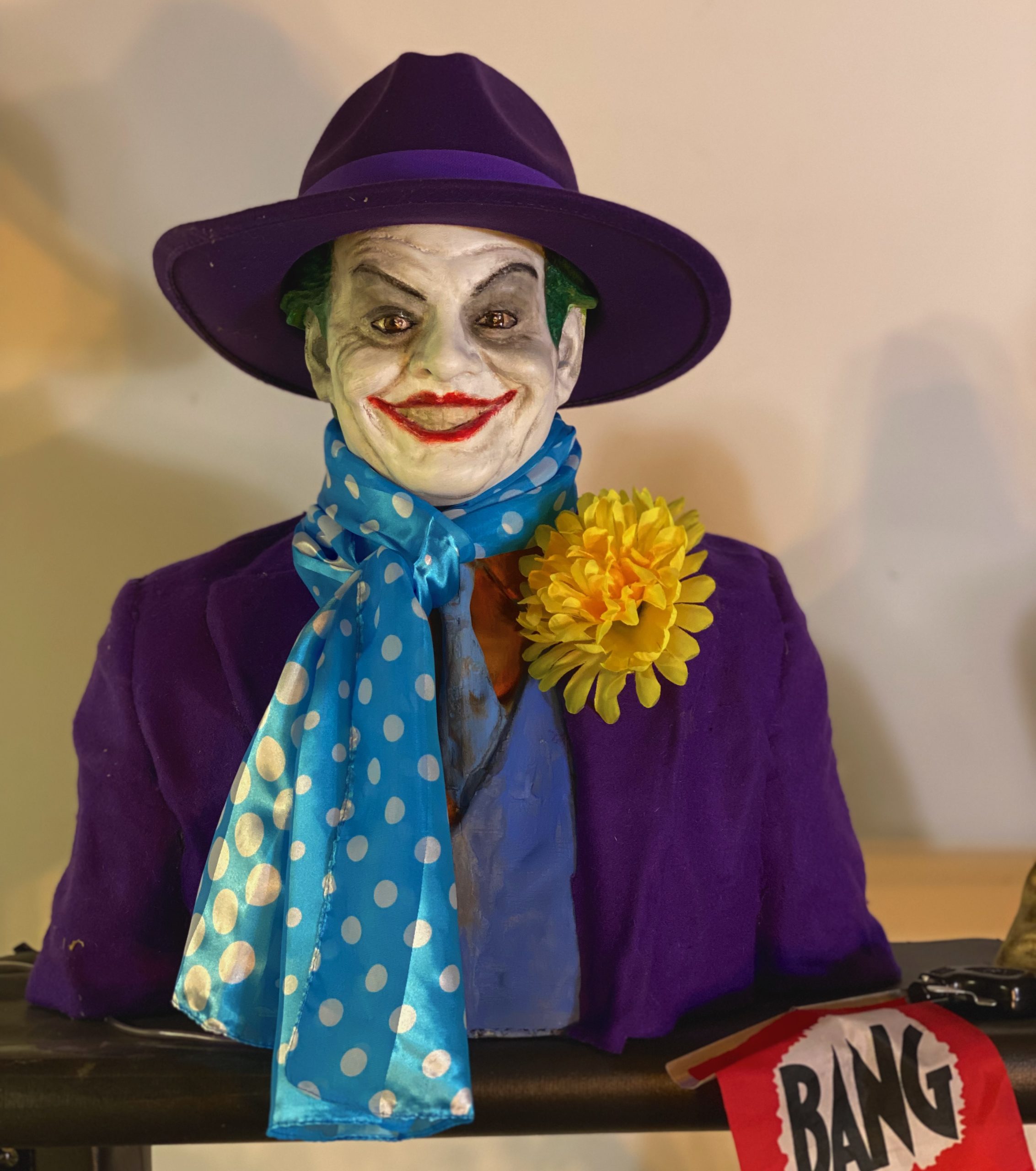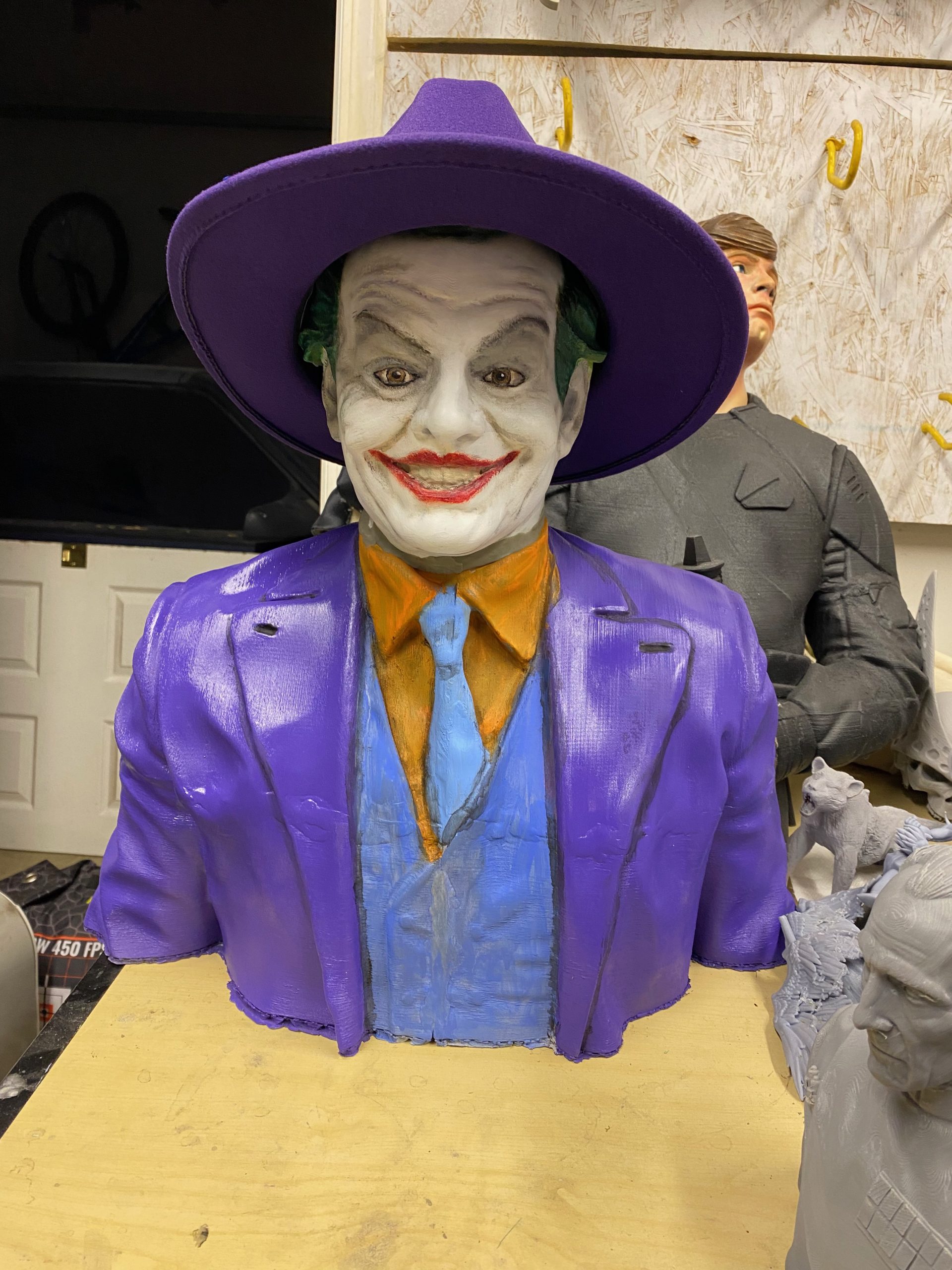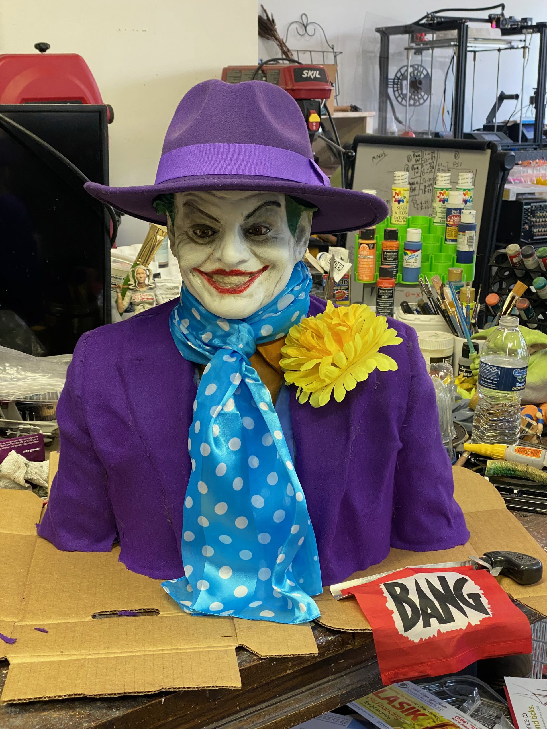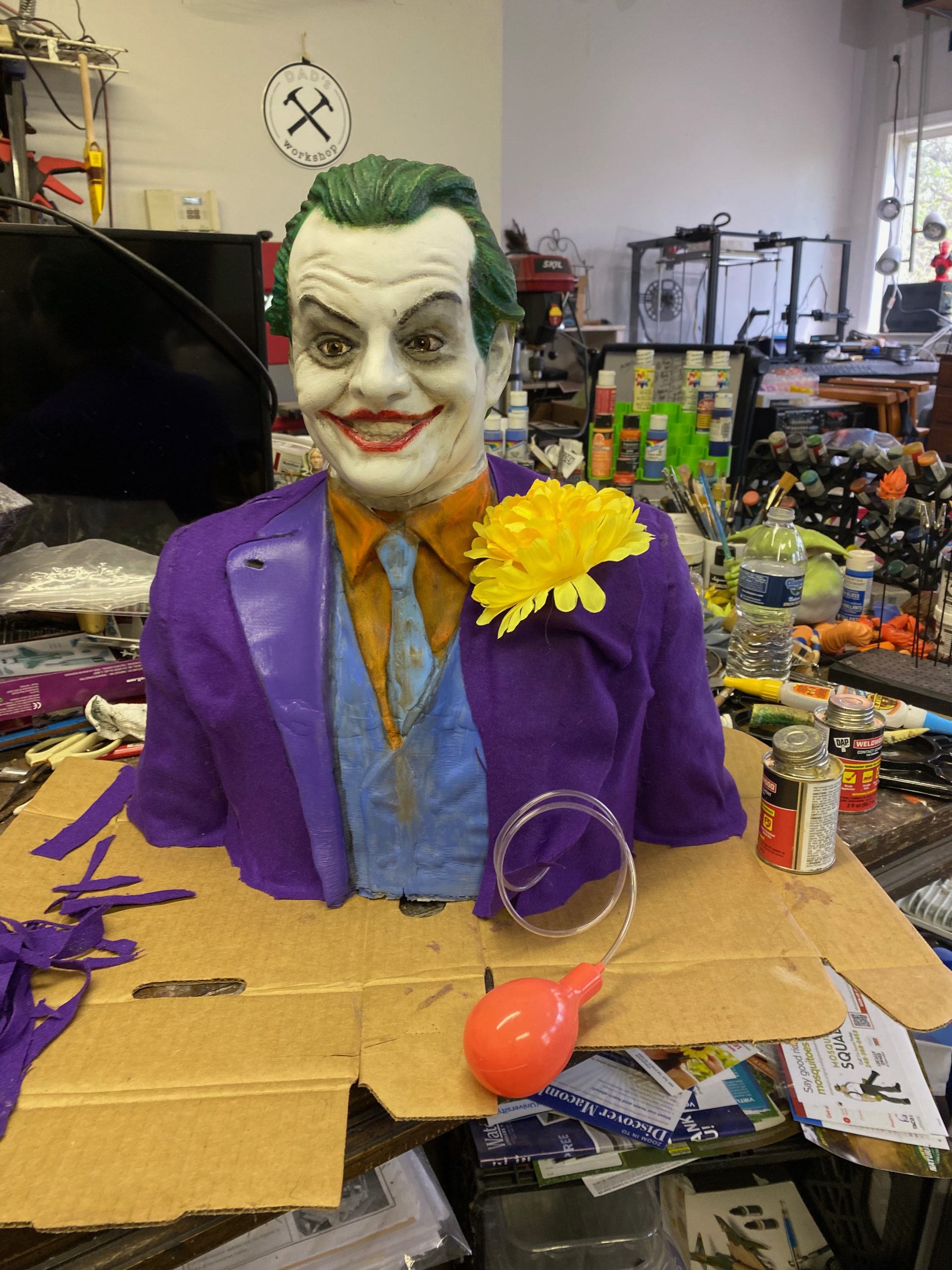 This is one of my favorite lifesize busts, which is modeled after Jack Nicholson as The Joker. It took a few months to print and assemble all of the pieces, then I patterned a felt jacket and bought him a hat and prop squirting flower and “bang” gun.