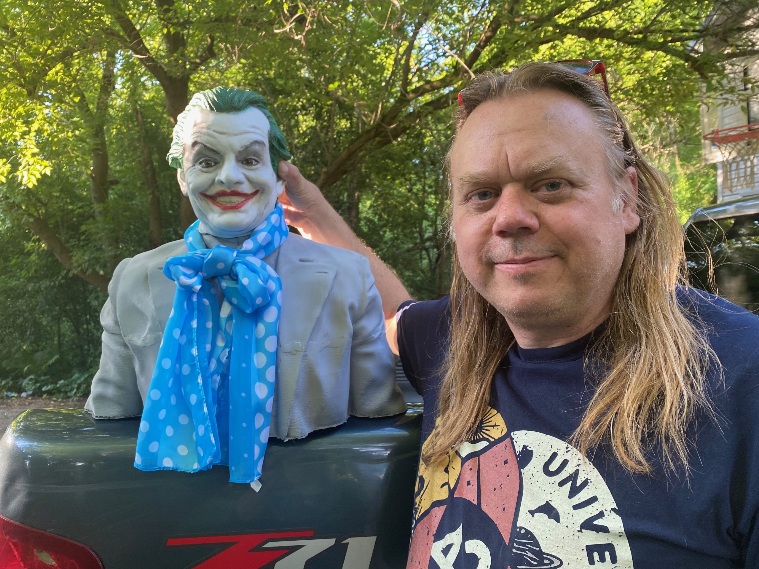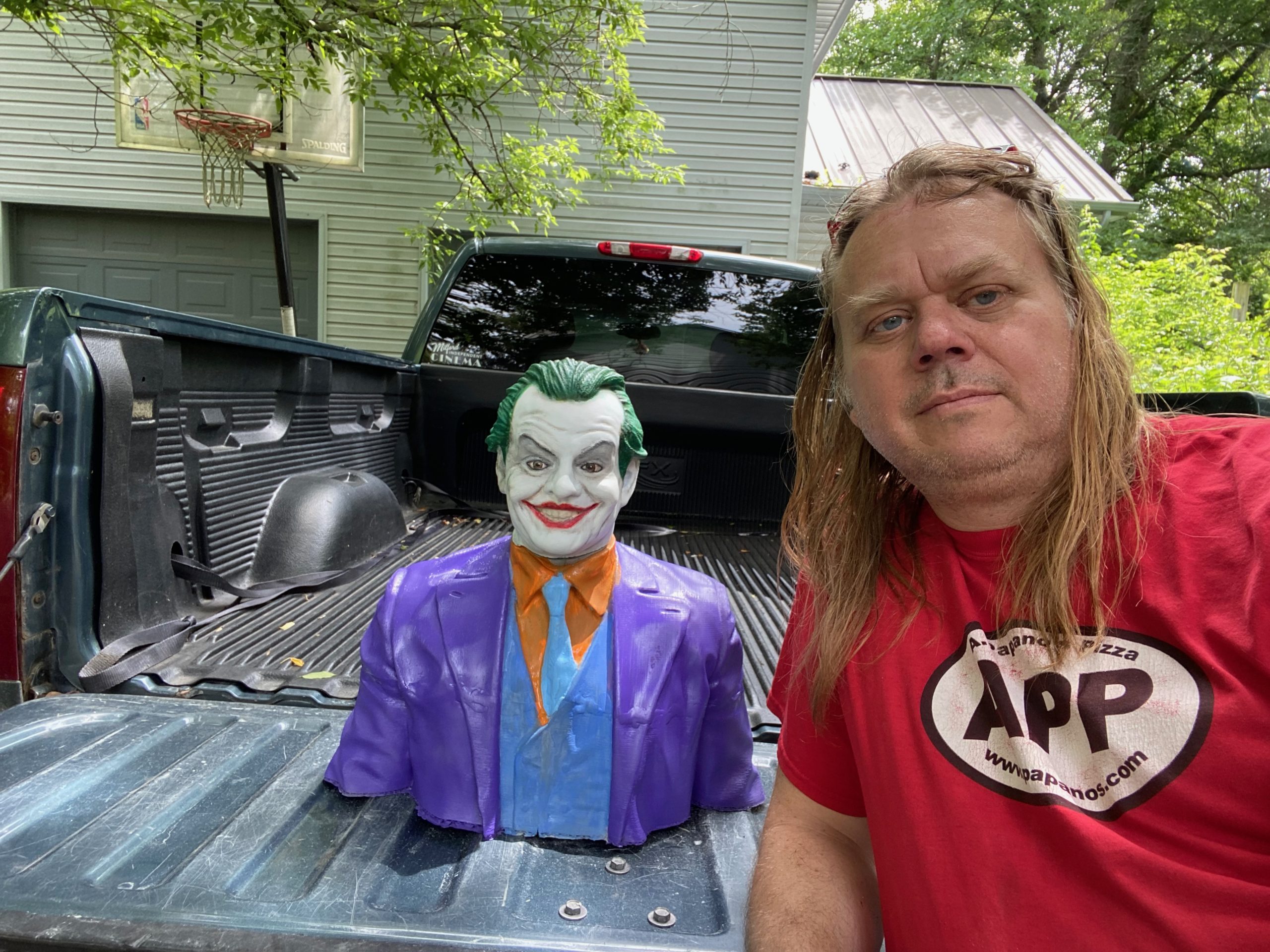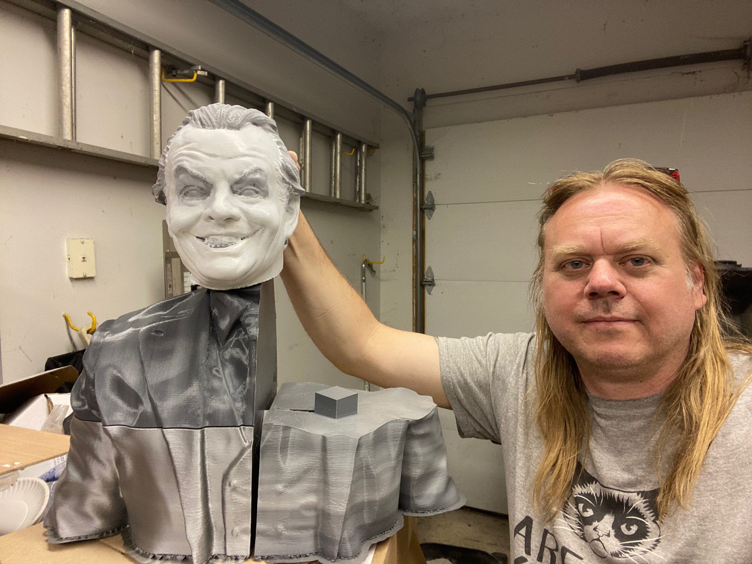 This is one of my favorite lifesize busts, which is modeled after Jack Nicholson as The Joker. It took a few months to print and assemble all of the pieces, then I patterned a felt jacket and bought him a hat and prop squirting flower and “bang” gun.