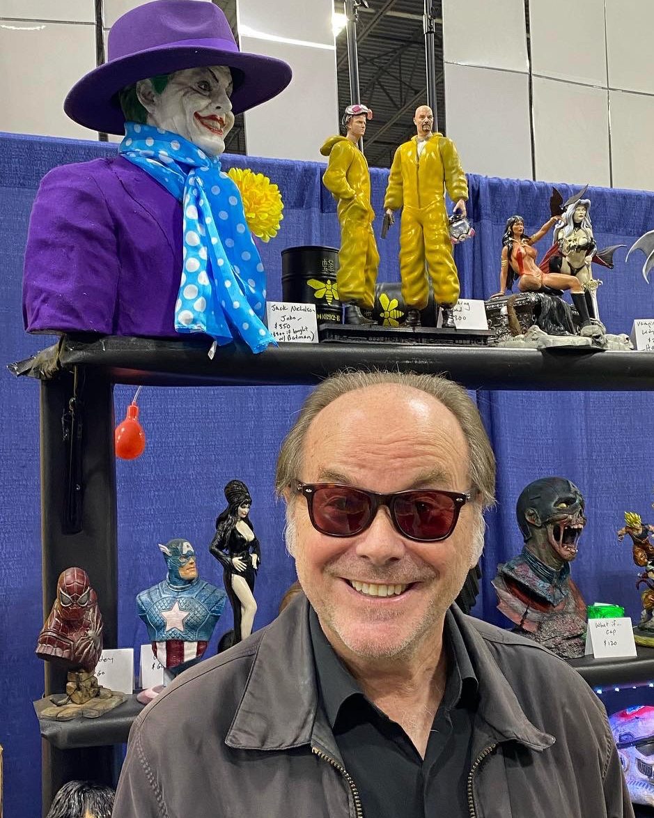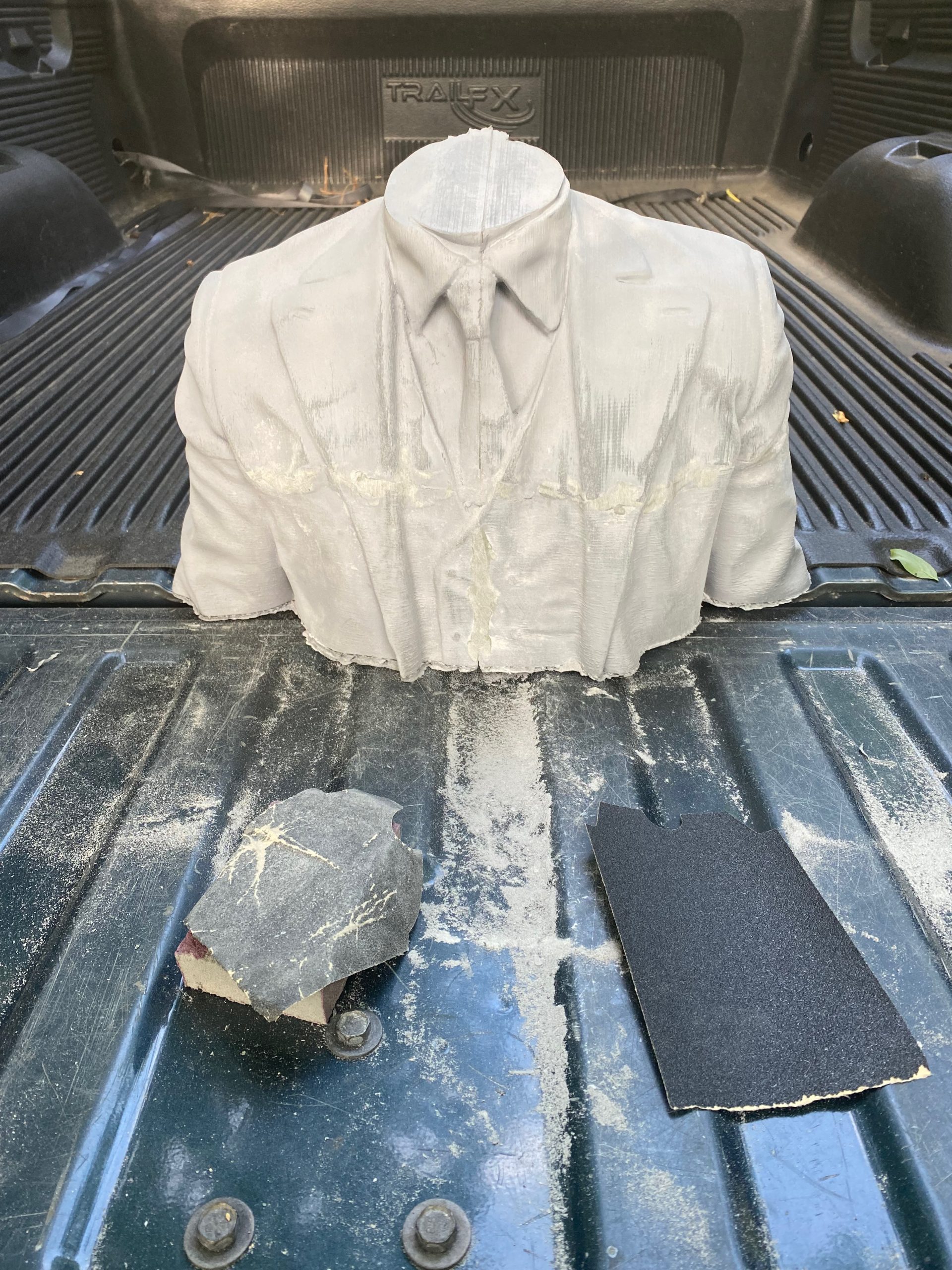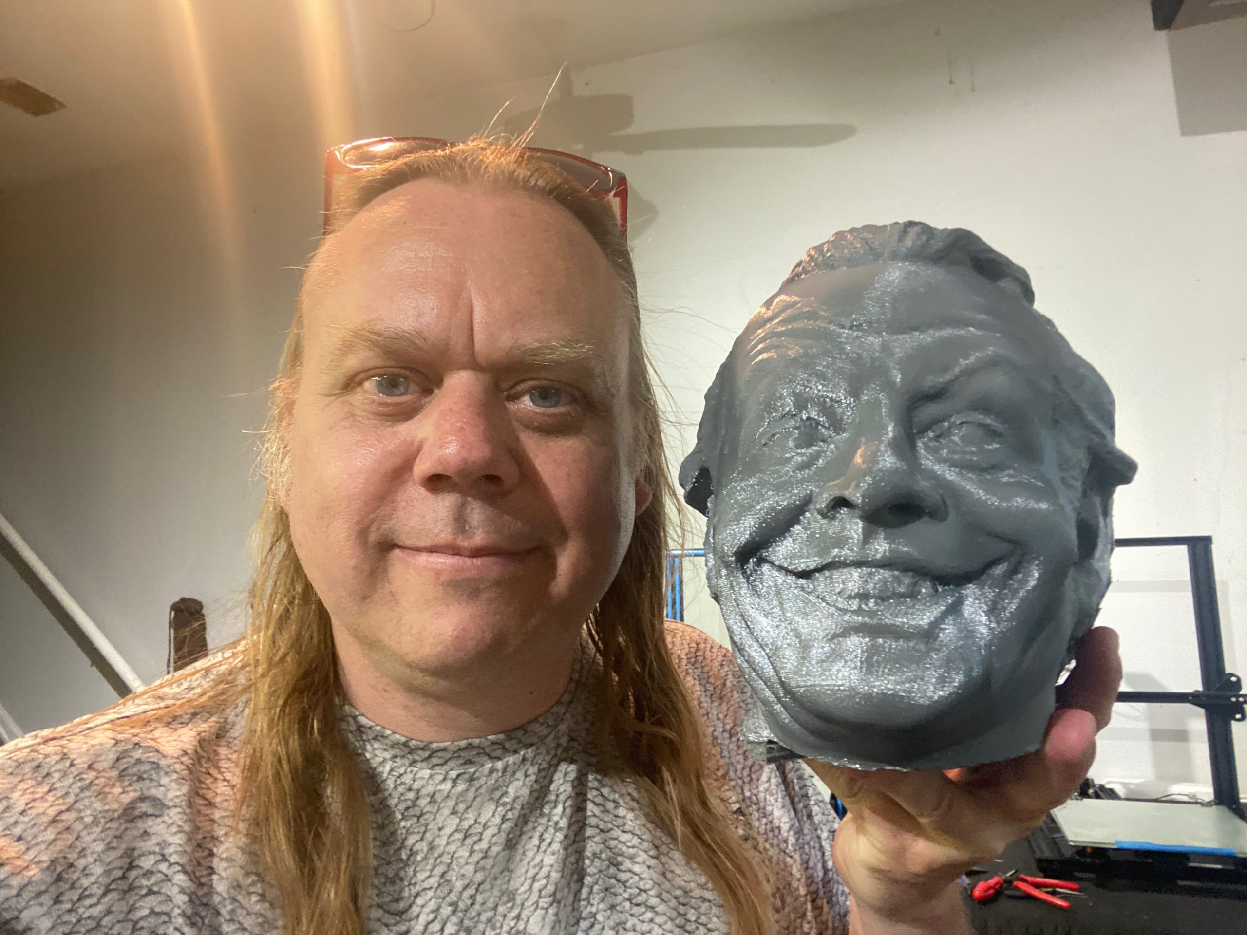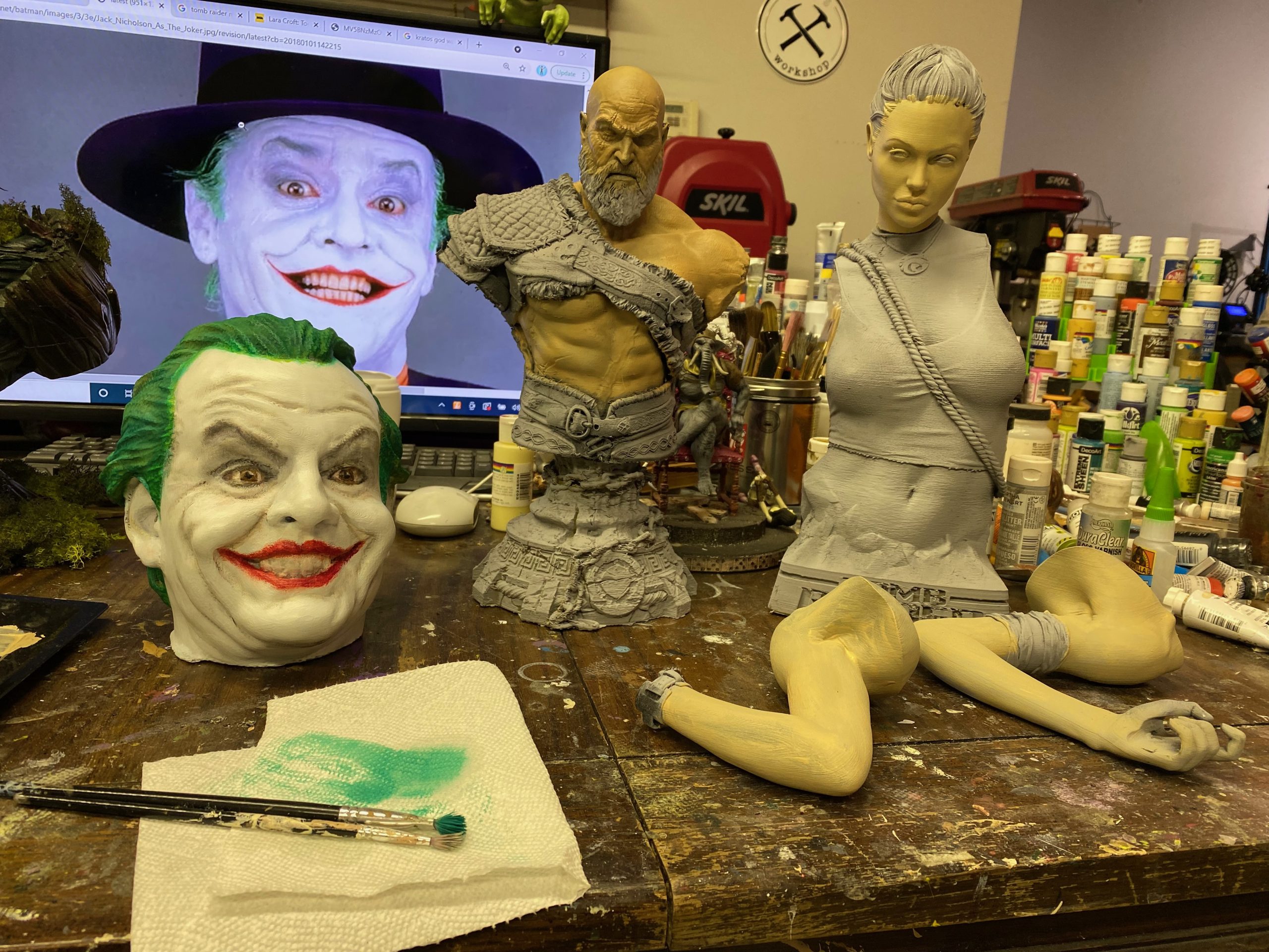 This is one of my favorite lifesize busts, which is modeled after Jack Nicholson as The Joker. It took a few months to print and assemble all of the pieces, then I patterned a felt jacket and bought him a hat and prop squirting flower and “bang” gun.