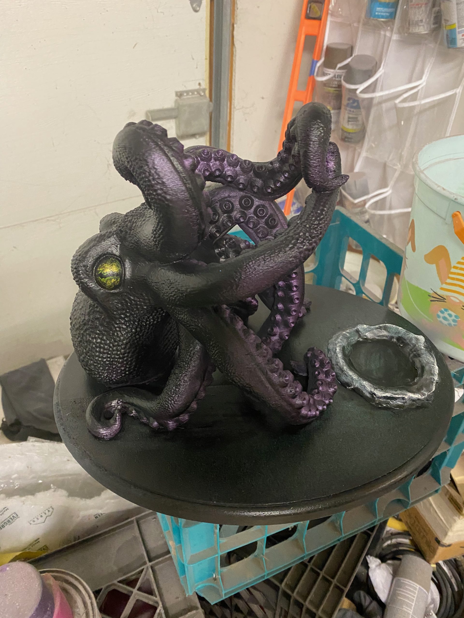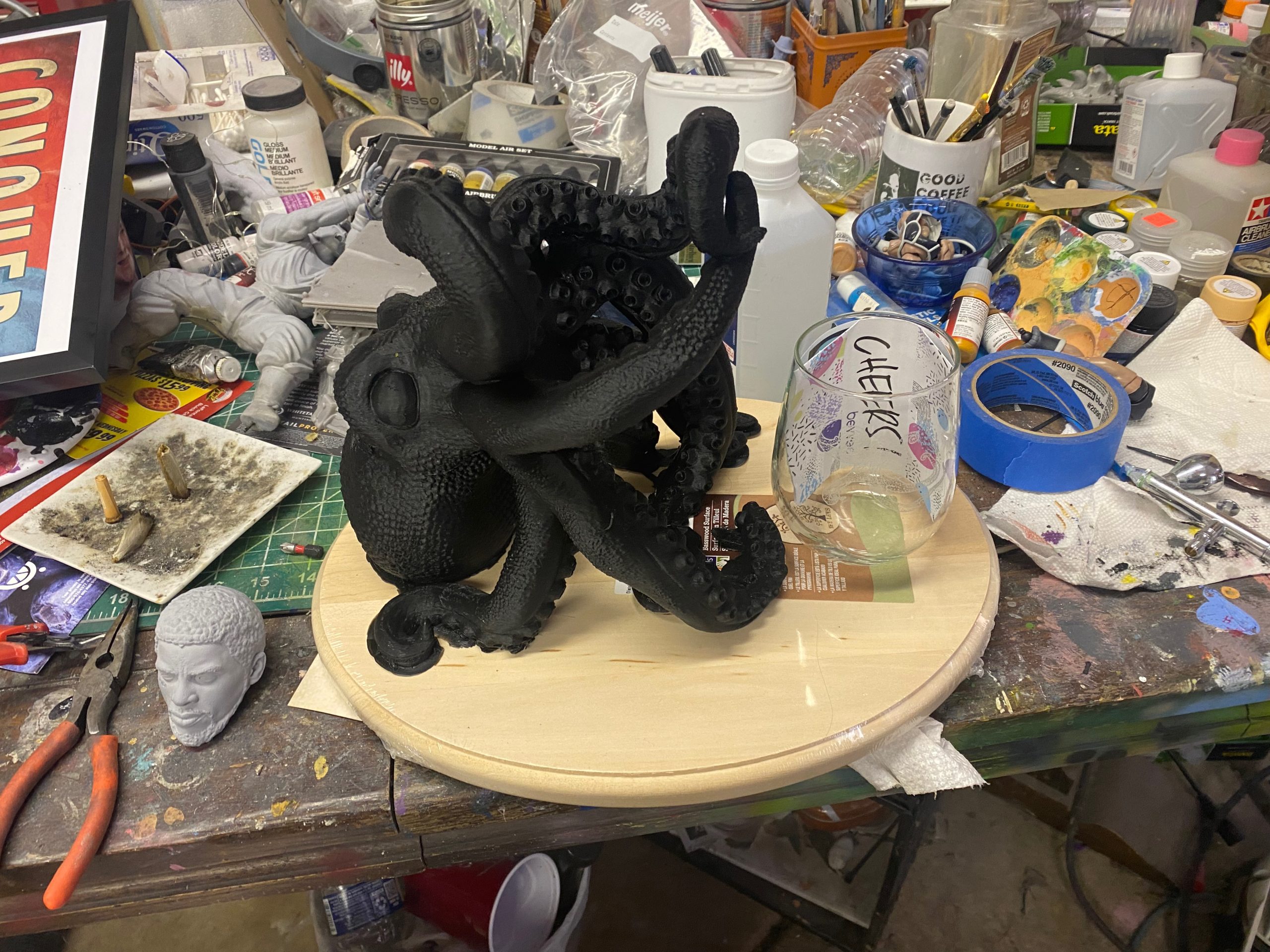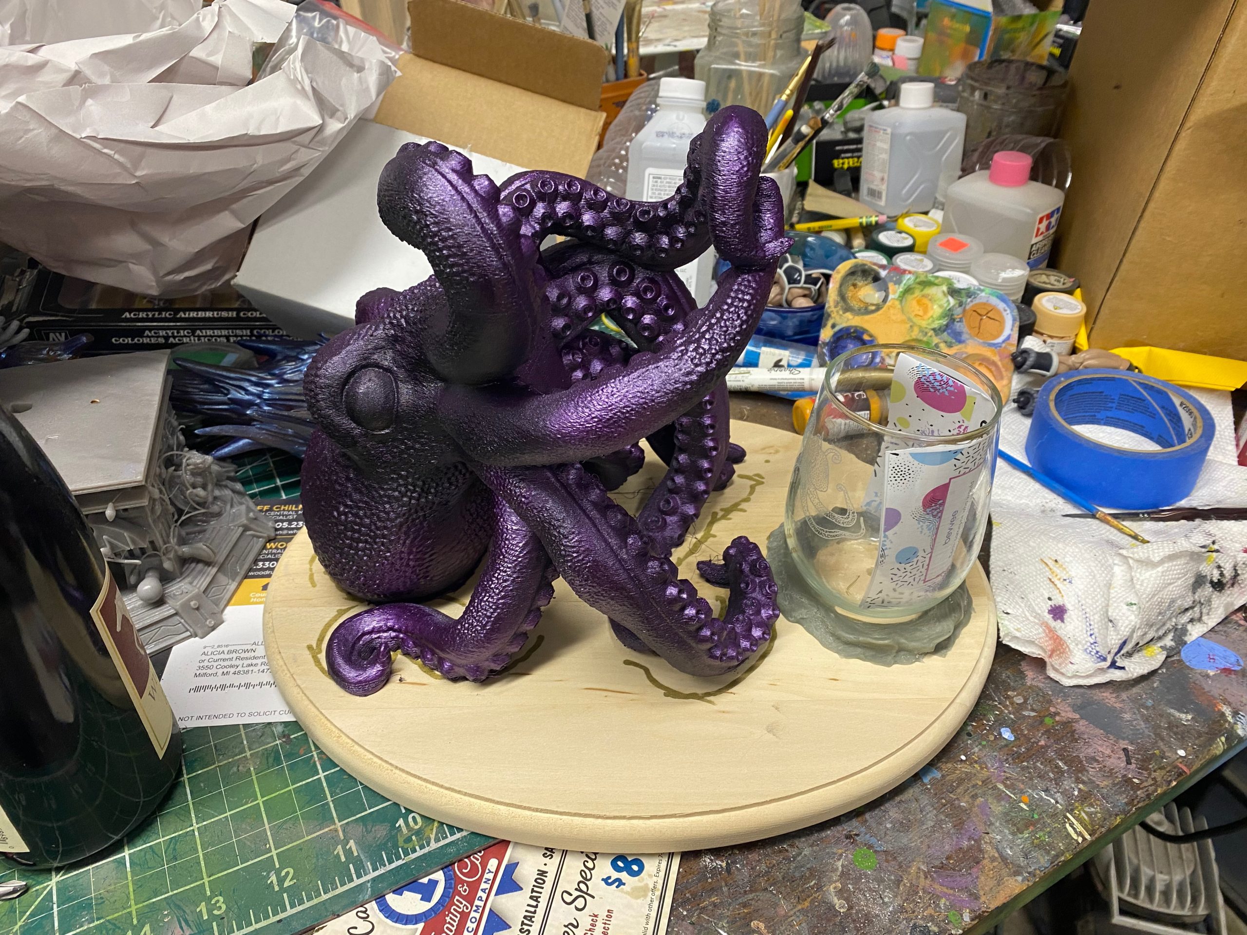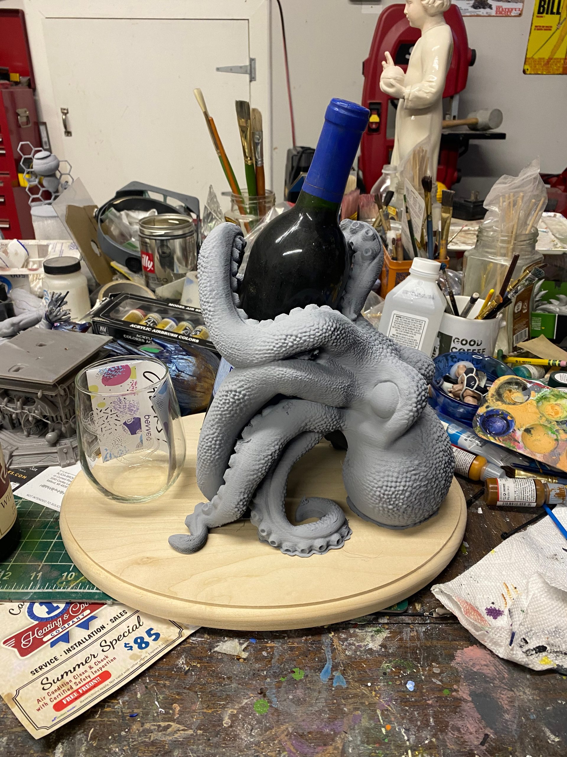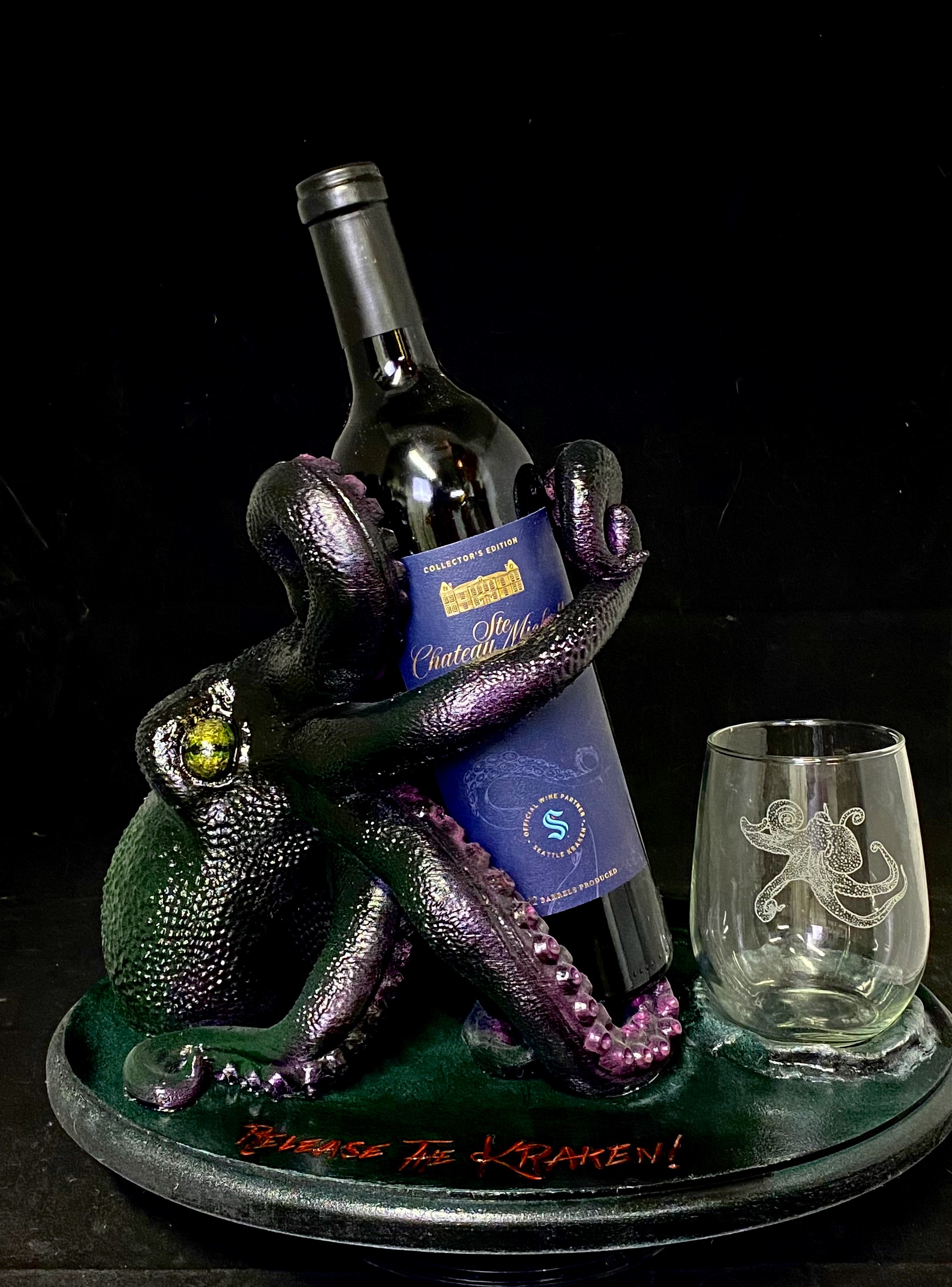 This is made from a digital sculpt of “Bordeuax the Octopus”, then handpainted and given a custom painted wood plaque with “Release the Kraken” engraved. Addition a bottle of “Kraken Reserve” and a laser engraved Octopus wine glass.
