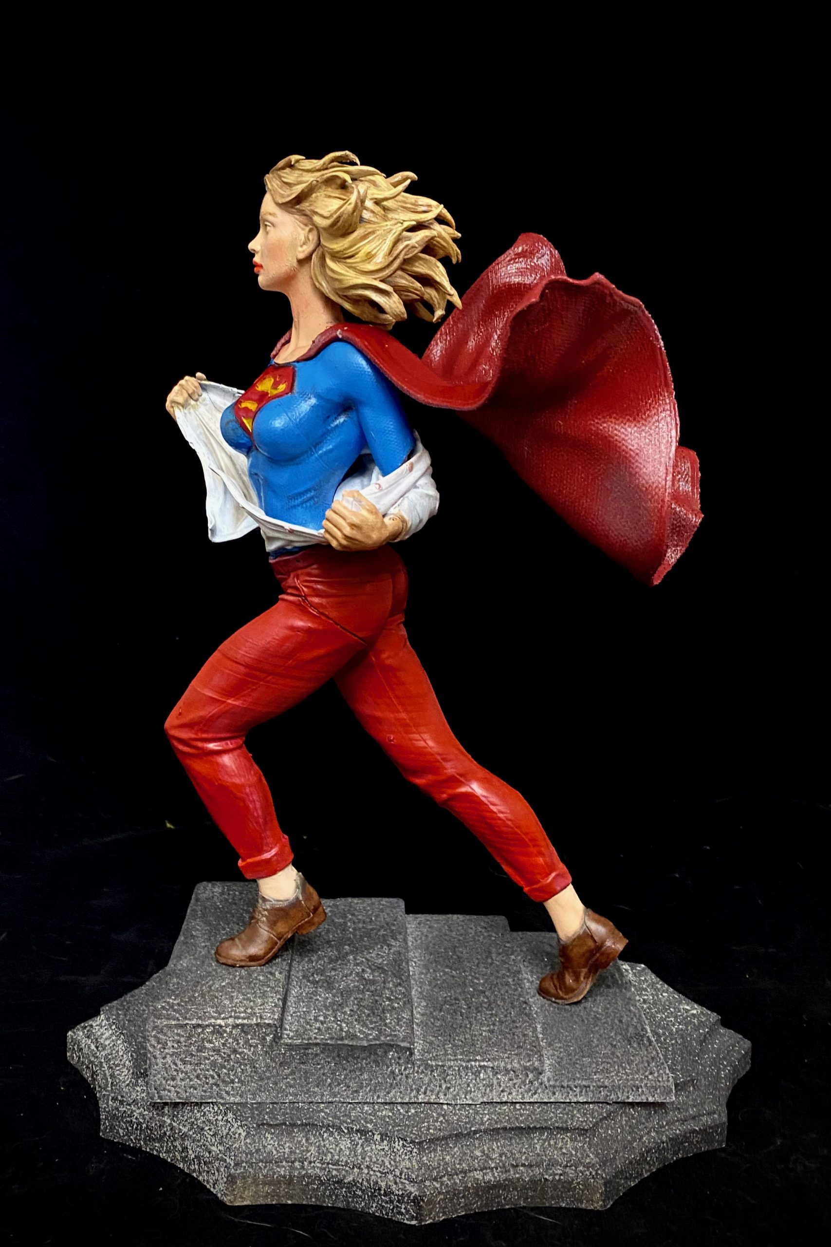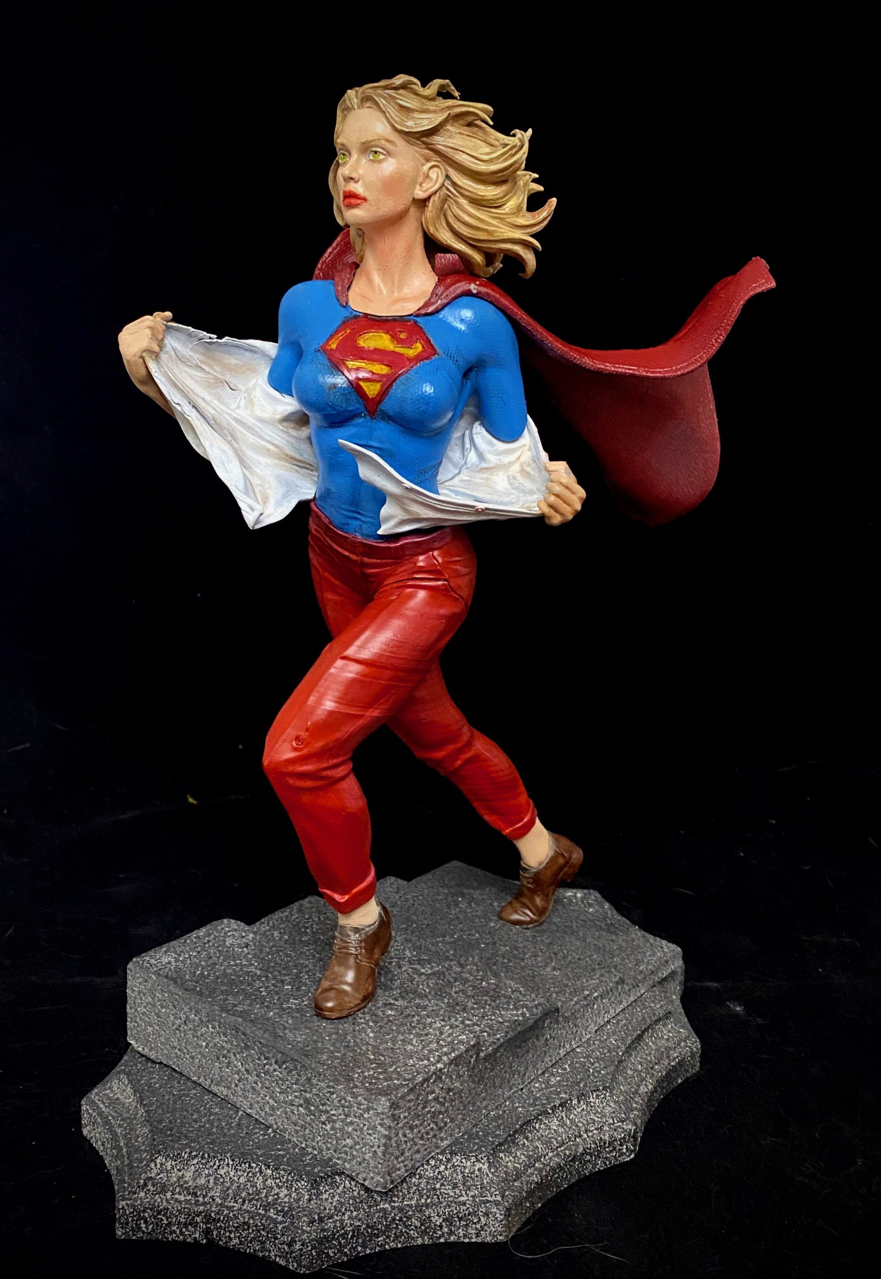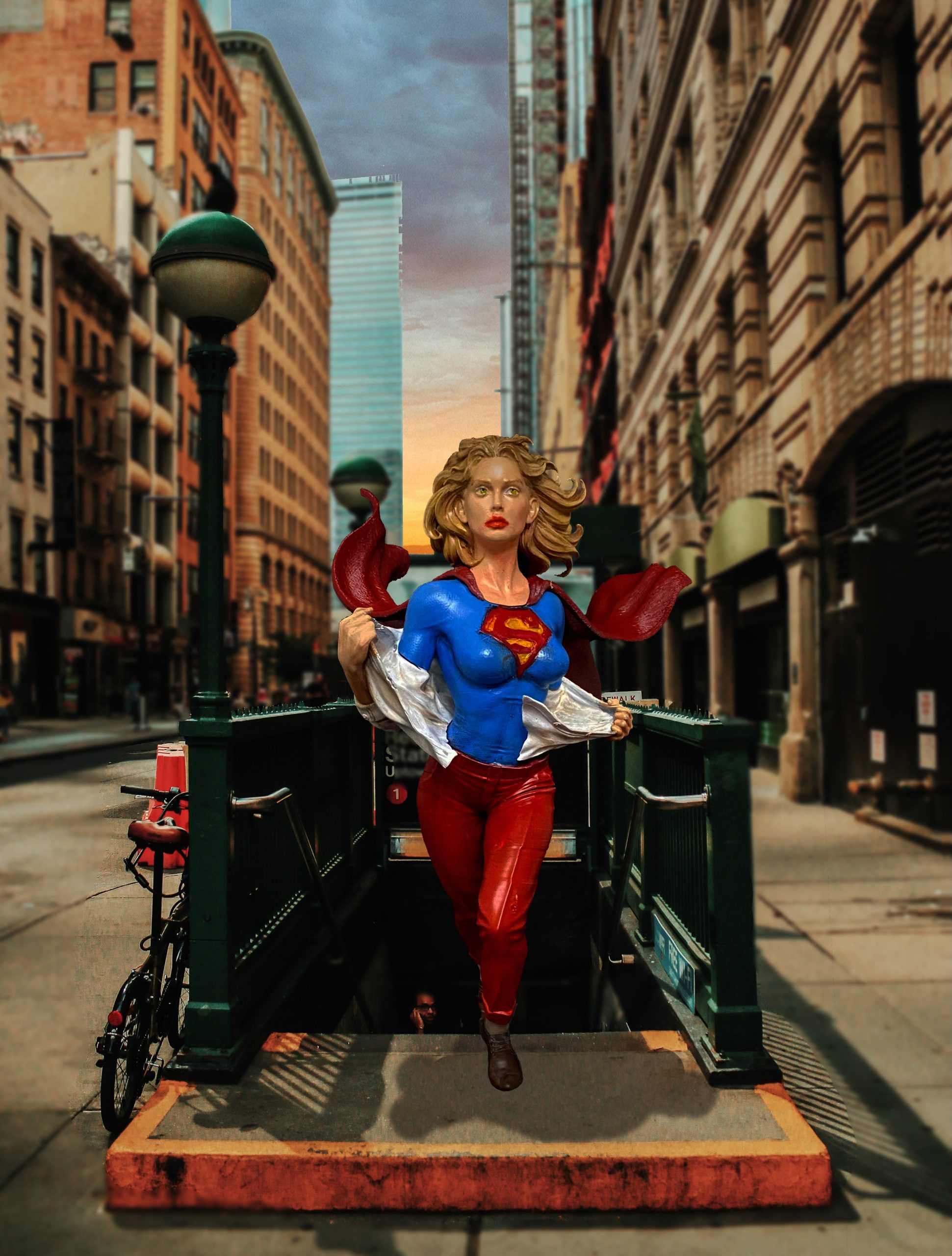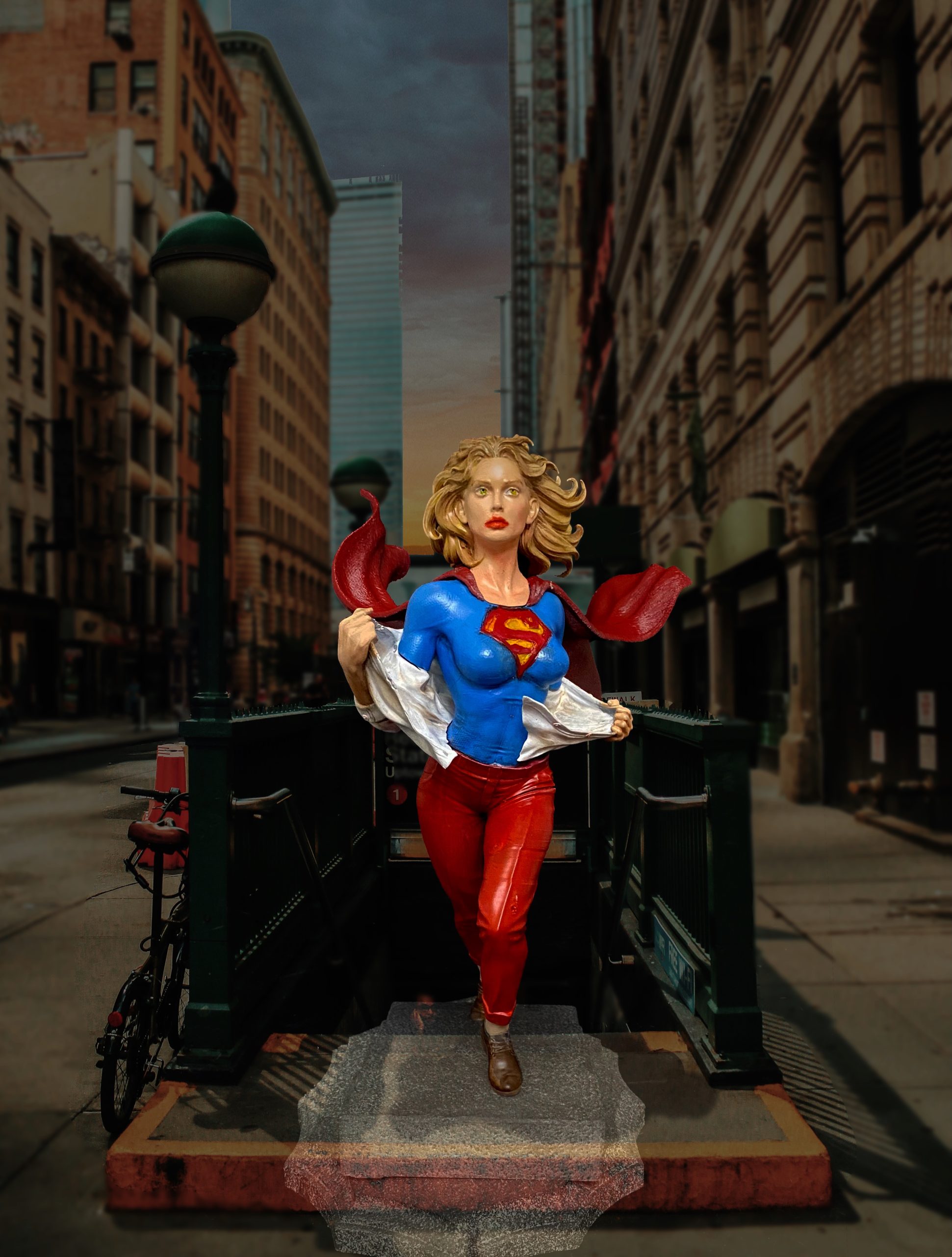 This is one of my favorite Stepanov sculpts, showing Supergirl as she is running up a flight up steps and while switching into her costume. This is one of the pieces that I turned into an NFT, back when those were a thing. I did a standard photoshoot with the piece, but then superimposed it onto a cityscape with her coming up from the subway, then applied different filters to make it appear that it was from an actual comic book. I liked this one so much. it has made it onto some of my merch.