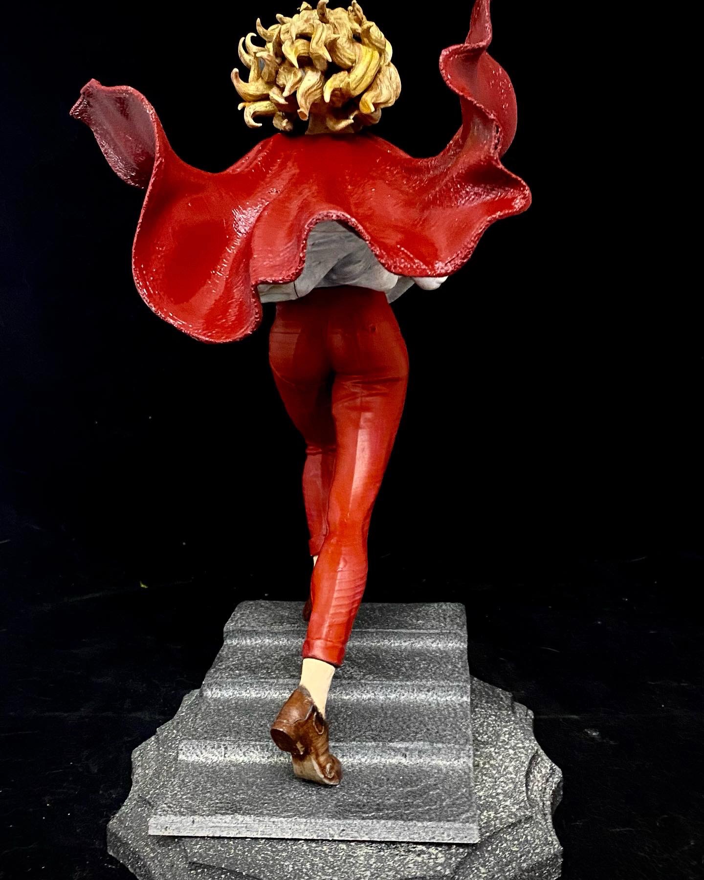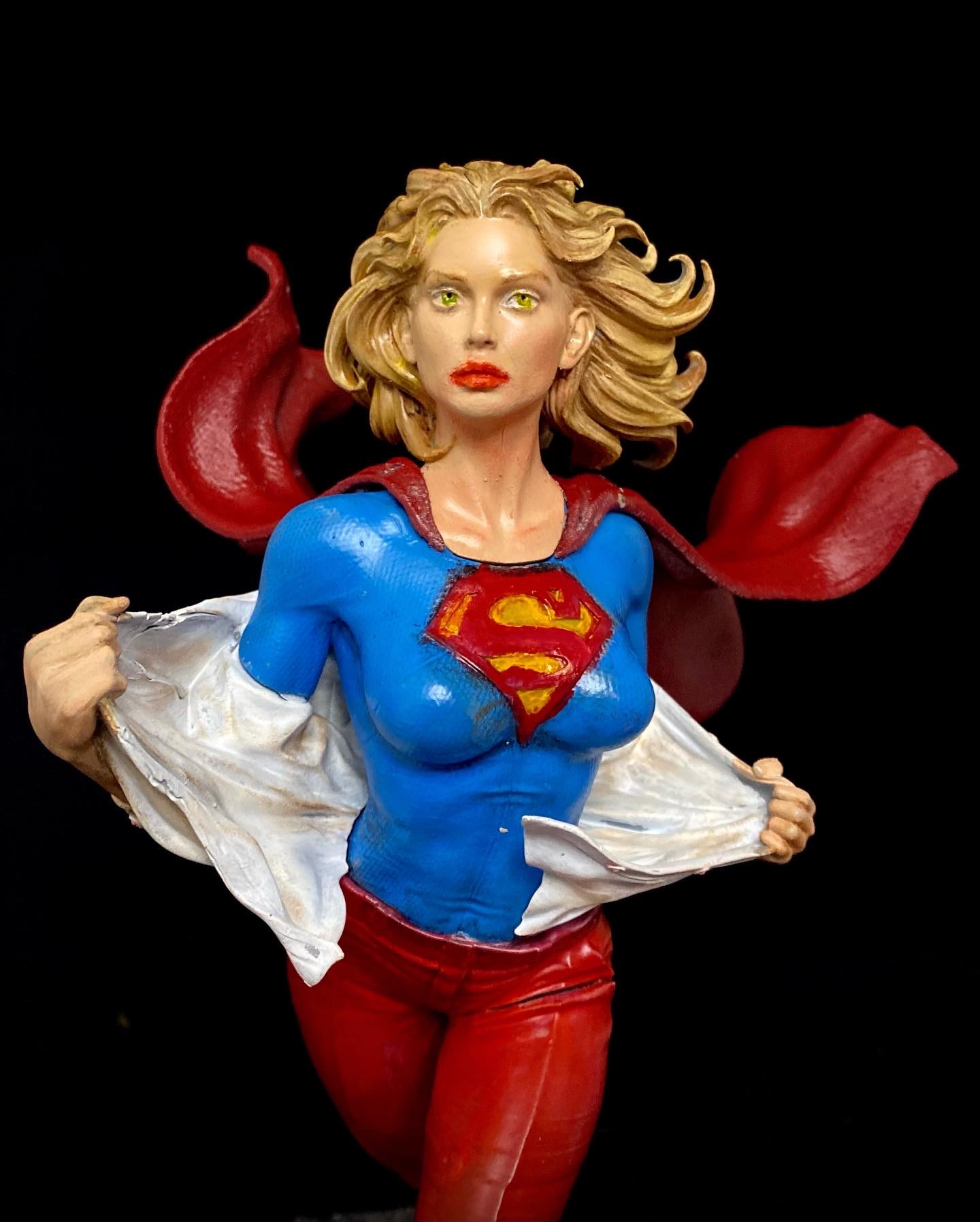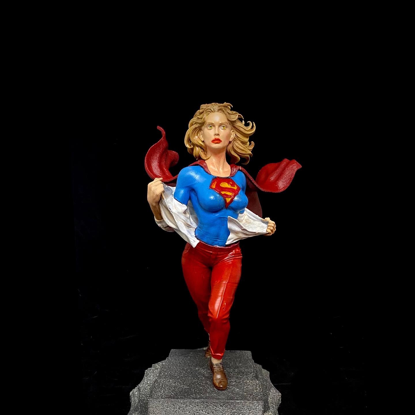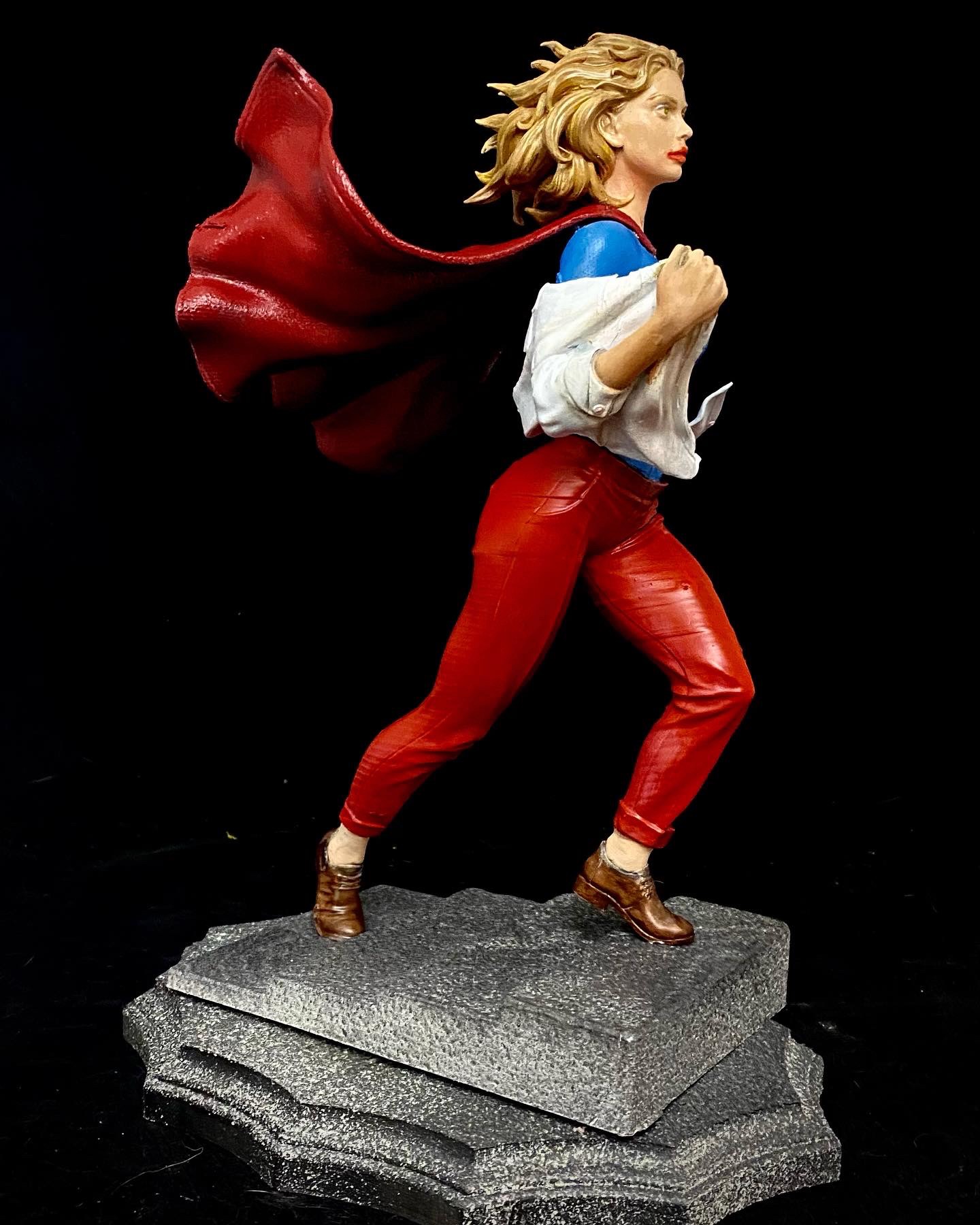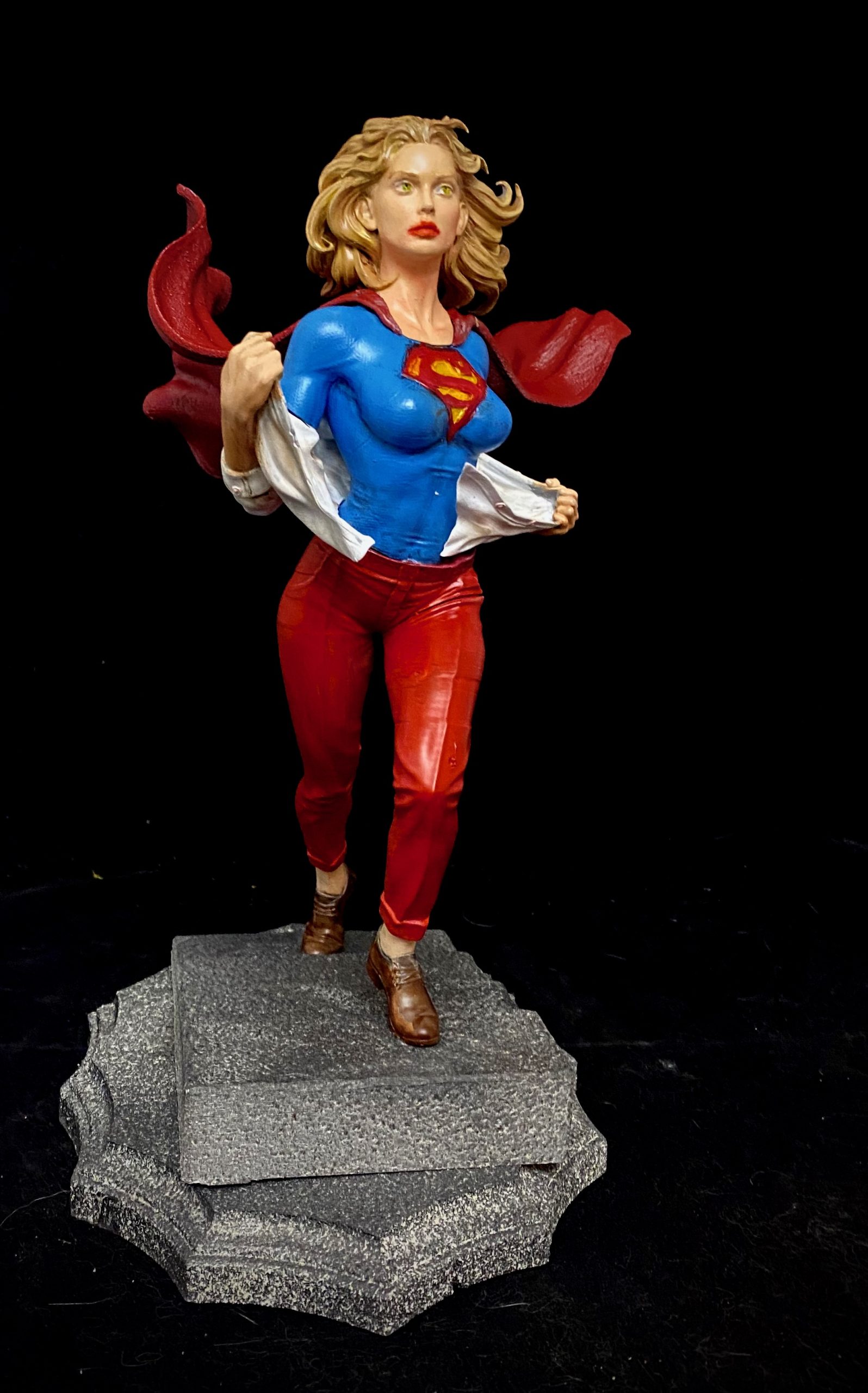 This is one of my favorite Stepanov sculpts, showing Supergirl as she is running up a flight up steps and while switching into her costume. This is one of the pieces that I turned into an NFT, back when those were a thing. I did a standard photoshoot with the piece, but then superimposed it onto a cityscape with her coming up from the subway, then applied different filters to make it appear that it was from an actual comic book. I liked this one so much. it has made it onto some of my merch.